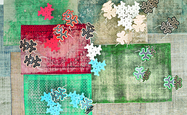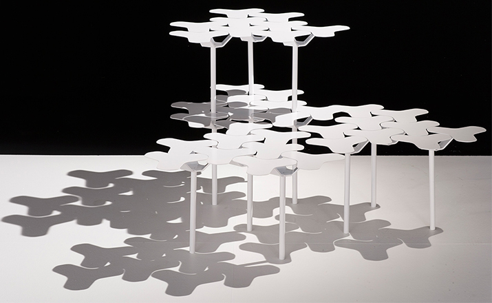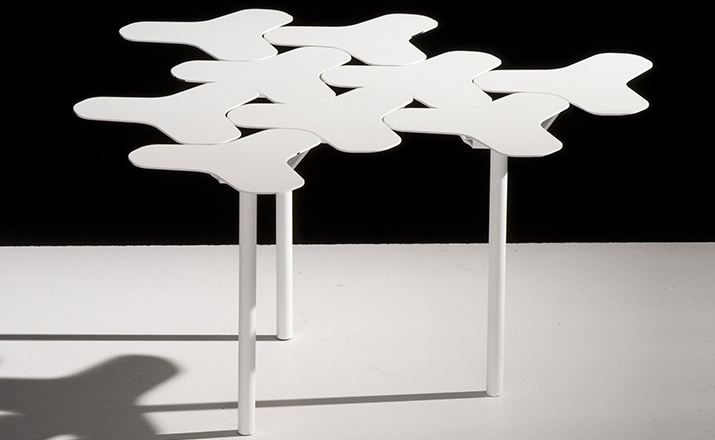 Nanook系列是由瑞士设计师Philippe Bestenheider于今年为意大利Moroso设计,并在今年的米兰家具展上进行了展出。Nanook系列包括一把凳子、一把椅子和一张角桌。该系列作品表现了平面到三维世界的转变。凳子和椅子的六边形网状结构的灵感来自于分子几何学。Nanook系列以铸模成形的合成材料作为基本框架,而其座椅部分的表面织物上则进行了打褶和印刷处理,使其看上去有动物皮肤的紧致感。如同因纽特人用动物皮毛取暖一样,作者试图用这种方式唤起人们深处的记忆,而他的创作灵感也源自遥远的北极。Nanook系列的桌子和凳子看上去更像是雕塑而不是家具。设计师源自分子结构的灵感让人们感觉该系列更加独特,尤其是多张桌子并排放置时,产生的效果就像一片静静矗立的风车。而有靠背的椅子则更像是一片被折叠的五彩雪花,令人犹如置身于神秘的北极。