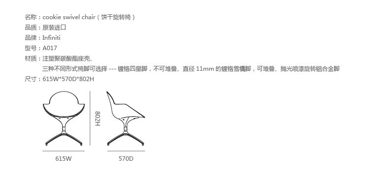 Cookie是工作室Zetass为Infiniti公司设计的椅凳系列,包括Cookie Swivel Chair(饼干旋转椅)及Cookie Chair(饼干椅),光亮、色彩活泼、别具风格并充满活力,是具有独特个性,充满活力的椅子。美丽充满力量的造型,给人以无限安慰感,非常适合室内使用,引领室内设计领域的新趋势。Cookie轮廓鲜明,线性流畅。注塑聚碳酸酯座壳,有红白黑等颜色可选,同时有三种不同形式椅脚可选择---镀铬四星脚,不可堆叠、直径11mm的镀铬雪橇脚,可堆叠、抛光喷漆旋转铝合金脚,Cookie细腻而不丢失任何其独创性和个性,创造了一种轻盈的感觉。