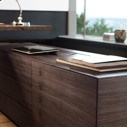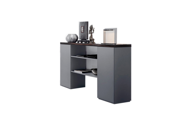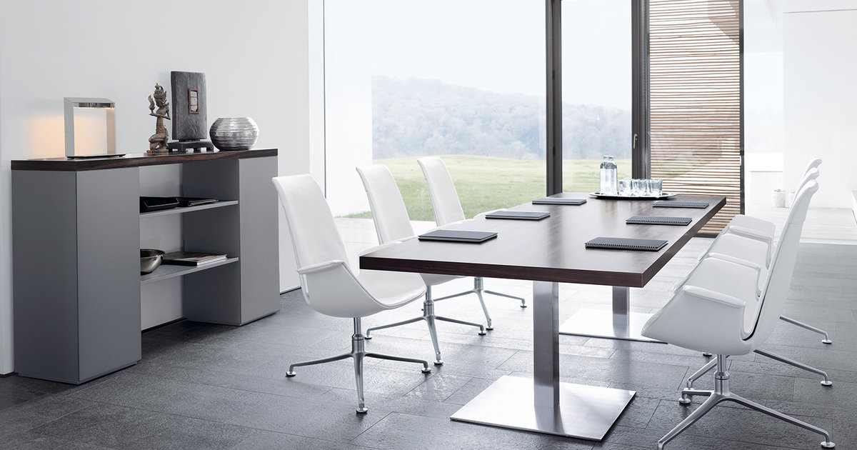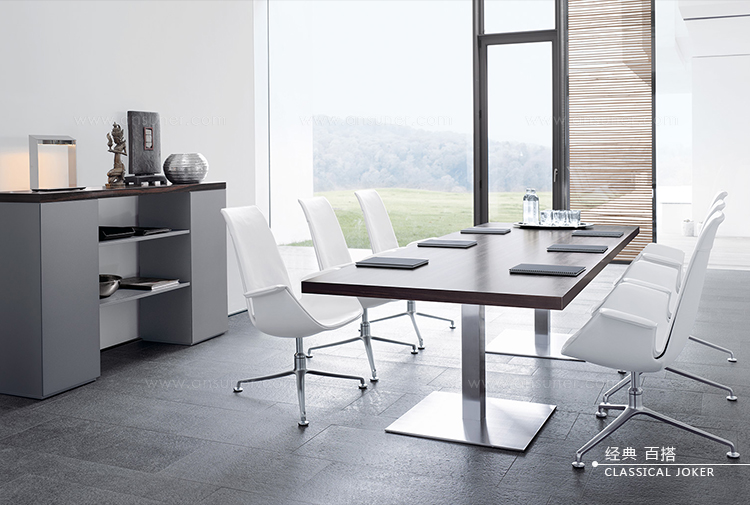 桌面和侧面,水平和垂直形成一个均匀的结构,是Headoffice Mono系列会议项目设计团队所执行的结构概念。强大的线条与精选材料的优雅相结合。由侧面和桌面所制成的直角,中间的桌子上有醒目皮革包裹的面板,如果有需要,可以使用滑动皮板来打开集成线路。电缆布线隐藏在桌面和副柜之间。