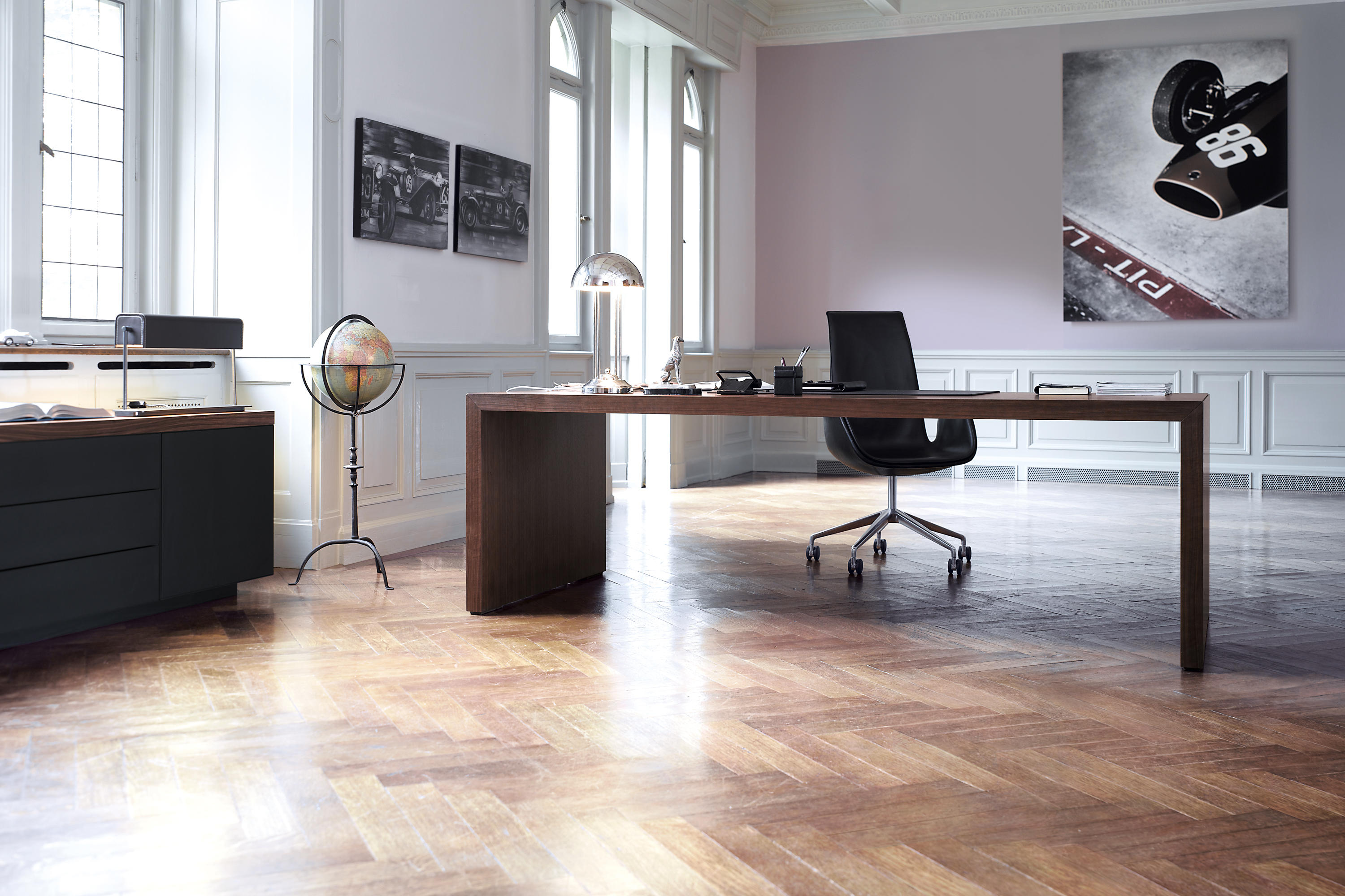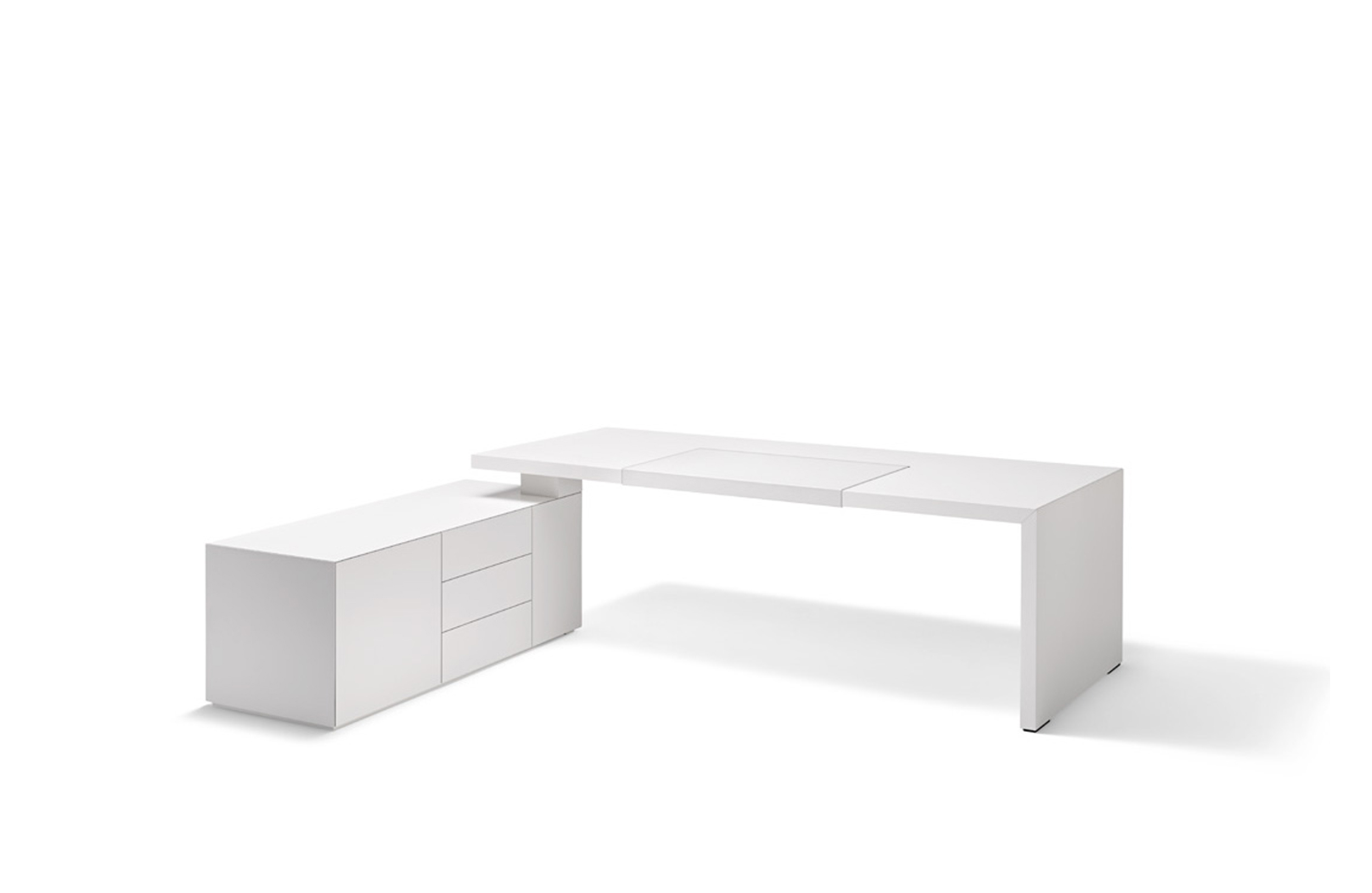 桌面和侧面,水平和垂直形成一个均匀的结构,是Headoffice Mono系列会议项目设计团队所执行的结构概念。强大的线条与精选材料的优雅相结合。由侧面和桌面所制成的直角,中间的桌子上有醒目皮革包裹的面板,如果有需要,可以使用滑动皮板来打开集成线路。电缆布线隐藏在桌面和副柜之间。