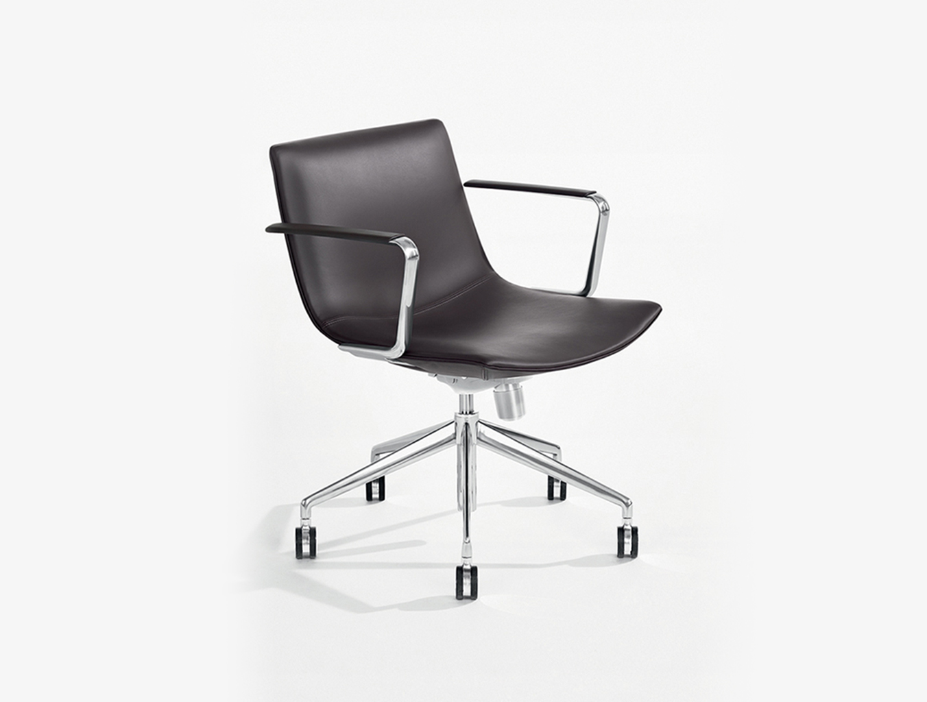 Catifa 60的外壳采用柔软的聚氨酯制成,采用皮革装饰,颜色范围广泛的织物或客户自己的面料。 它也可以配备扶手,如果需要可以盖上。 底座采用抛光铝材质,采用4星或5星版本,配有自制动脚轮。 各种机构可用于增强舒适性和功能性:旋转,自动,气体或气体与倾斜重新定位机制。