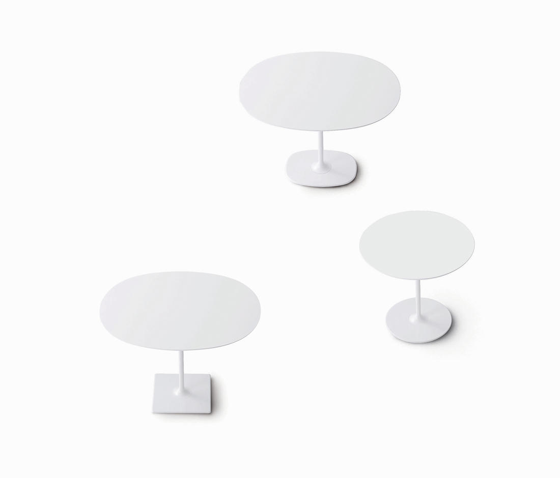 咖啡桌为椭圆形底座,白色有光泽或黑色哑光粉末涂层钢,顶部为白色压花MDF(厚2.5厘米)或层压板FenixⓇ(厚2,6厘米),有不同尺寸可供选择。 身高35厘米。