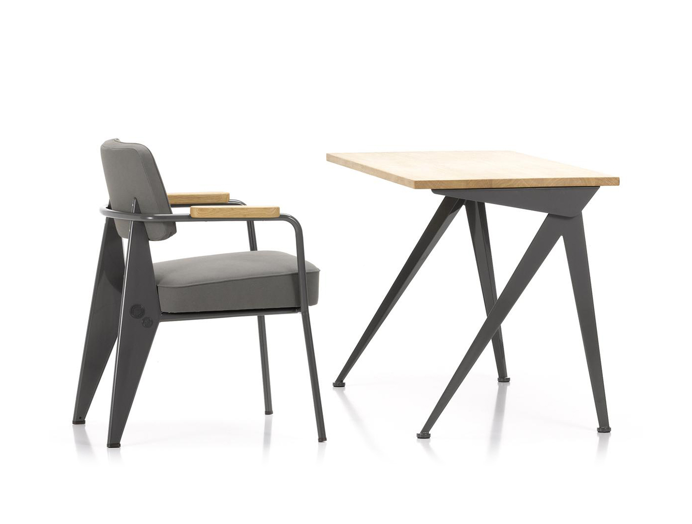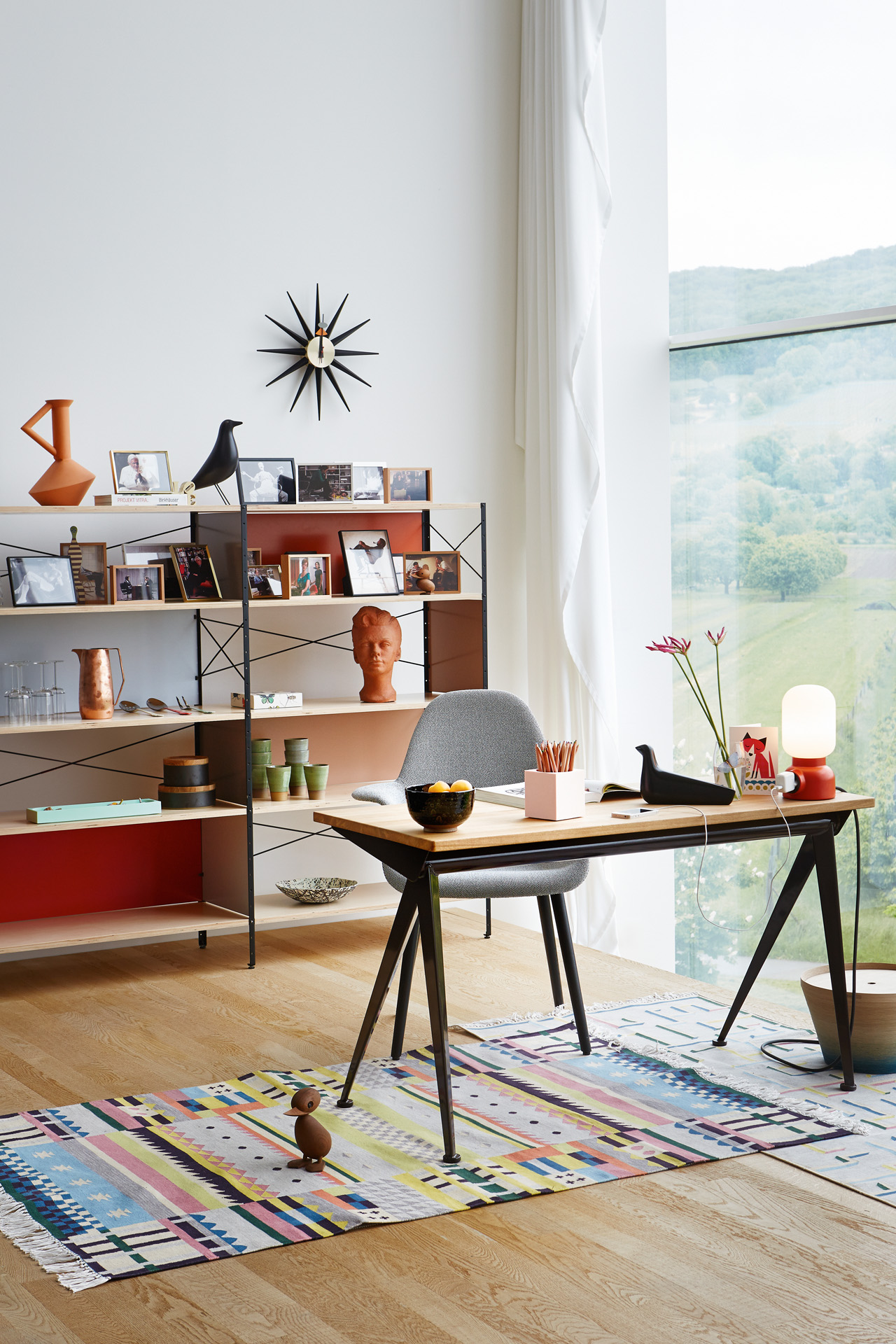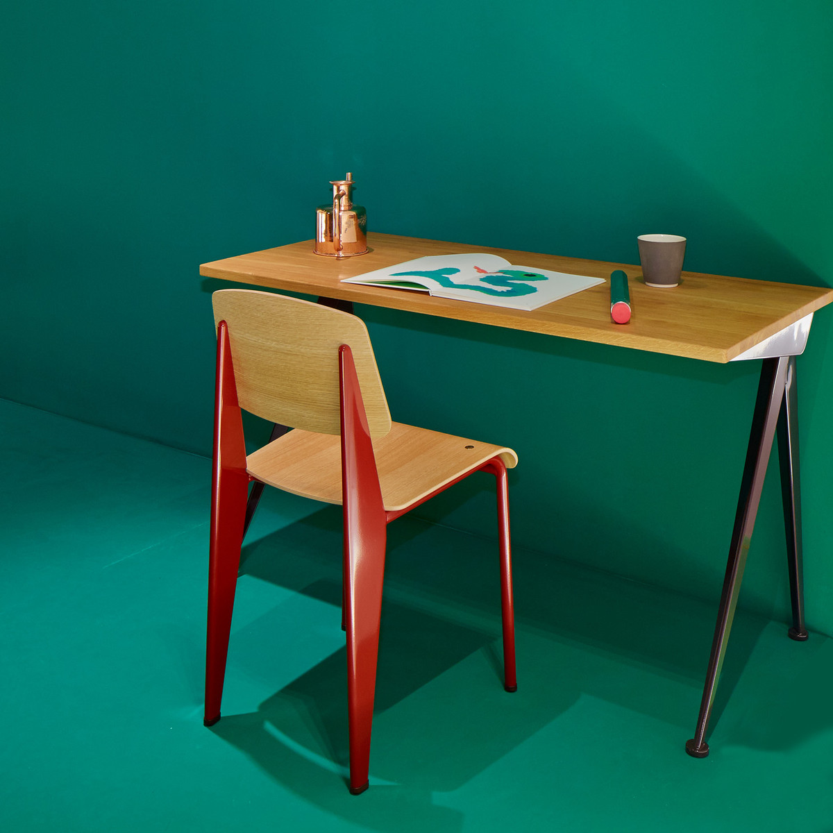 由JeanProuvé设计的Compas Direction办公桌,优雅的金属腿让人想起指南针的铰链臂 - 法语中的“le compas”。 他们的设计基于工程原理,代表了法国设计师和工程师的结构方法。 与涂油的实木桌面搭配,它们在家庭办公室形成了丰富的对比材料组合。