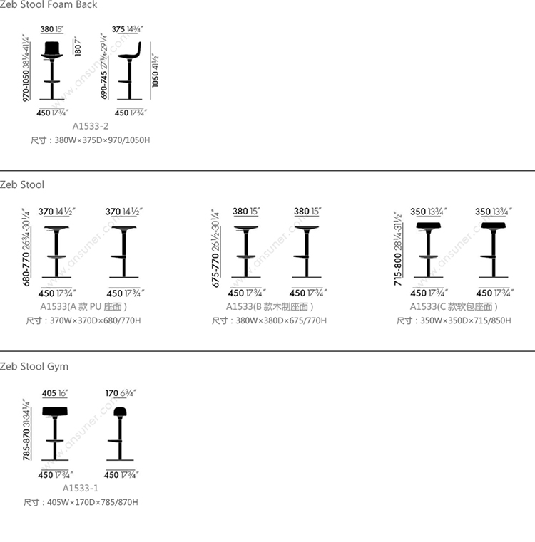 Zeb Stool Foam Back 系列尺寸/示意图