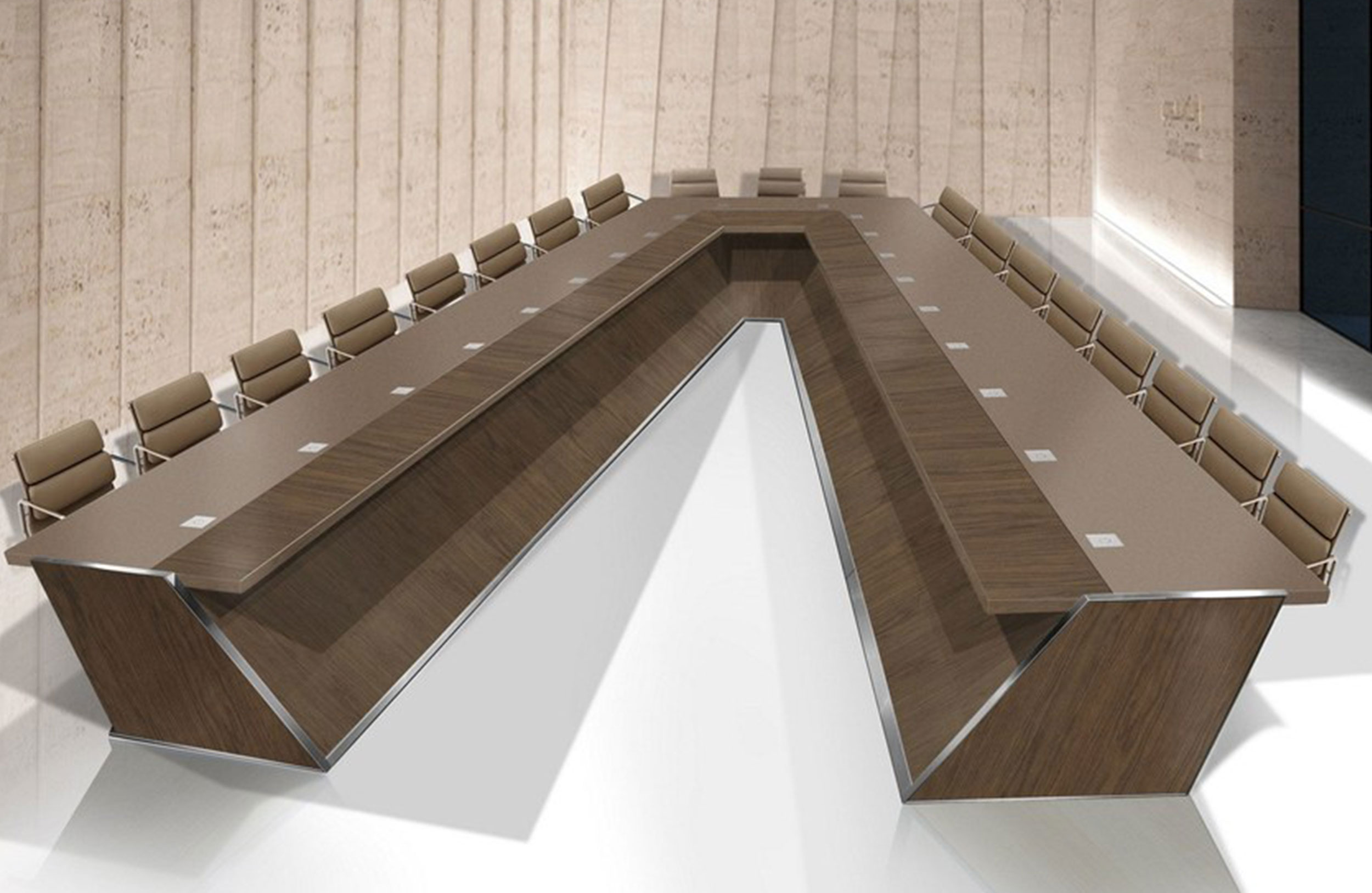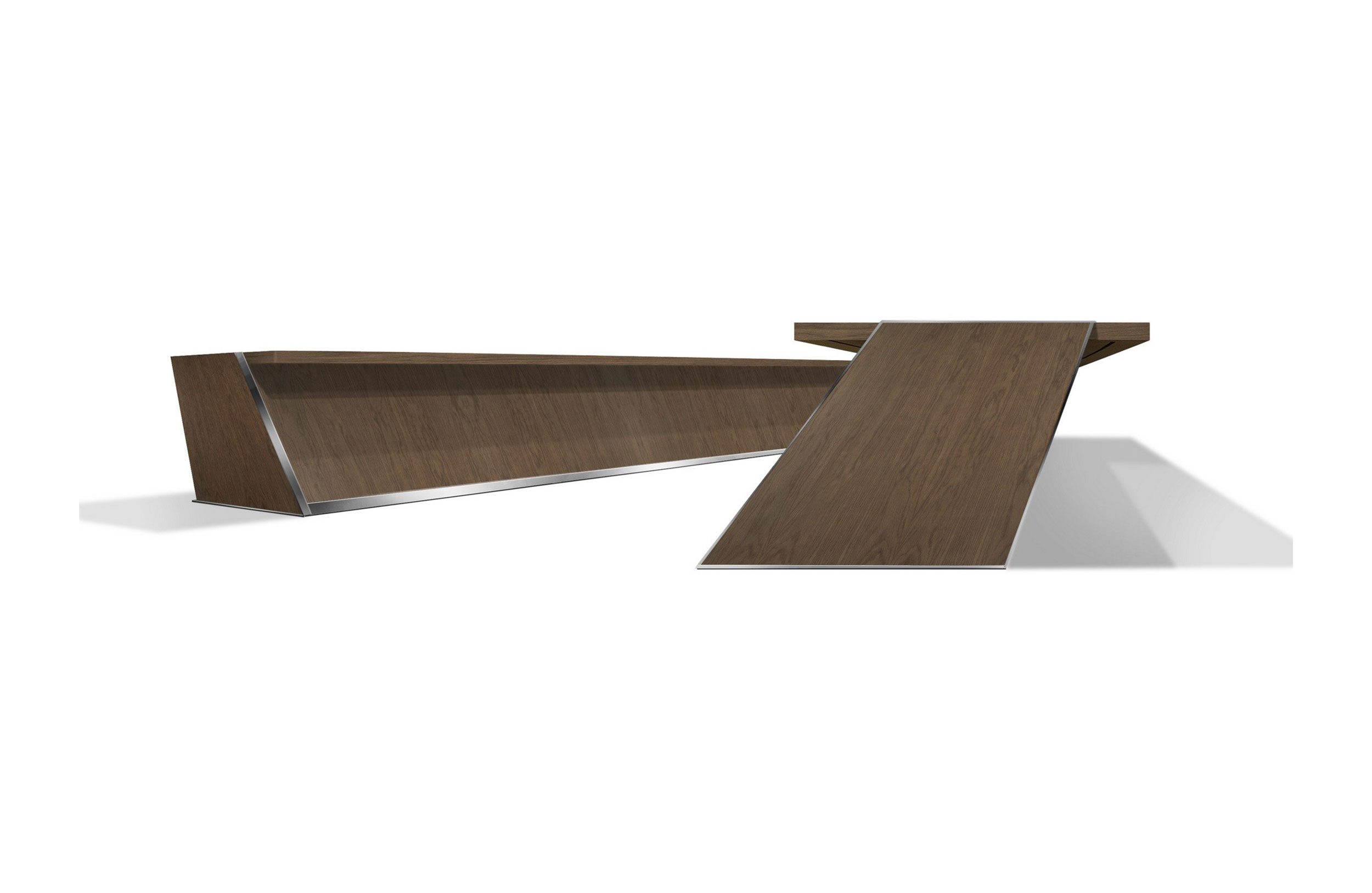 会议桌。50mm厚的直线顶部,在桌子内侧打开。顶部分为两部分,允许不同材料和饰面的组合。表专门设计用于集成可伸缩电脑显示器,电缆管理和电子系统的其他部分。底座由隐藏的金属结构组成,桌面内侧采用FIXED INCLINED面板封闭,外侧采用可拆卸面板,可方便地进入桌面内部,以便进行电缆管理和维护。表面处理:混合成品顶部采用木材,微纹理漆或Techno Leather软垫。固定面板,木质或漆面。