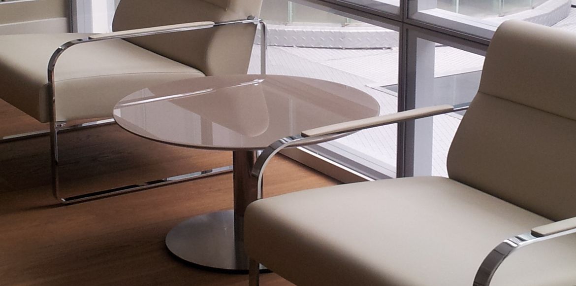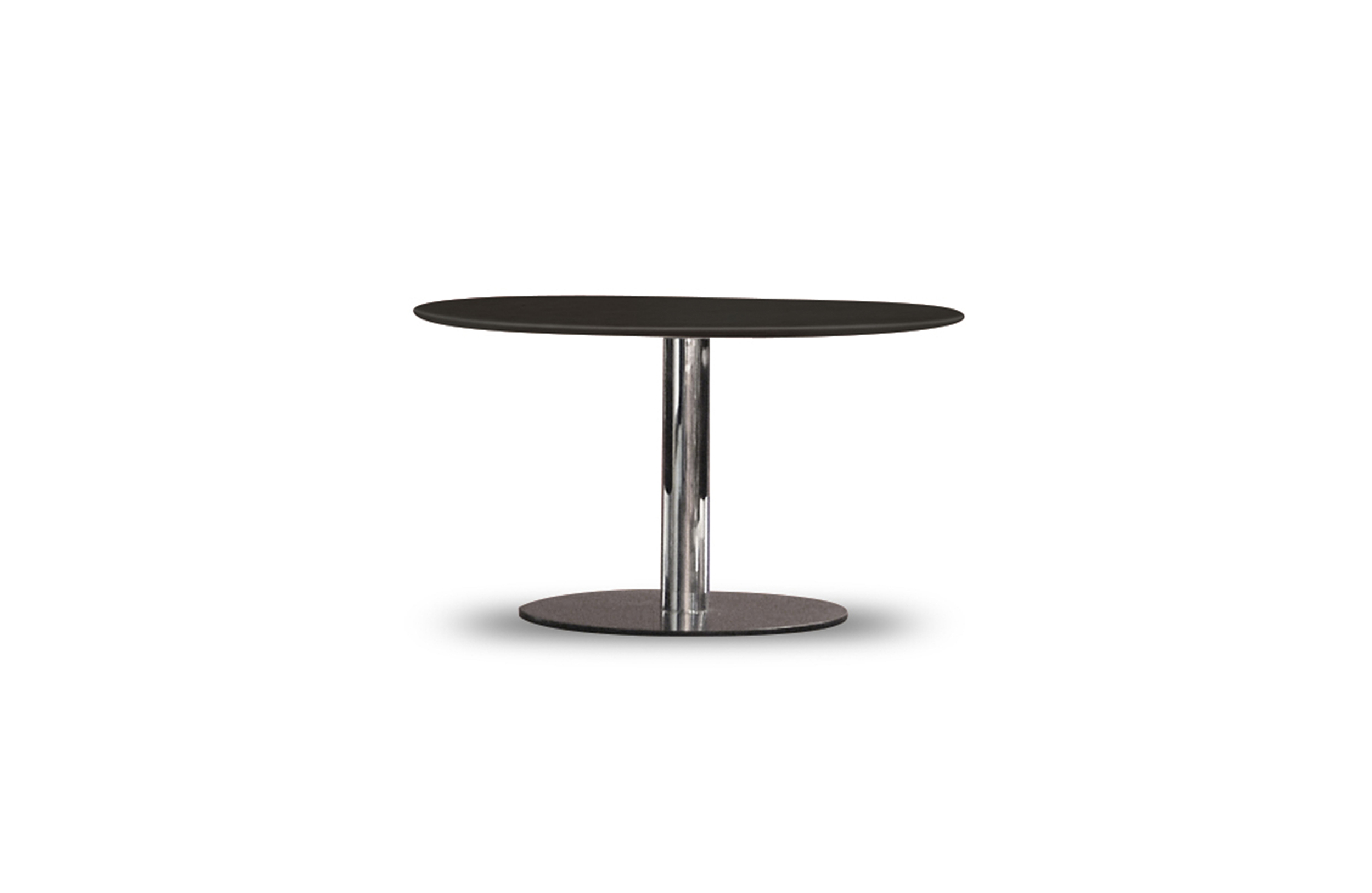 咖啡或边桌。金属框架由cilindric柱和圆形板脚制成。圆形黑色漆面玻璃顶部加上覆盖漆面特殊。表面处理:完美无瑕。铬光泽表面的色谱柱。顶部采用玻璃黑漆面。Overtop采用微纹理漆面处理。