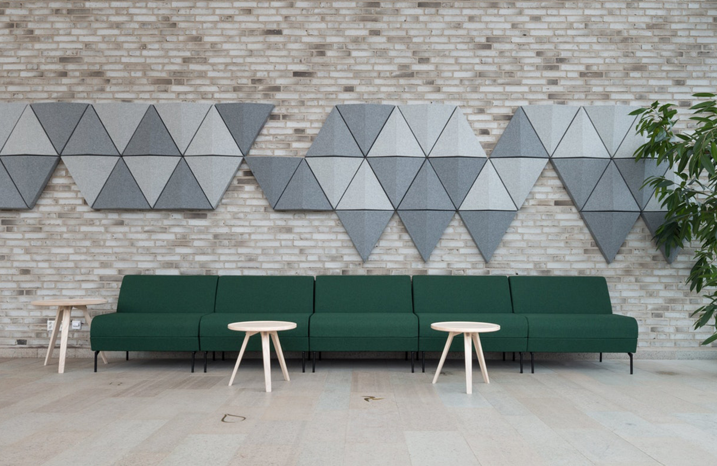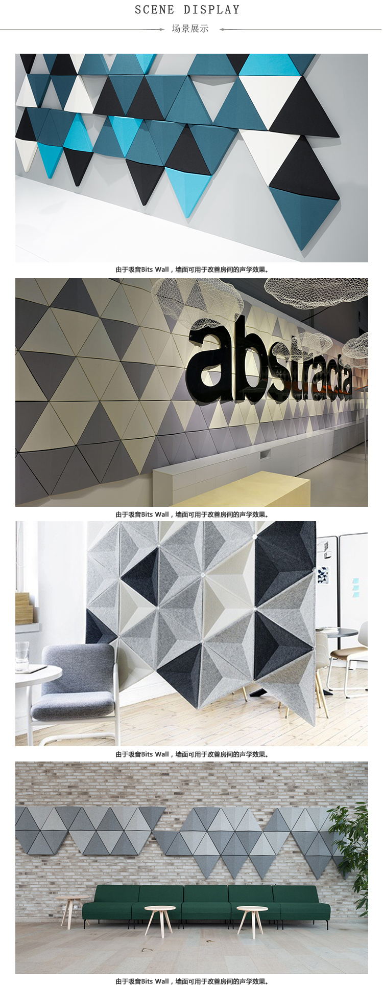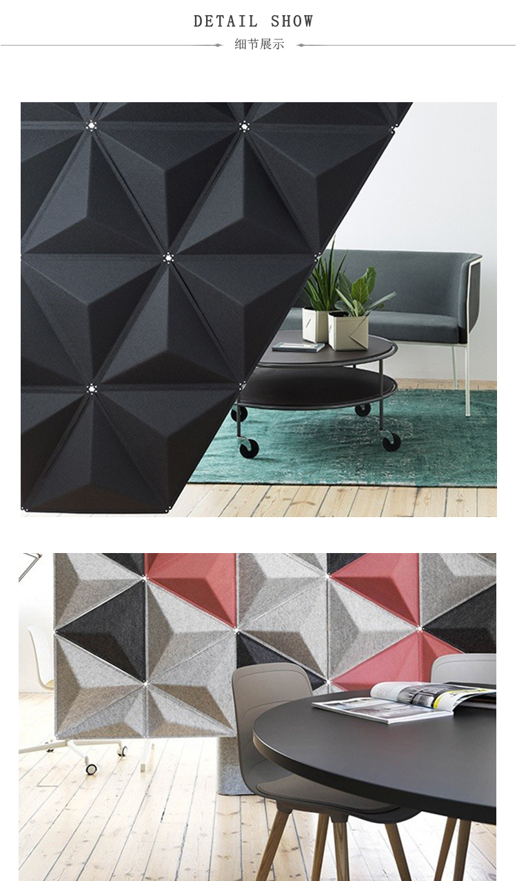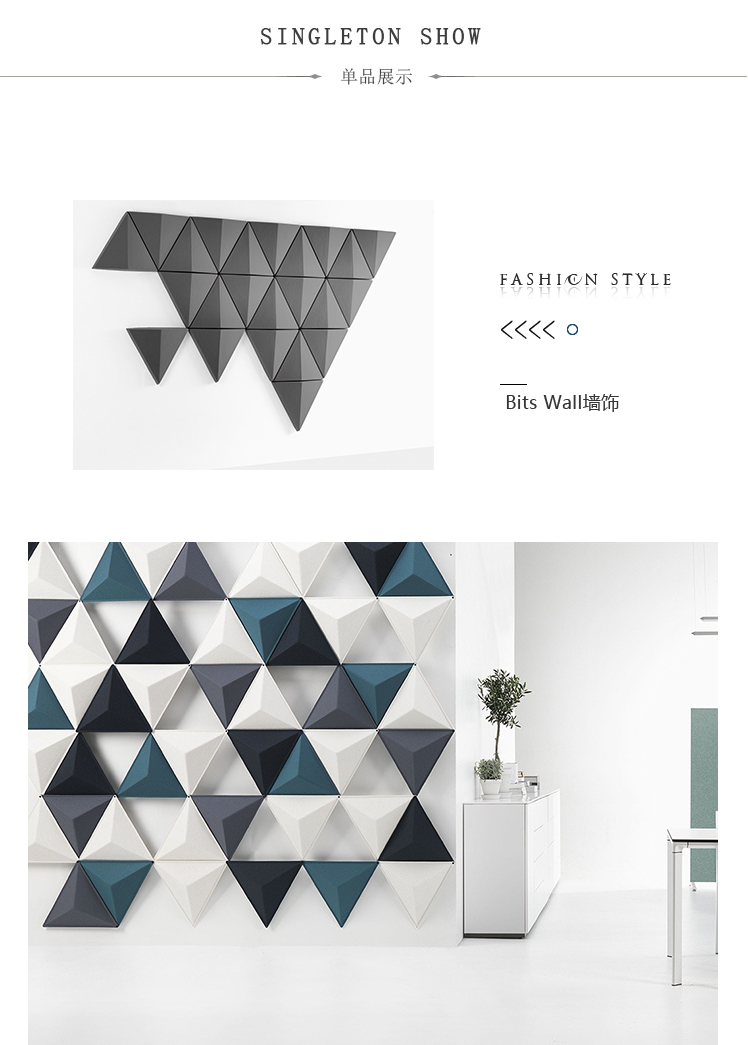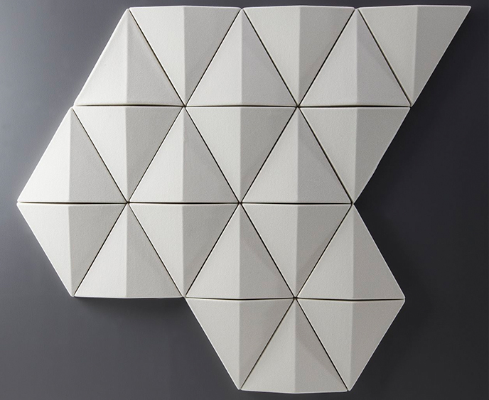 如果每个其他三角形悬挂其顶点朝向相反方向,则Aircone墙壁会呈现深度并提供最佳的声学效果。同样,如果三角形背靠背悬挂,则在各部分之间会产生空间,这也会显着降低噪音。