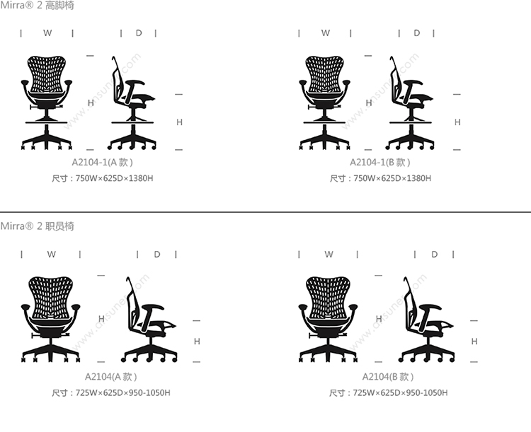 Mirra® 2 高脚椅 系列尺寸/示意图