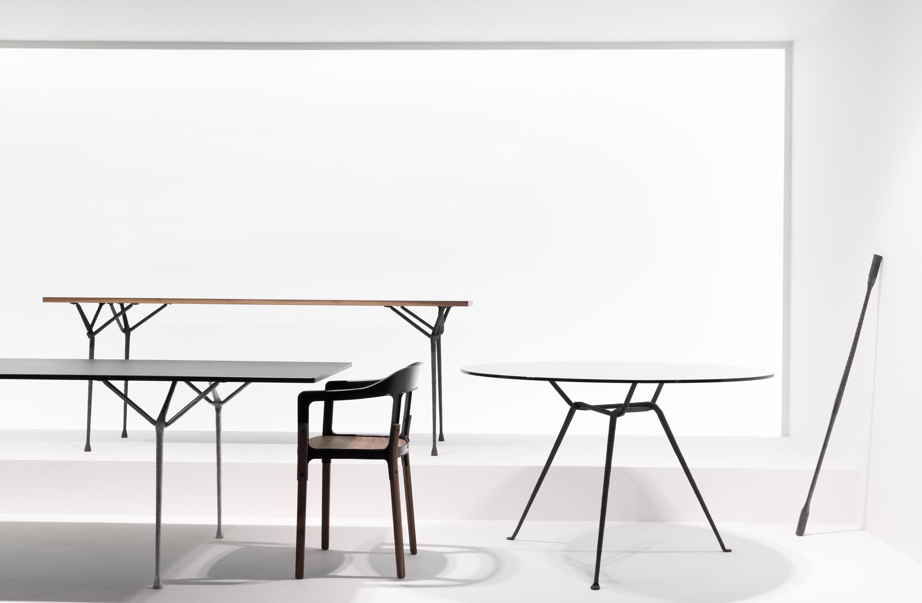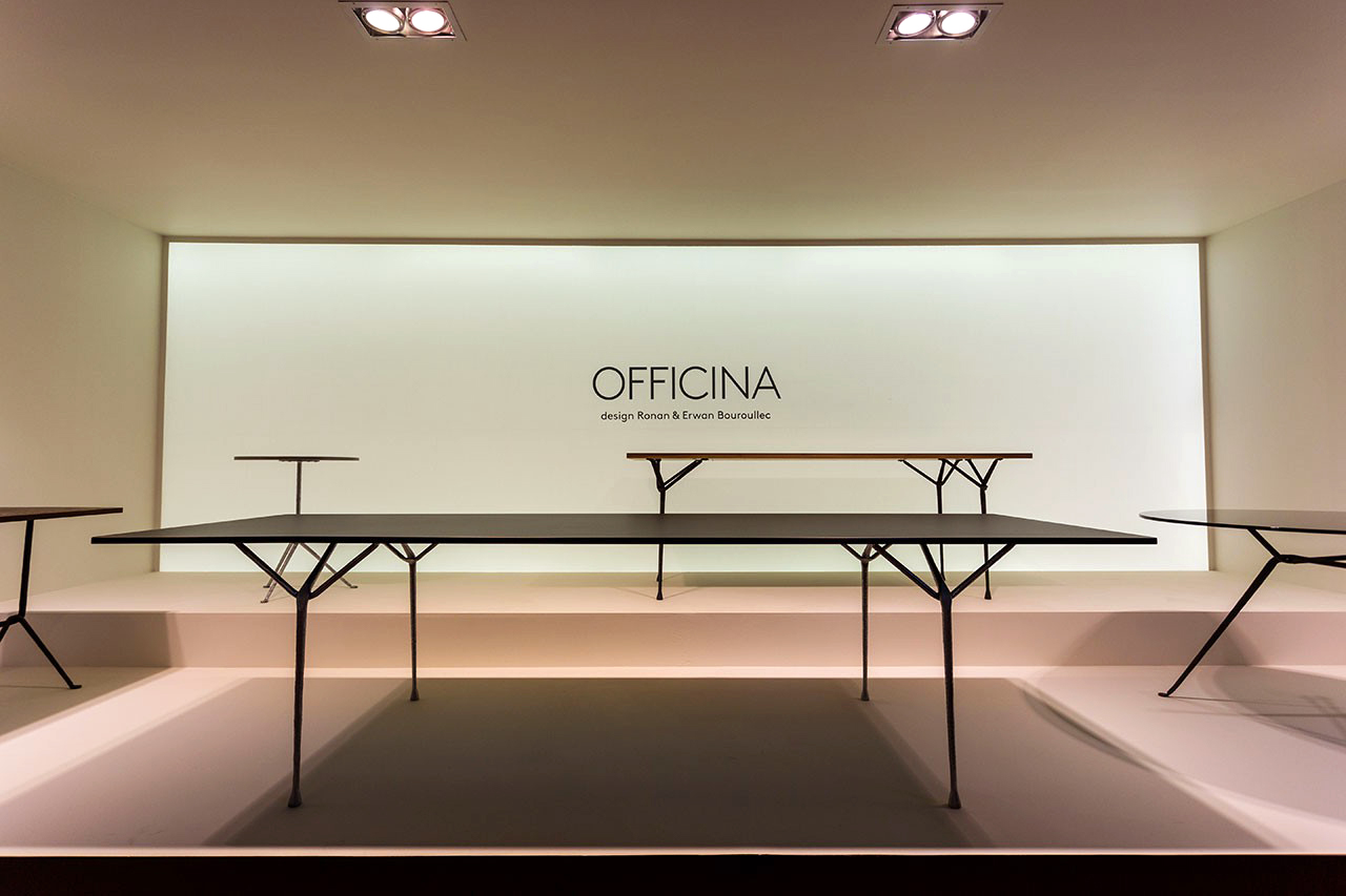 设计师罗南(Ronan)和Erwan Bouroullec用办公桌边设计了一种古老的锻造和锤击铁,用来制作各种形状。他们的目标是“利用这个古老的制造过程,给它一种新的视觉语言,”Erwan说。语言具有真实性和思想性。罗南指出:“通过对那些赋予它们形状的工具的随机、机械痕迹的反射,这些东西给工业计划带来了一股清新的气息。”