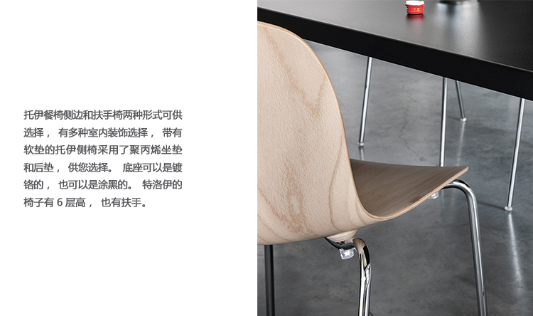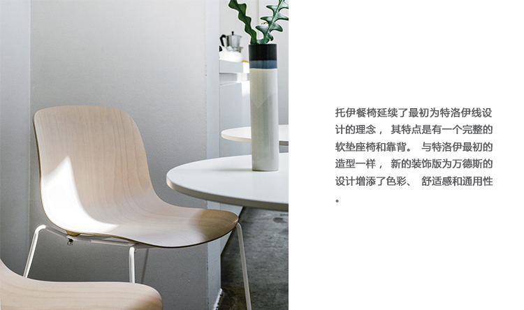 托伊软垫椅延续了最初为特洛伊线设计的理念,其特点是有一个完整的软垫座椅和靠背。与特洛伊最初的造型一样,新的装饰版为万德斯的设计增添了色彩、舒适感和通用性。椅子可以选择框架饰面和大量的纺织品。不管有没有武器,特洛伊在餐桌旁或工作空间里的客人椅子上都是一样的自在。
