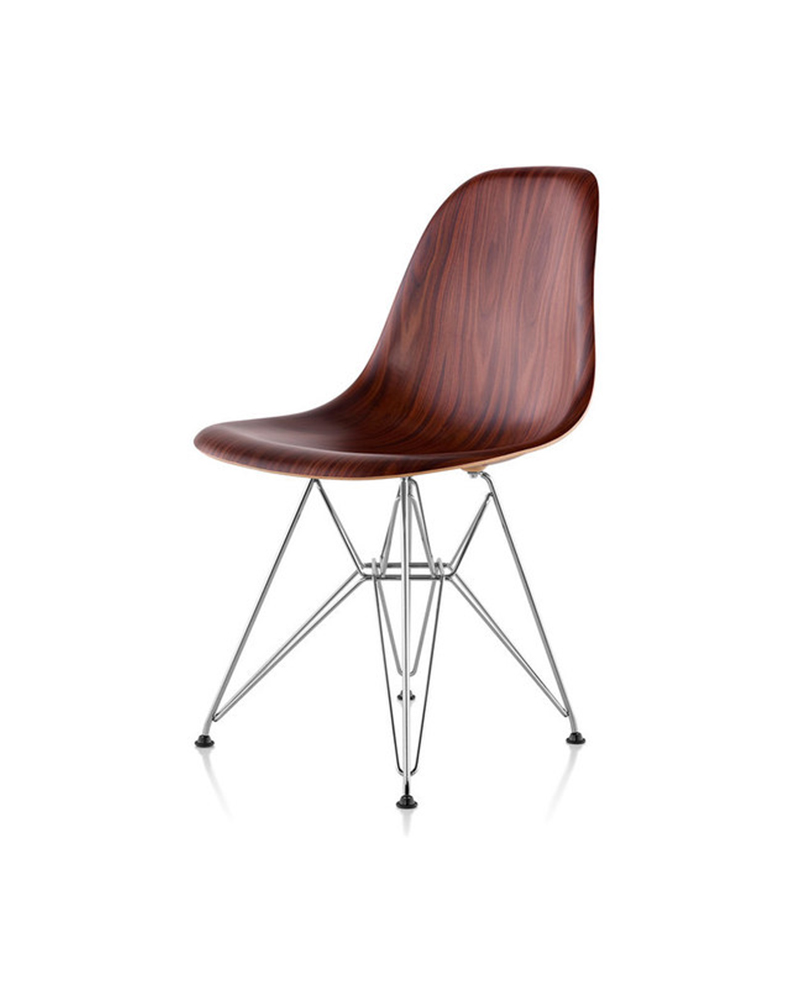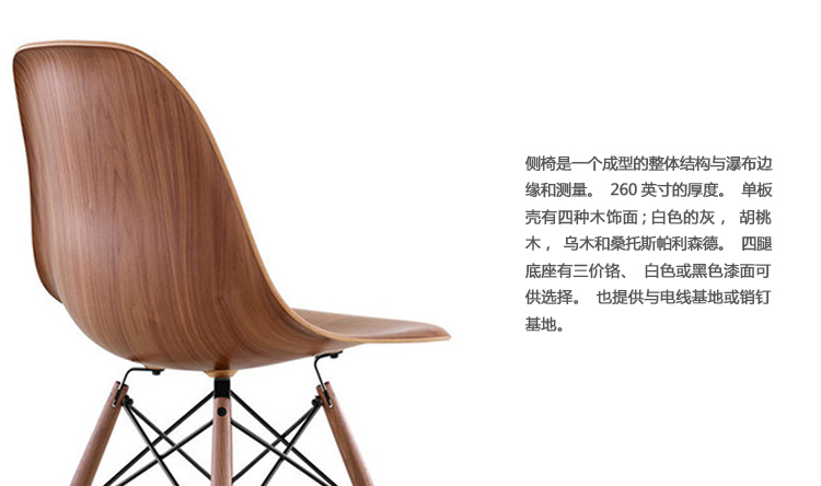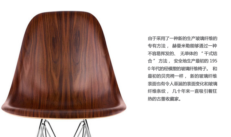 本单品为Eames Plastic Chair 系列成员之一,舒适的椅座外观设计是以添加了玻璃纤维强化的塑料来制作,再搭配上各式不同的脚座来增添使用的多样化,值得一提的是Eames Plastic Chair 的创新技术与材质,便它得以成为全世界第一张被大量制造的单椅。拜现今创新的科技所赐,全系列的Eames Plastic chair 终于再次制造,使用环保可回收的聚丙烯材质,求制作线条优美的椅座外壳,不但重量更轻,同时更具有更好的耐热性及抗化学性。