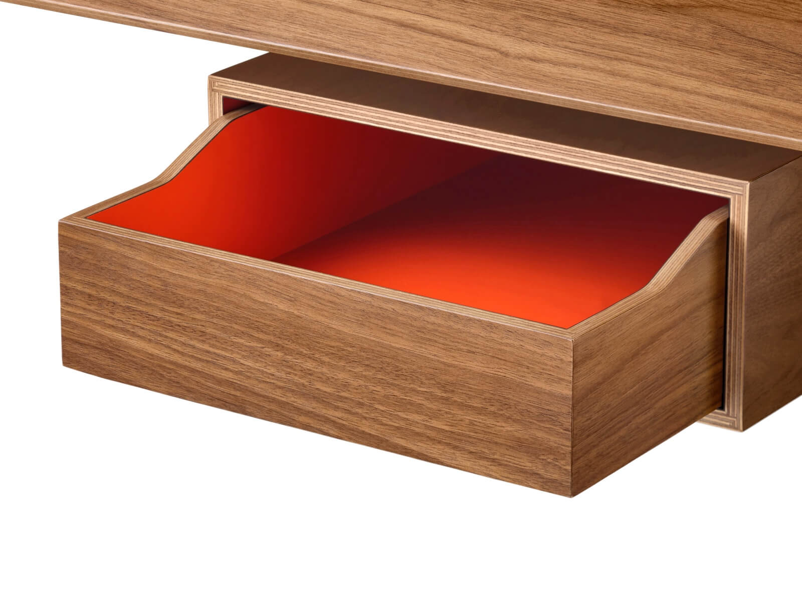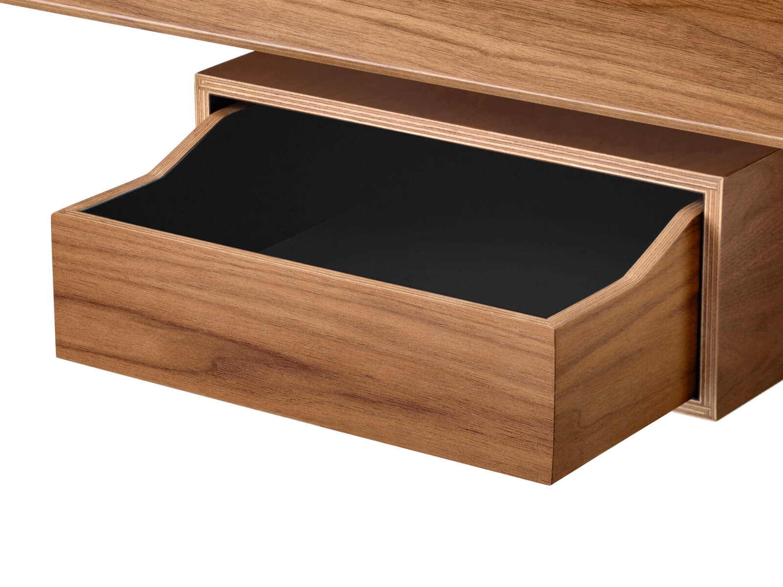 没有存储部件,Distil就是一张优雅的桌子。无论在竖直方向还是水平方向加上存储部件,Distil就变成了办公桌。通过巧妙的设计,使设备和充电器触手可及而又位于视线之外,Distil衬有层压板的存储单元安装在左侧或右侧。可拆卸的内置抽屉使桌面的面积在“盒中”增加了一倍,天鹅绒底面确保物品不会损坏内饰面。