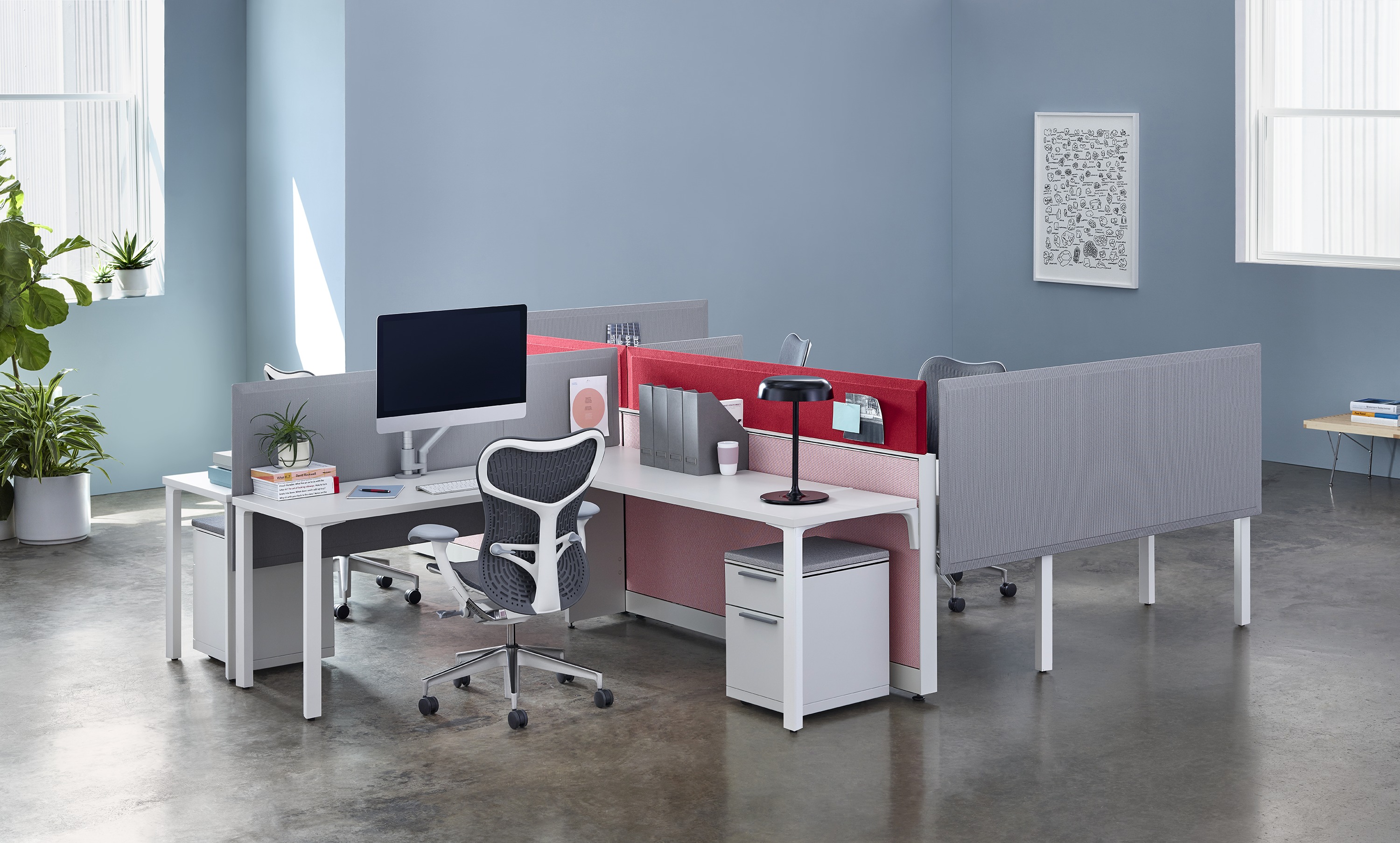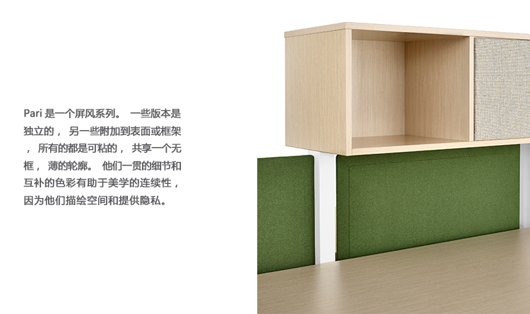 Pari是一个屏幕系列。 有些版本是独立式的,有些版本是贴在表面或框架上的,所有版本都是可粘的,并且共享无框架,薄的外形。 它们一致的细节和互补的颜色有助于美学的连续性,因为它们描绘了空间并提供了隐私。 Pari Screens与许多Herman Miller产品兼容,可在办公室环境中进行设置。 使用Pari Screens,组织可以压缩工作站并在较低的墙壁高度进行标准化,而不会牺牲员工所需的隐私,以便他们可以集中注意力,或创建个人空间的边界让他们感到舒适。