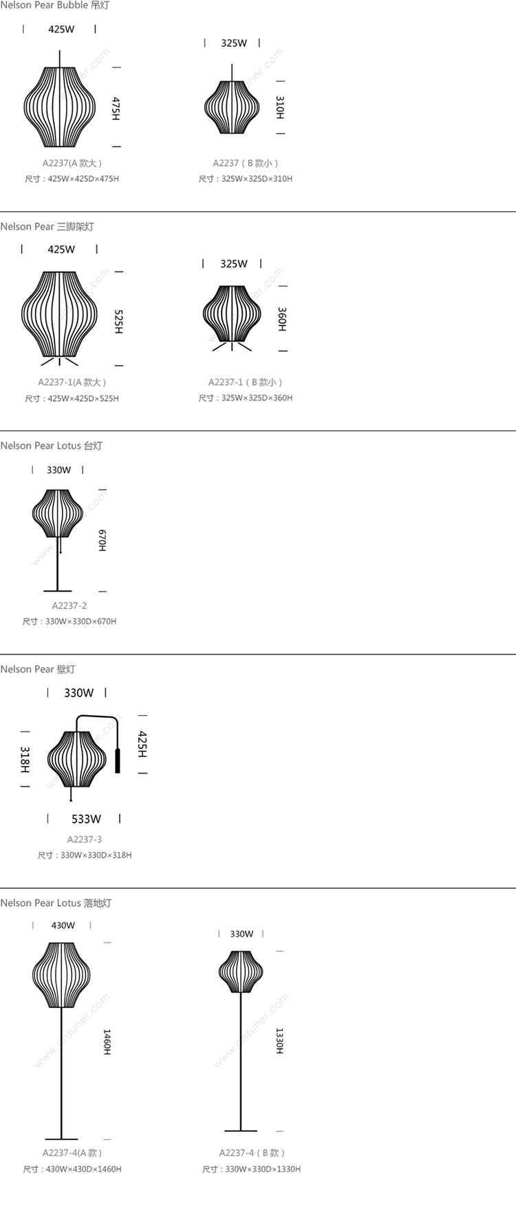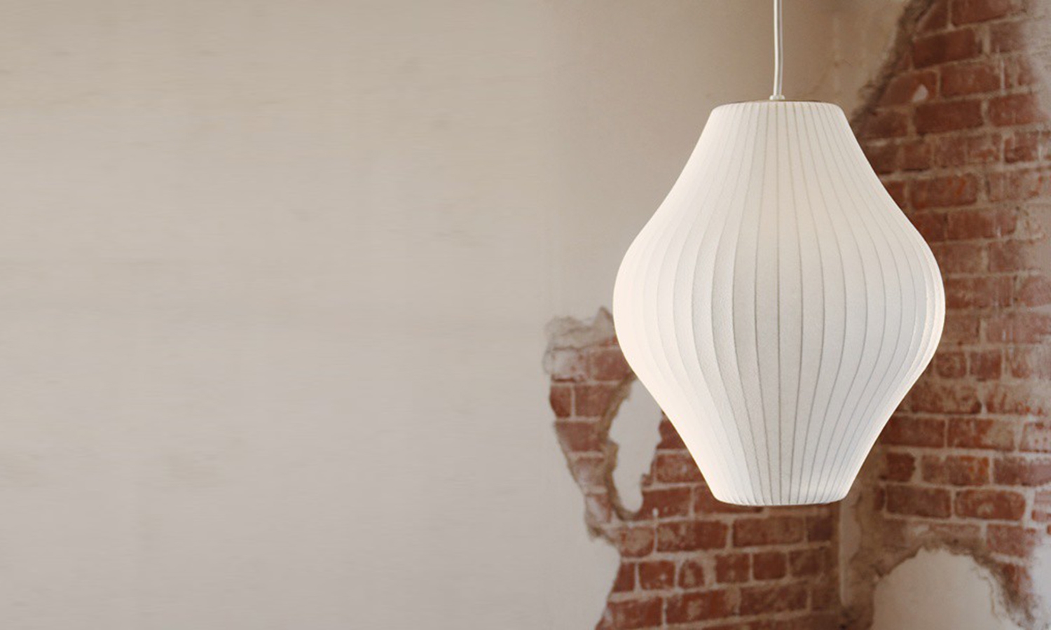 在基本的球状外形基础上稍作改变,气泡灯系列是George Nelson的设计中辨识度最高、最经典的系列之一。Nelson Pear Bubble Pendant梨形气泡吊灯悠然悬挂在头顶,向中心部位发散耀眼的光芒。本款吊灯有两种尺寸:小号和中号。1952年,美国市场引进了一款瑞典吊灯系列产品,George Nelson对此十分心仪,想要给自己的办公室买一套。那盏灯的价格在当时来讲实在过于高昂,让人望而却步,但却让他萌生出自行设计的念头来。其结果是一系列灯具的面世,这些灯具以一些自然的球状外形为特色,比如圆圆的苹果、加长的雪茄和造型优美的梨等。