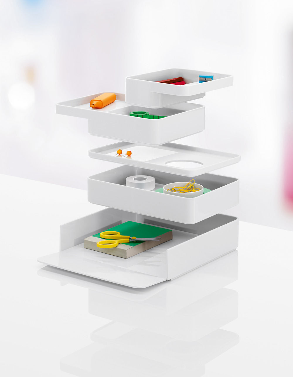 考虑到占据家庭及办公室空间的笨重物品的存放问题,Sam Hecht和Kim Colin设计了具有可拆卸盖子的储物盒。每个盖子上设计有孔洞,可供放置移动式笔筒。或者,笔筒可固定于储物盒内部孔洞下方压槽中,从而在无需打开盖子的情况下便可接触杯中物品。