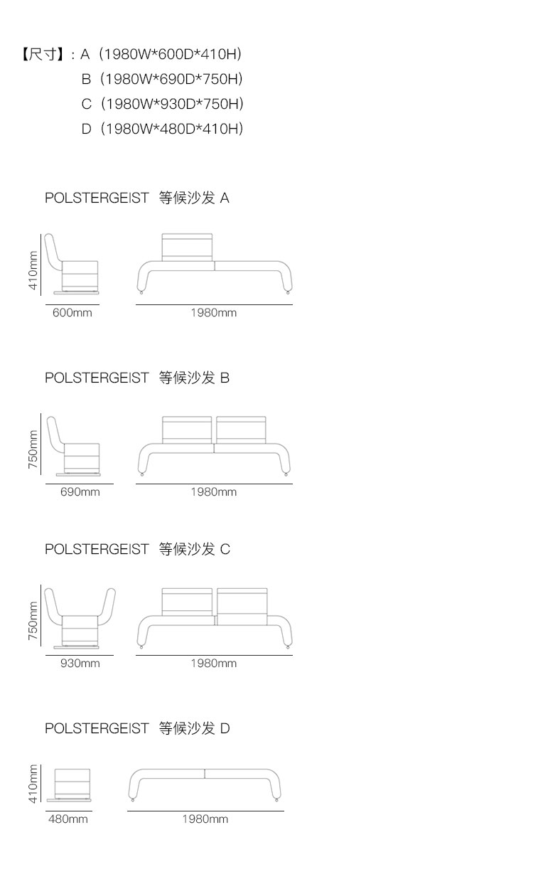 POLSTERGEIST 等候沙发 系列尺寸/示意图