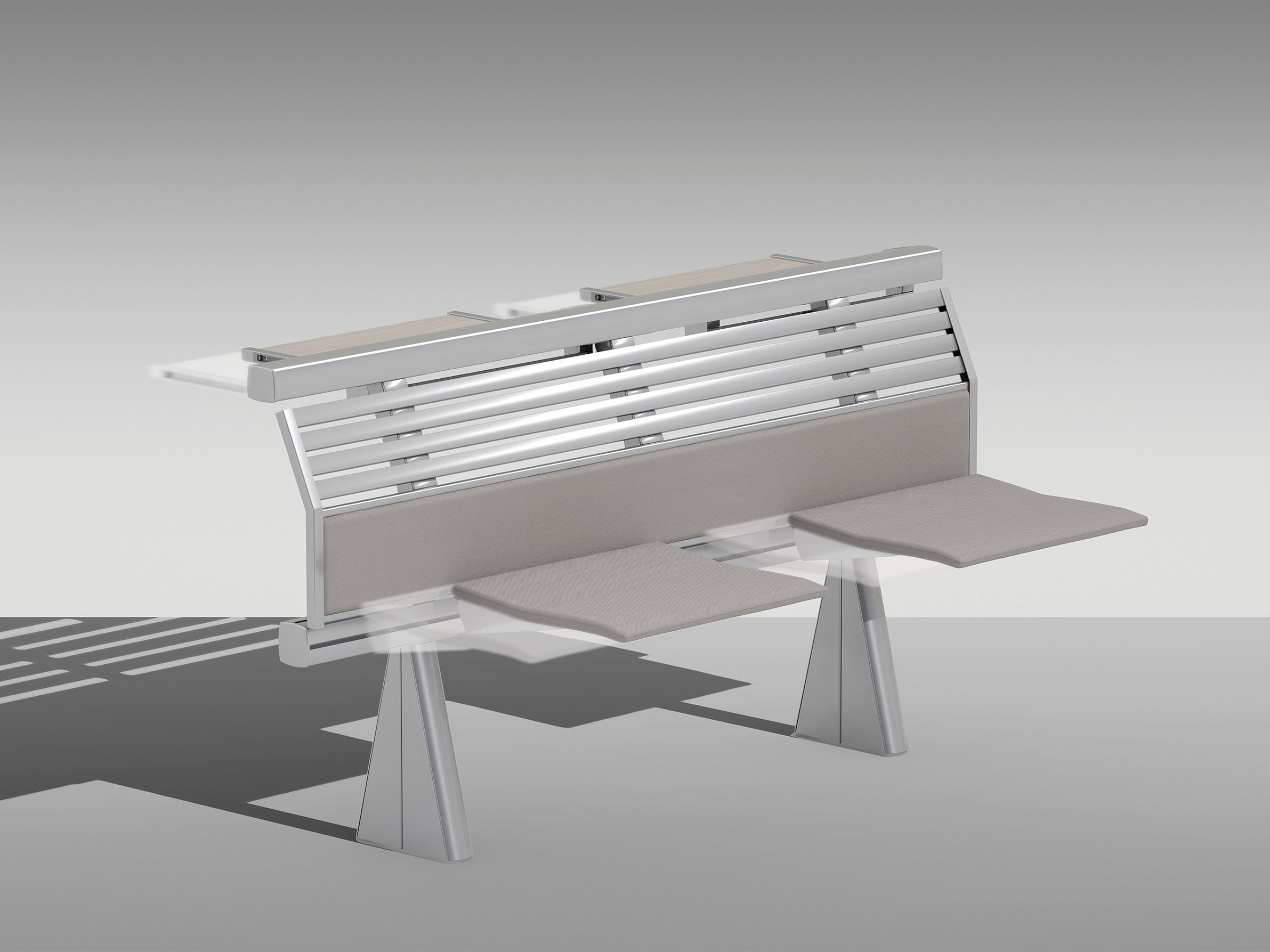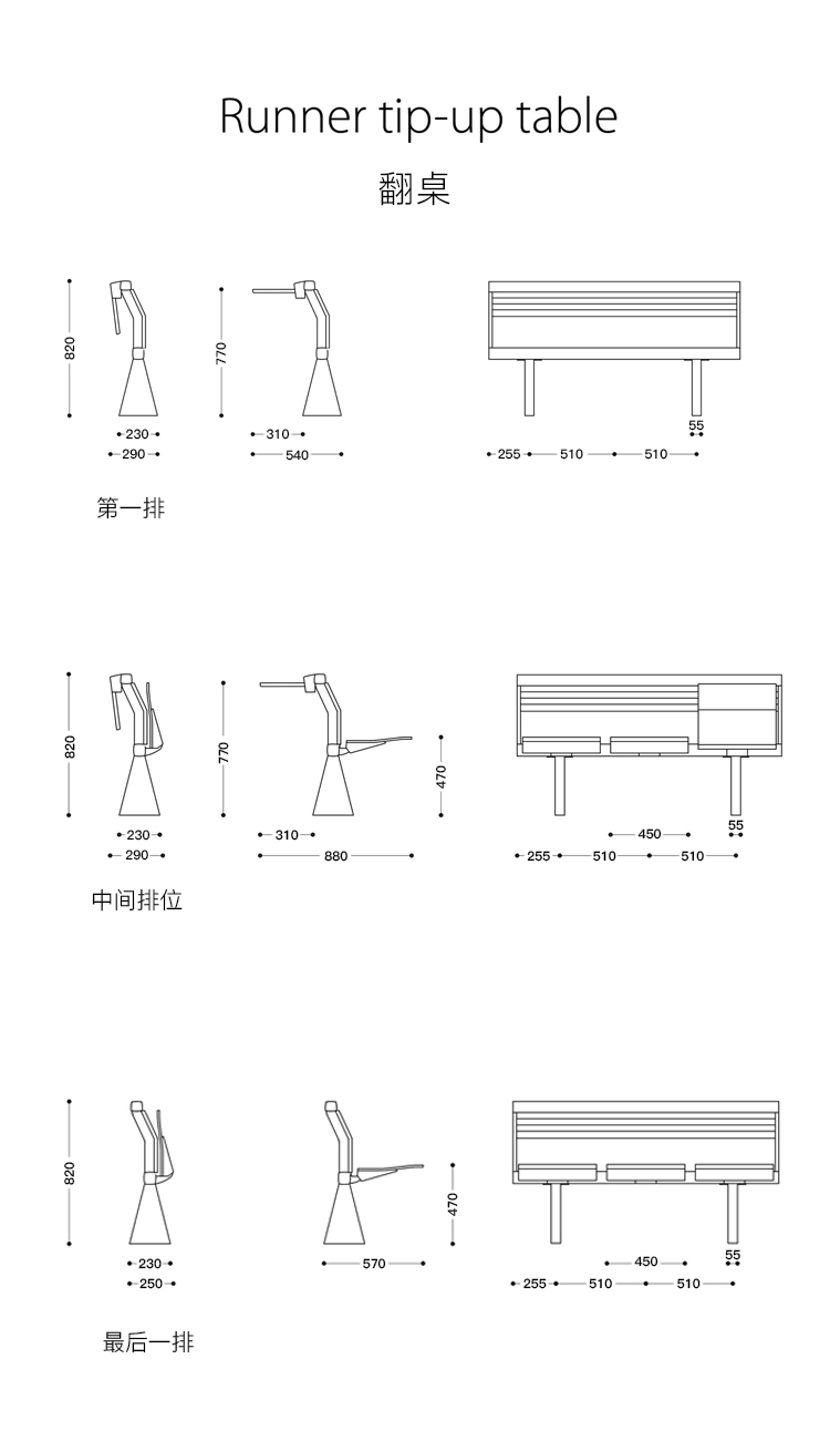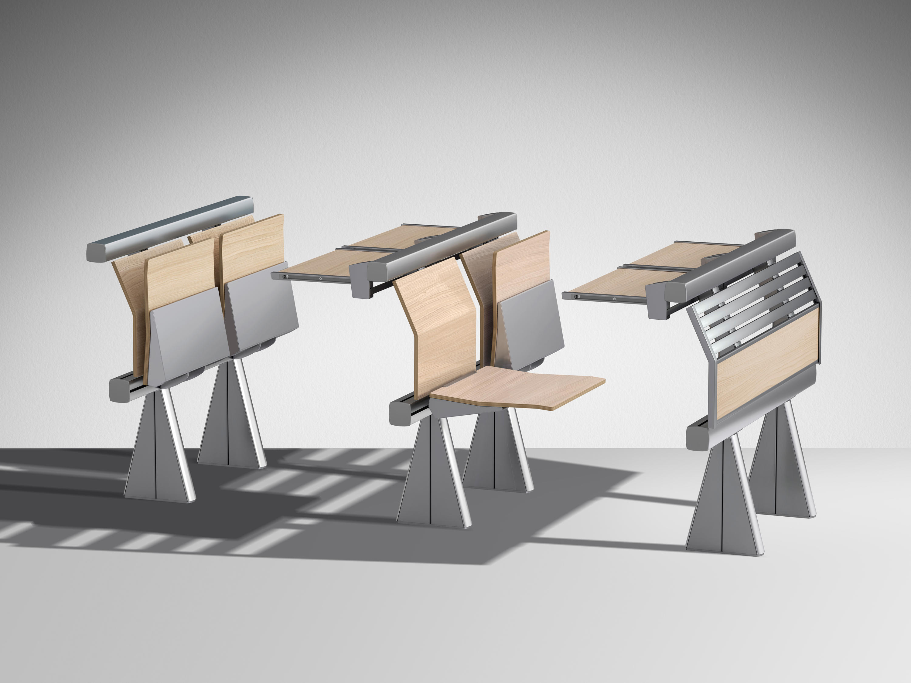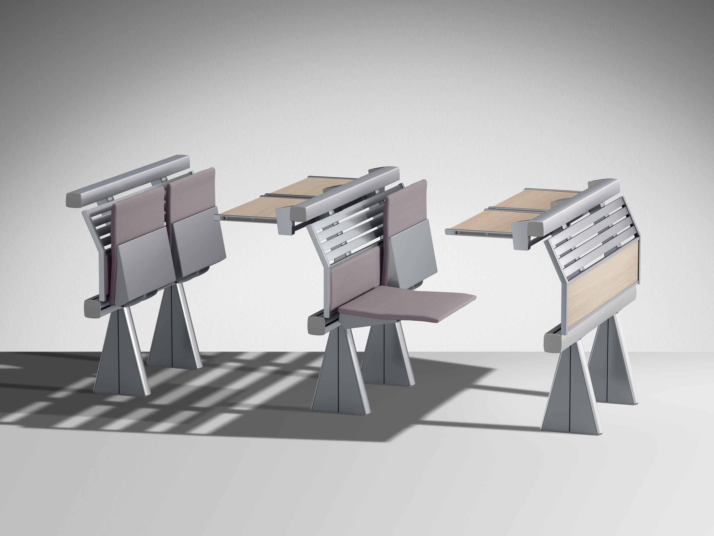创新的座椅和桌子集成系统,采用新概念结构布局设计,简化装配操作,允许多种组合可能性。‎超越模块化,在克服与模块化相关的限制方面超越模块化,它允许无缝隙的连续形状,以流体水平线为特征,适合于均匀和舒适的学习或工作环境。‎最大自由的组合挤压阳极铝承重结构,有起拱作用和安装辅助元件(立柱、座椅、书写平板、支撑)的通道,无需钻孔或任何预定义的模块化,以保证结构的最大构图自由,甚至在安装过程中。‎安装可以是一条直线,曲线,在台阶上,也可以是在倾斜地板上(座椅之间的中心到中心距离可以调整)。‎靠背和座椅连续靠背版本由板条和挤压的、阳极化的铝型材制成,上部和下部采用双叠层或贴面的中密度纤维板。‎单靠背版采用山毛榉胶合板。‎两种版本都可以用织物或生态皮革填充和覆盖。‎Tip-向上座椅自动靠背,并与靠背进行协调。‎人机工程学设计的后座是按照脊柱的解剖结构设计的,无论使用何种安装配置,都能提供适当程度的舒适性:在水平地板上,在大台阶上,在直线或弯曲的行上。