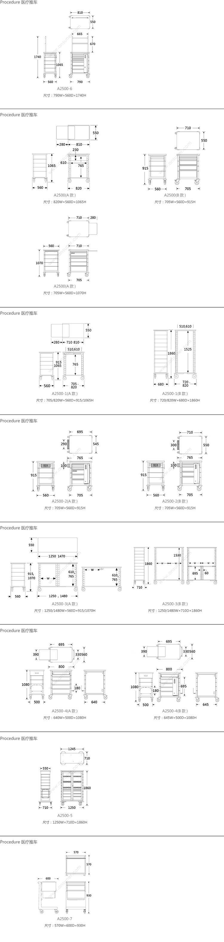 Procedure 医疗推车 系列尺寸/示意图