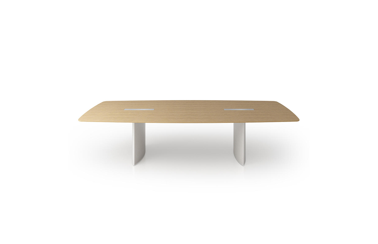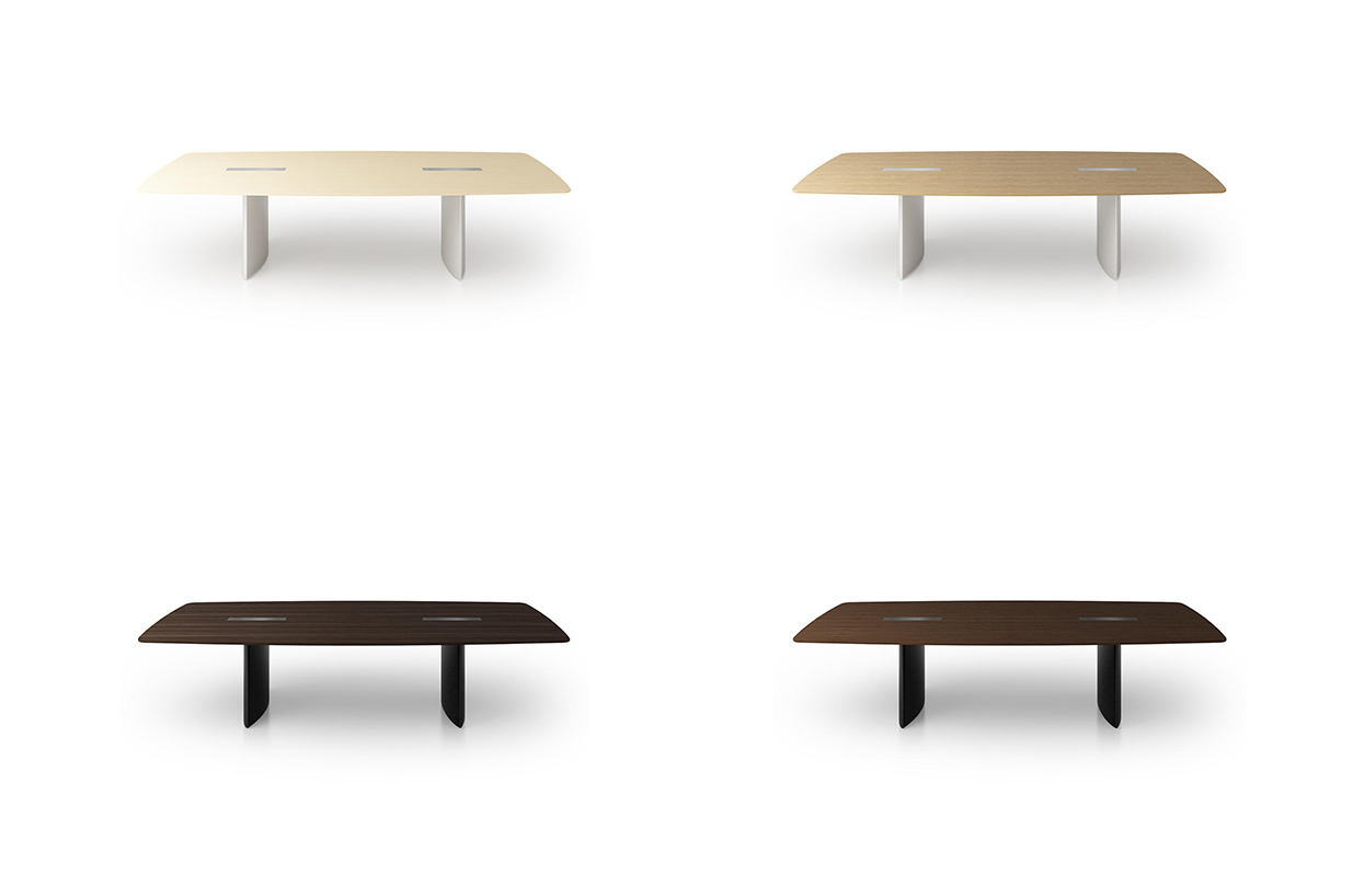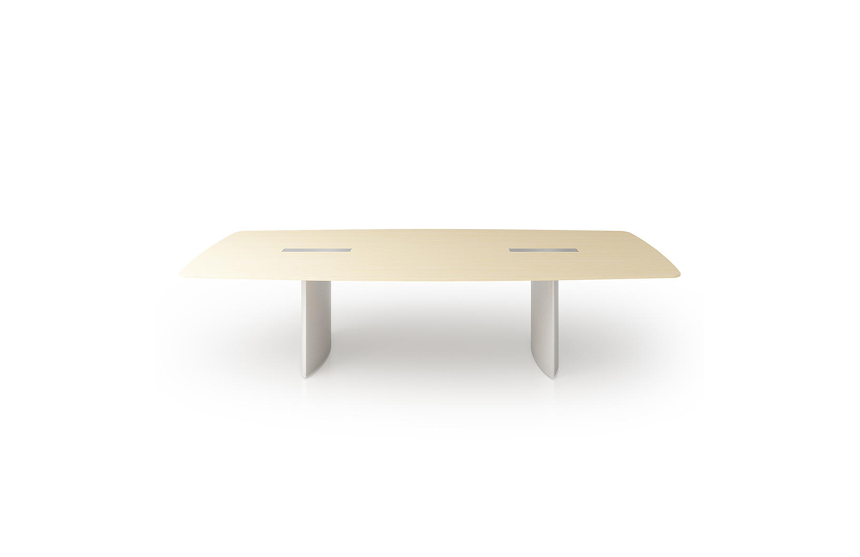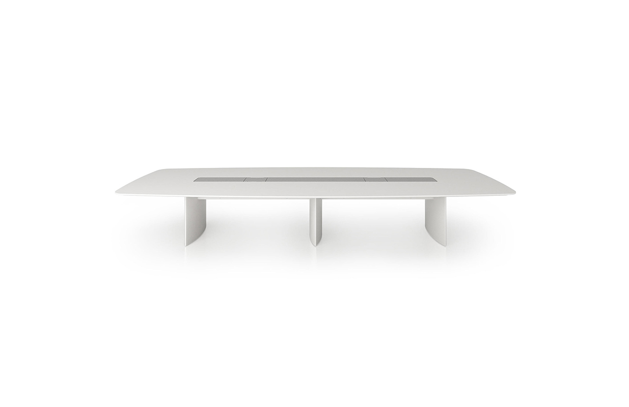船形或椭圆形为基本形状的高级会议桌。优雅的外形之下,椭圆形、直线形桌腿或整体的桌下机构,可完美收纳走线及隐蔽多媒体设备。中央多媒体槽完美的整合了投影设备和多媒体接口。表面材料可选白色特殊树脂,实木贴面,烤漆和层压板。