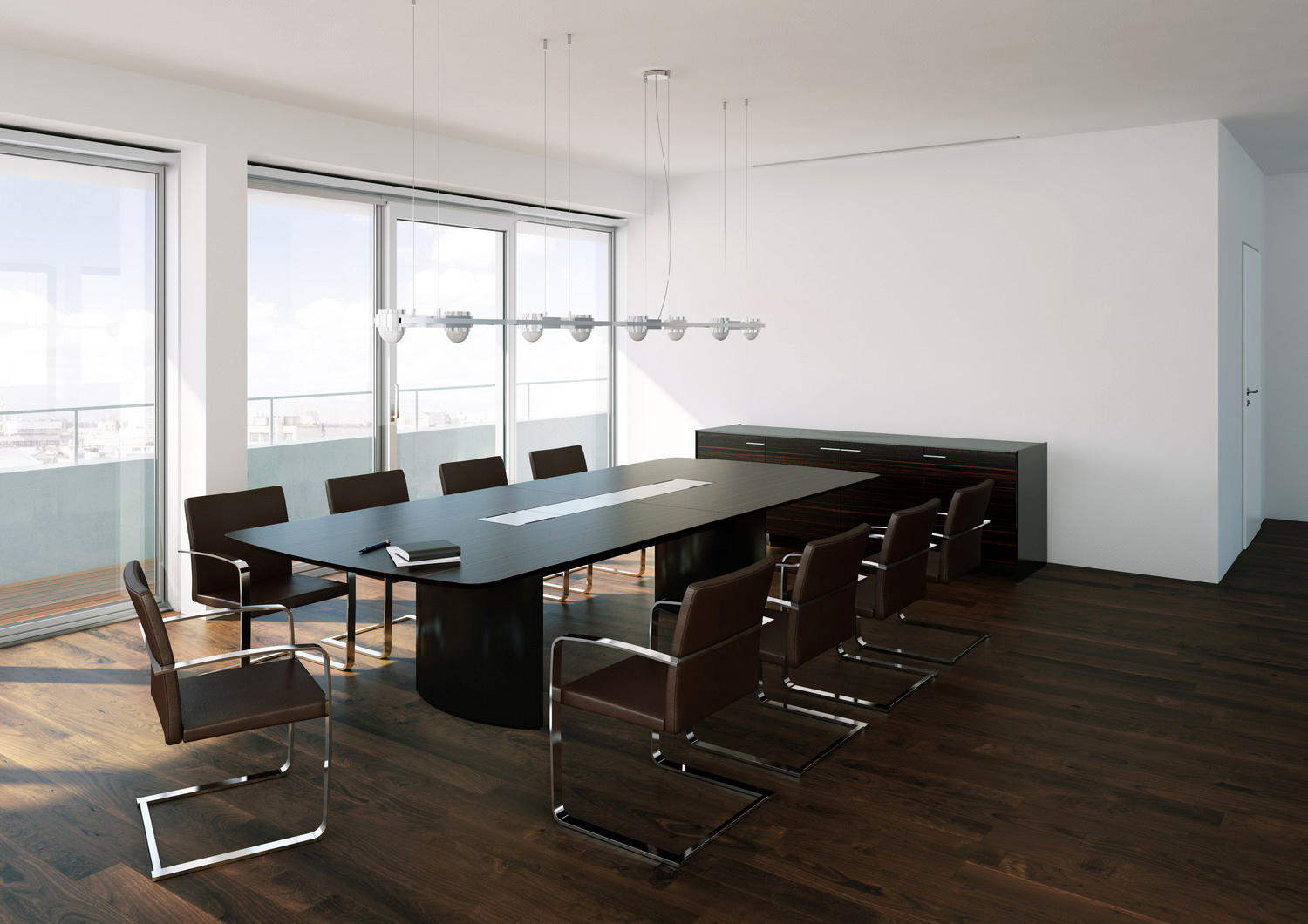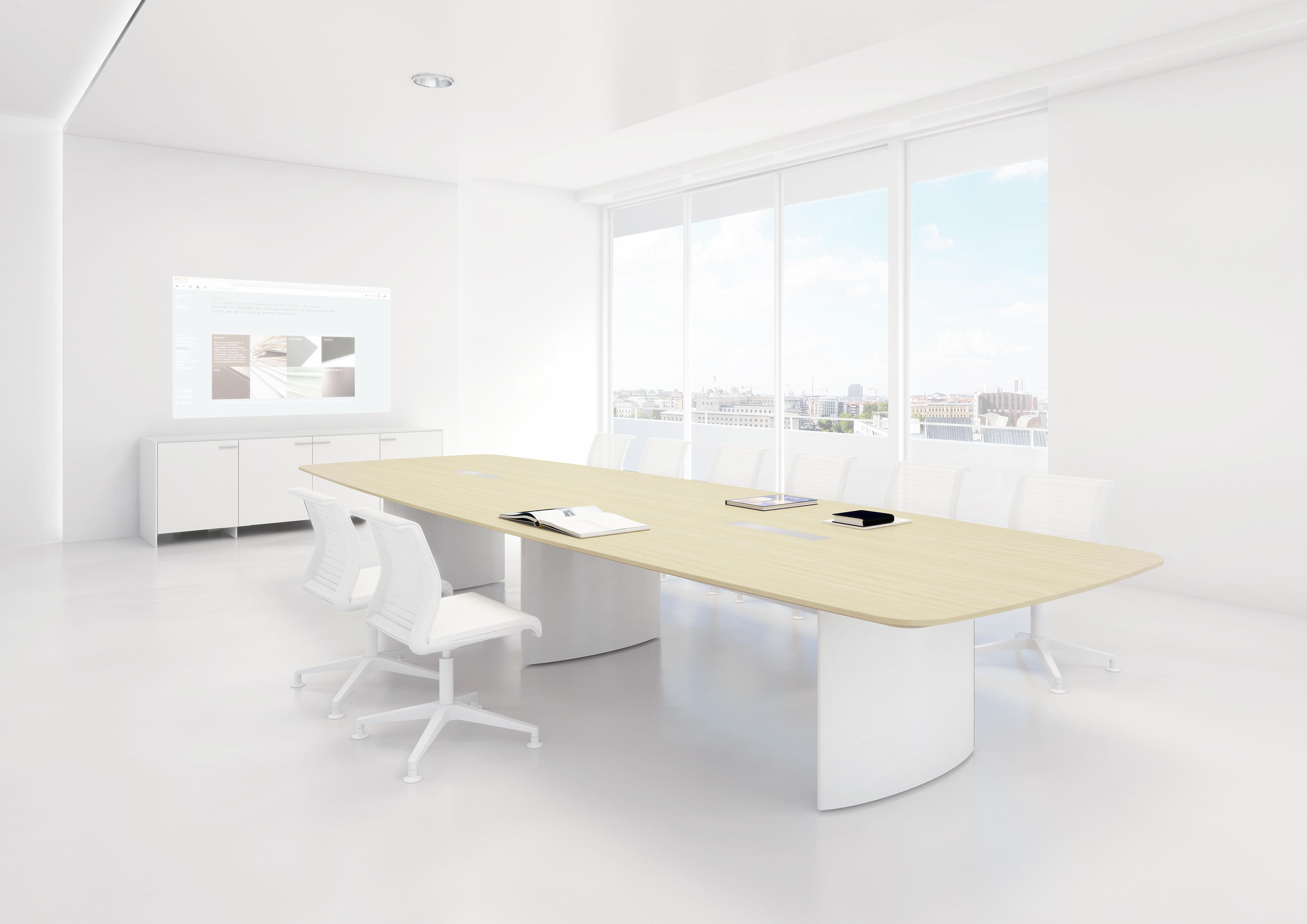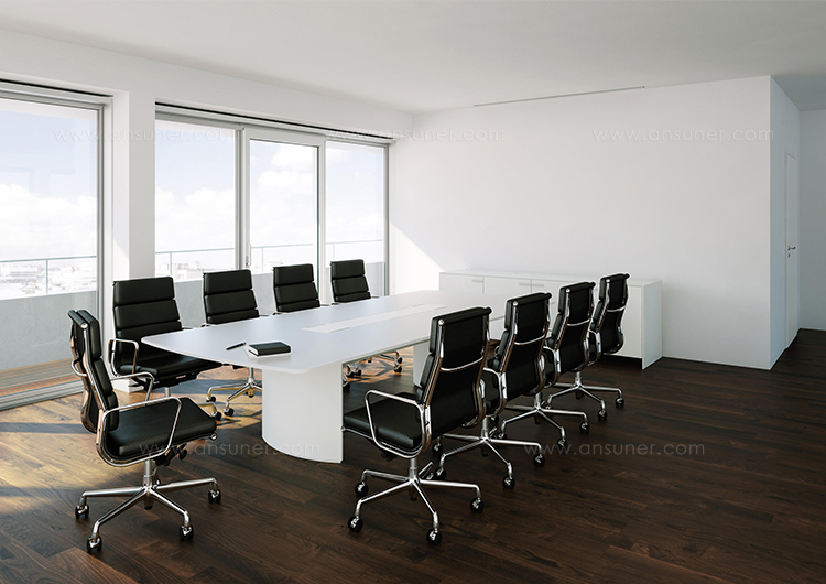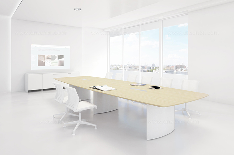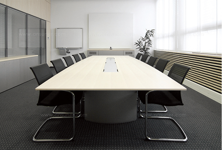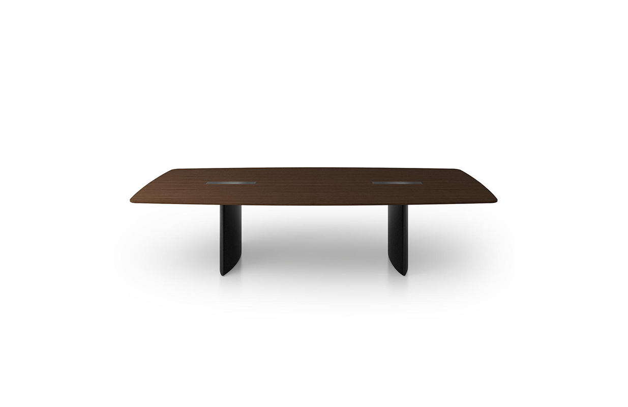 船形或椭圆形为基本形状的高级会议桌。优雅的外形之下,椭圆形、直线形桌腿或整体的桌下机构,可完美收纳走线及隐蔽多媒体设备。中央多媒体槽完美的整合了投影设备和多媒体接口。表面材料可选白色特殊树脂,实木贴面,烤漆和层压板。