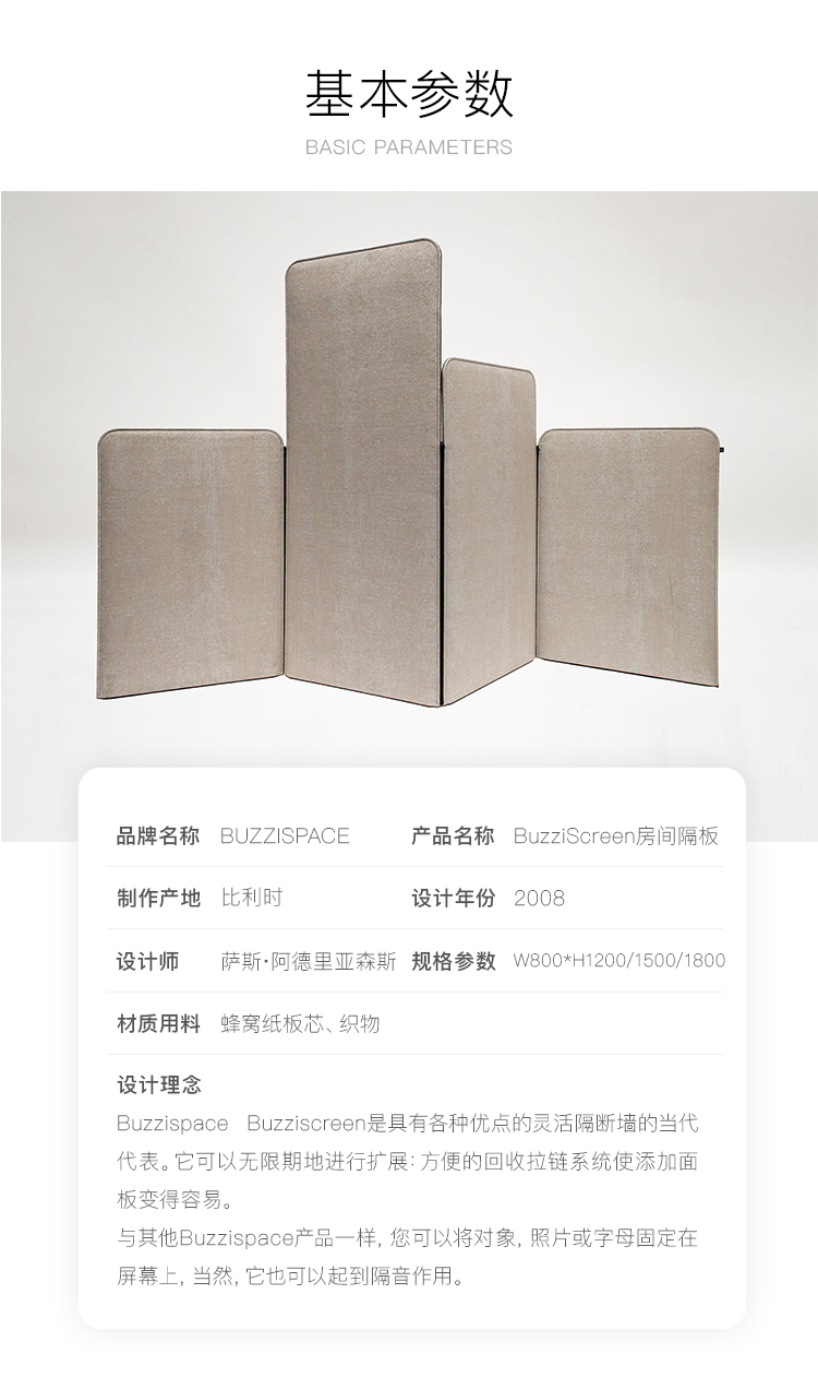 Buzzispace Buzziscreen是具有各种优点的灵活隔断墙的当代代表。它可以无限期地进行扩展:方便的回收拉链系统使添加面板变得容易。 与其他Buzzispace产品一样,您可以将对象,照片或字母固定在屏幕上,当然,它也可以起到隔音作用。