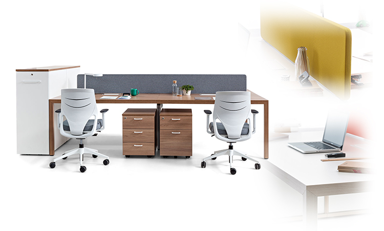三聚氰胺制成的桌面由50mm ABS塑料封边,软垫形的隔音材料屏幕固定在办公桌面上,提供“T”、“M”和“F”等类型织物以供选择