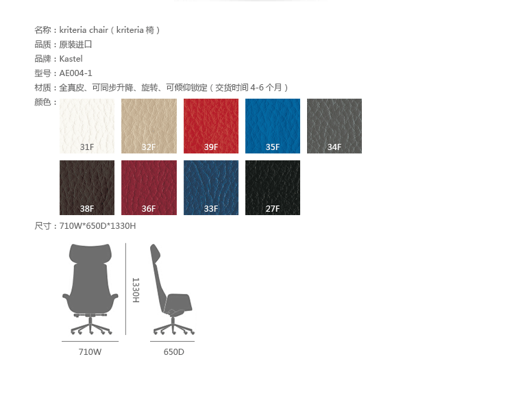 Kastel是一个在室内装饰领域极具影响力的公司,该公司具备高水平的综合生产能力,是一个充满活力的公司。Kastel公司产品多种多样,包括办公座椅,社区座椅和家庭座椅等等。Kastel在对人体工程学进行深刻研究之后,制定了现在的生产线,产品的设计以舒适为主,在生产过程中每一步都严格遵循这一宗旨,为客户提供高性能的产品,满足客户对舒适的基本要求。这也是Kastel公司的经营理念。kimera系列办公椅采用全真皮扪面、可同步升降、旋转、可倾仰锁定,符合人体工学,高档舒适,是办公,会议的理想选择。