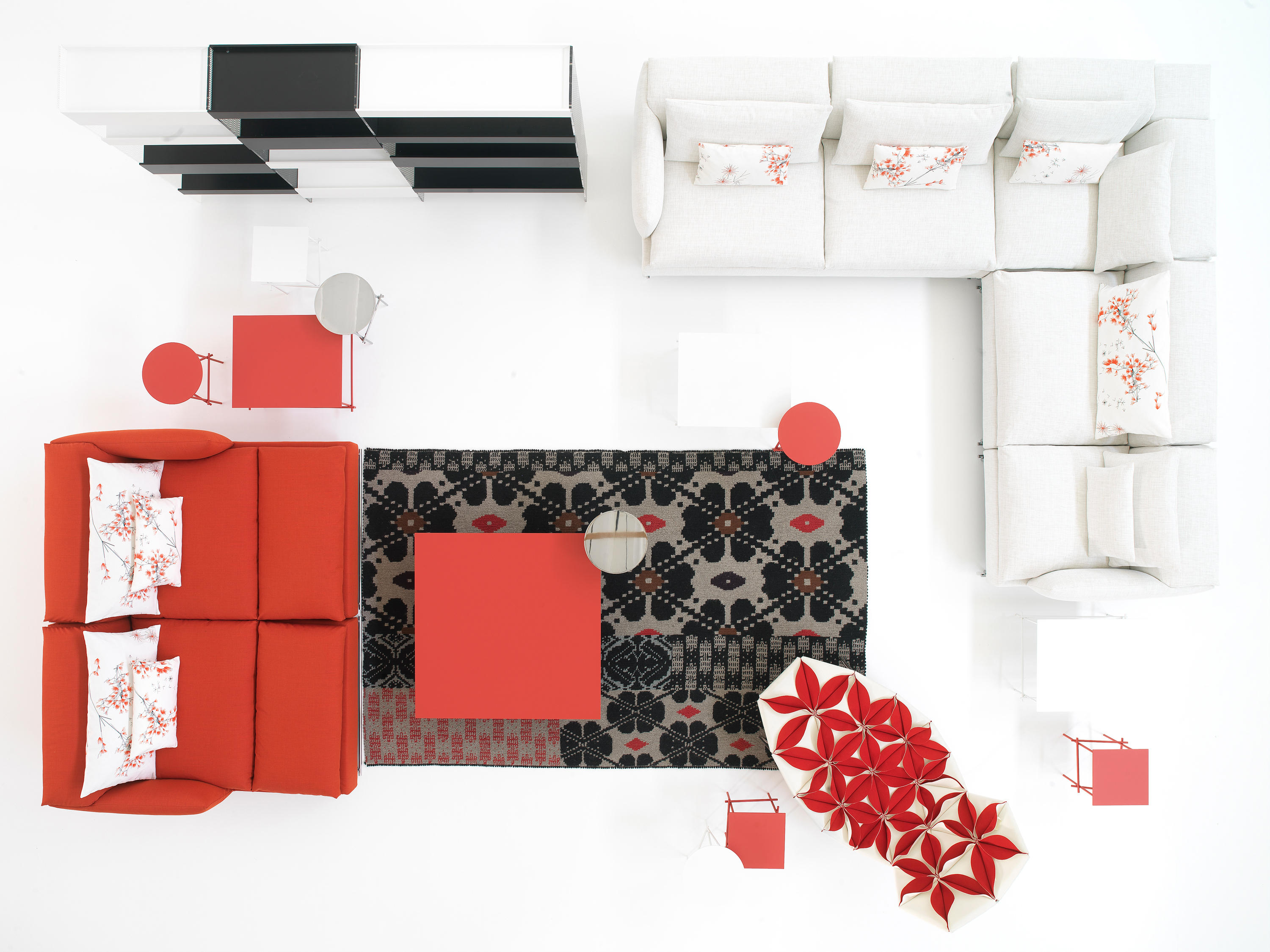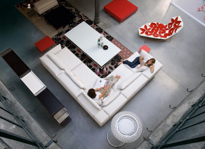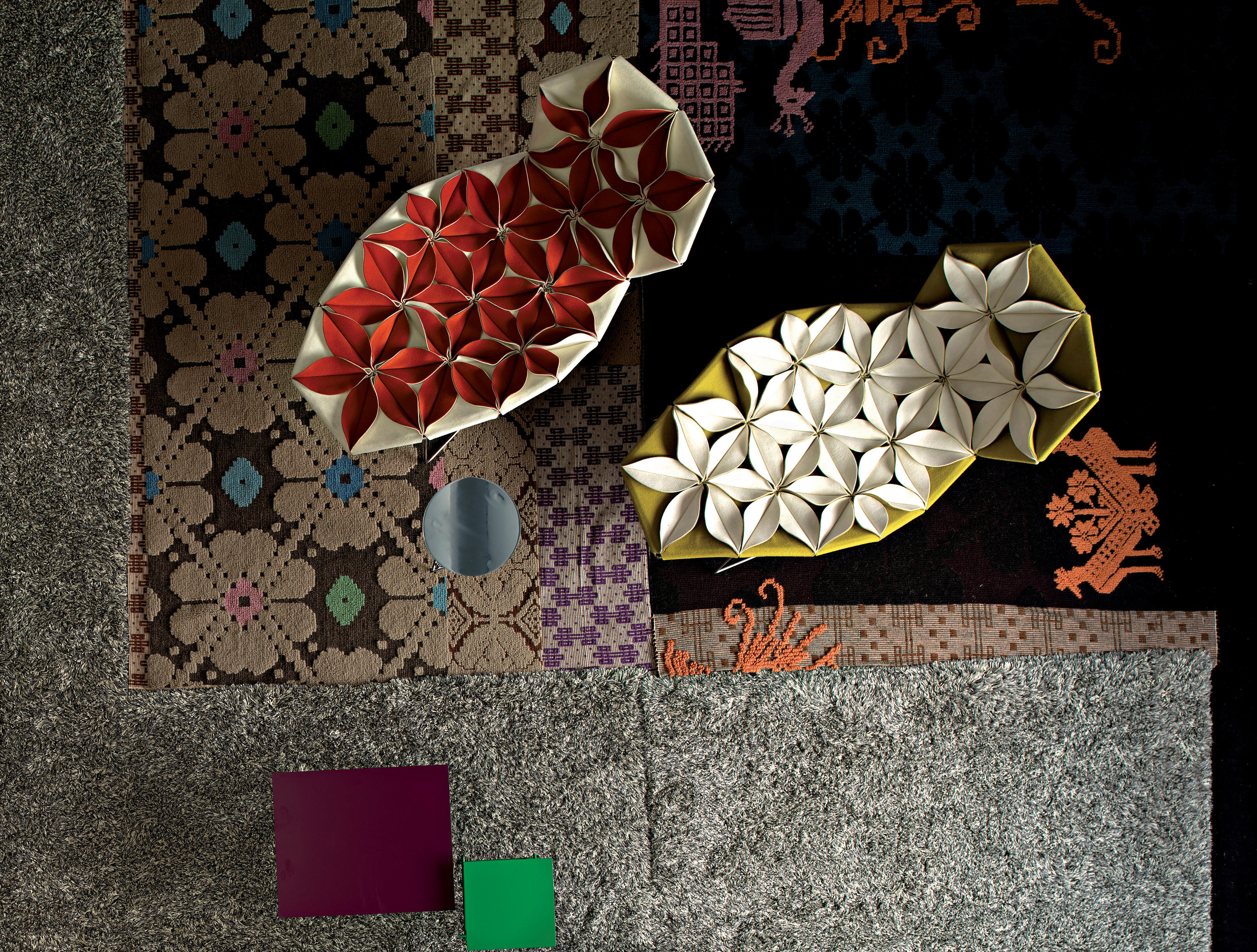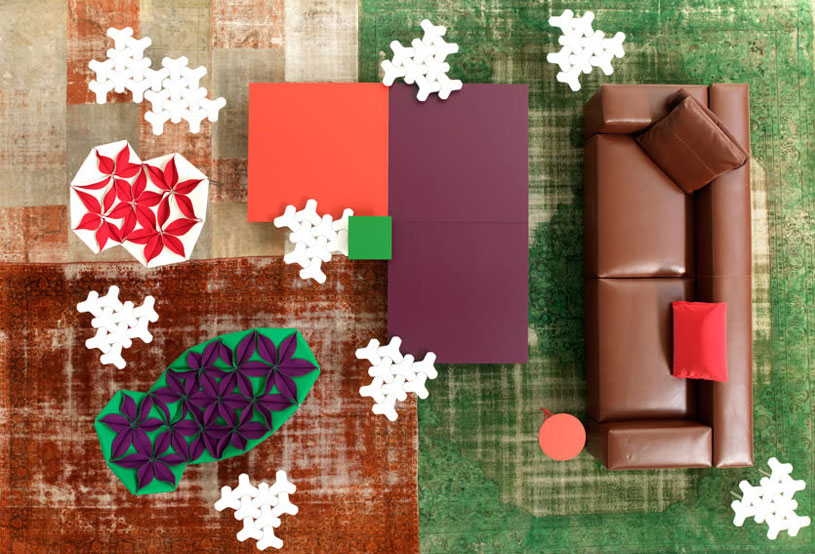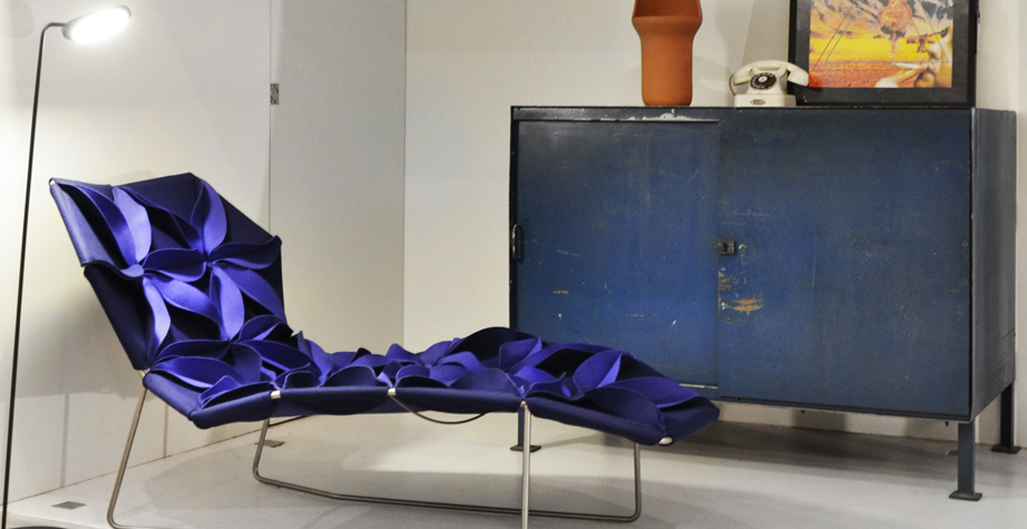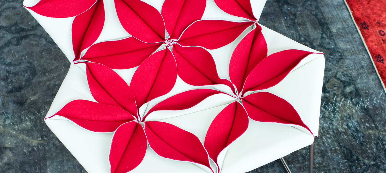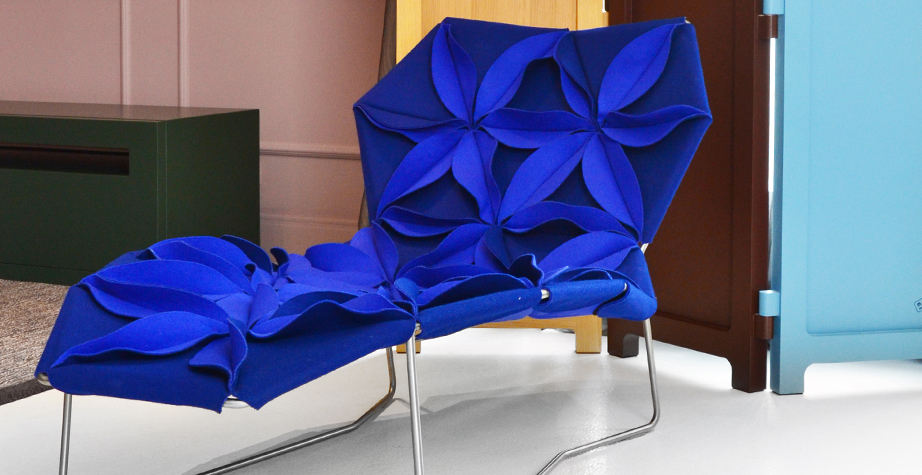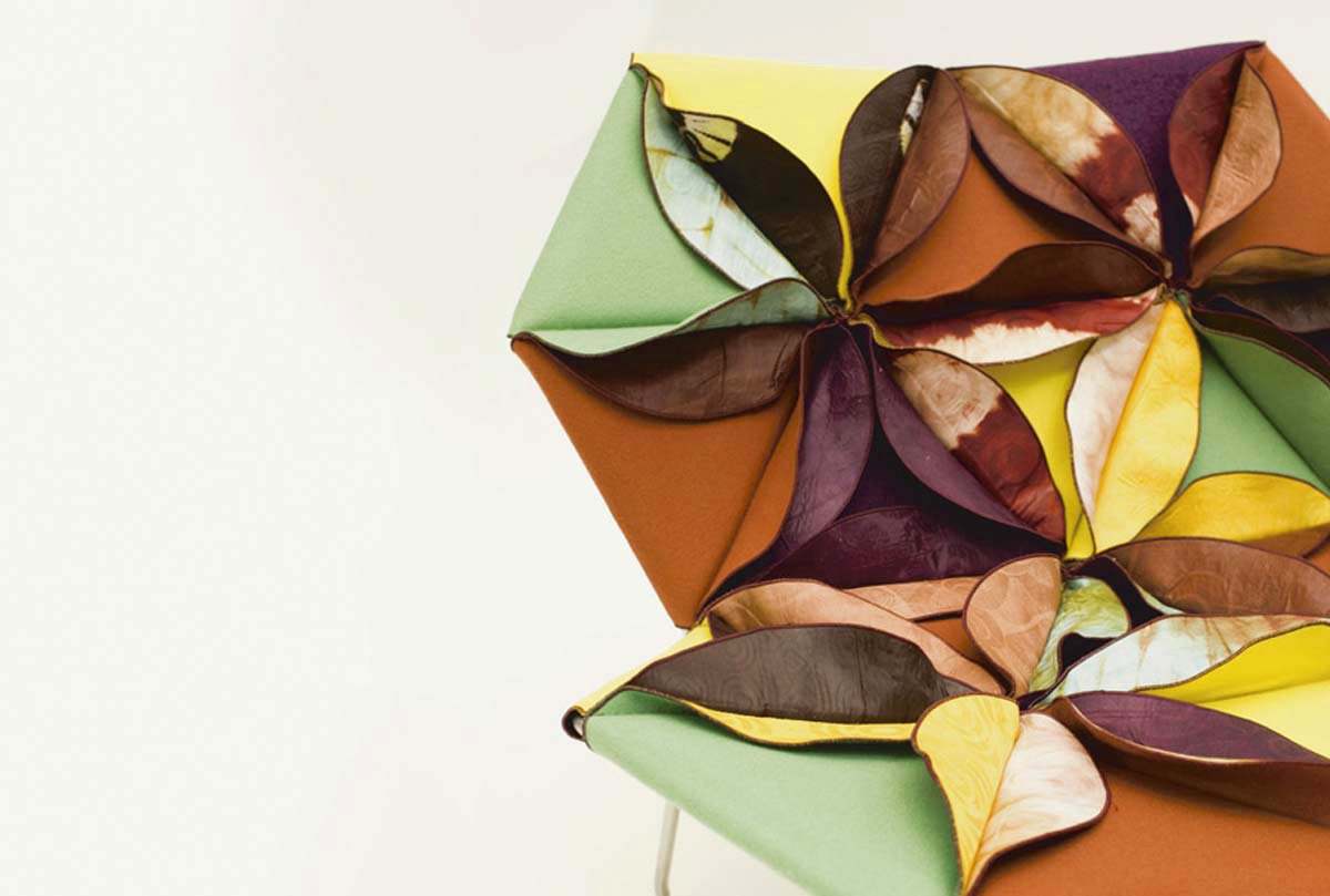 Antibodi 是 Patricia Urquiola 從一個花朵盛開的概念所創作的椅子,蜂窩式三角形花瓣串連縫製而成花朵散播在椅面上,片片花瓣的外型和多層次的材料,衍伸出豐富的圖案。
