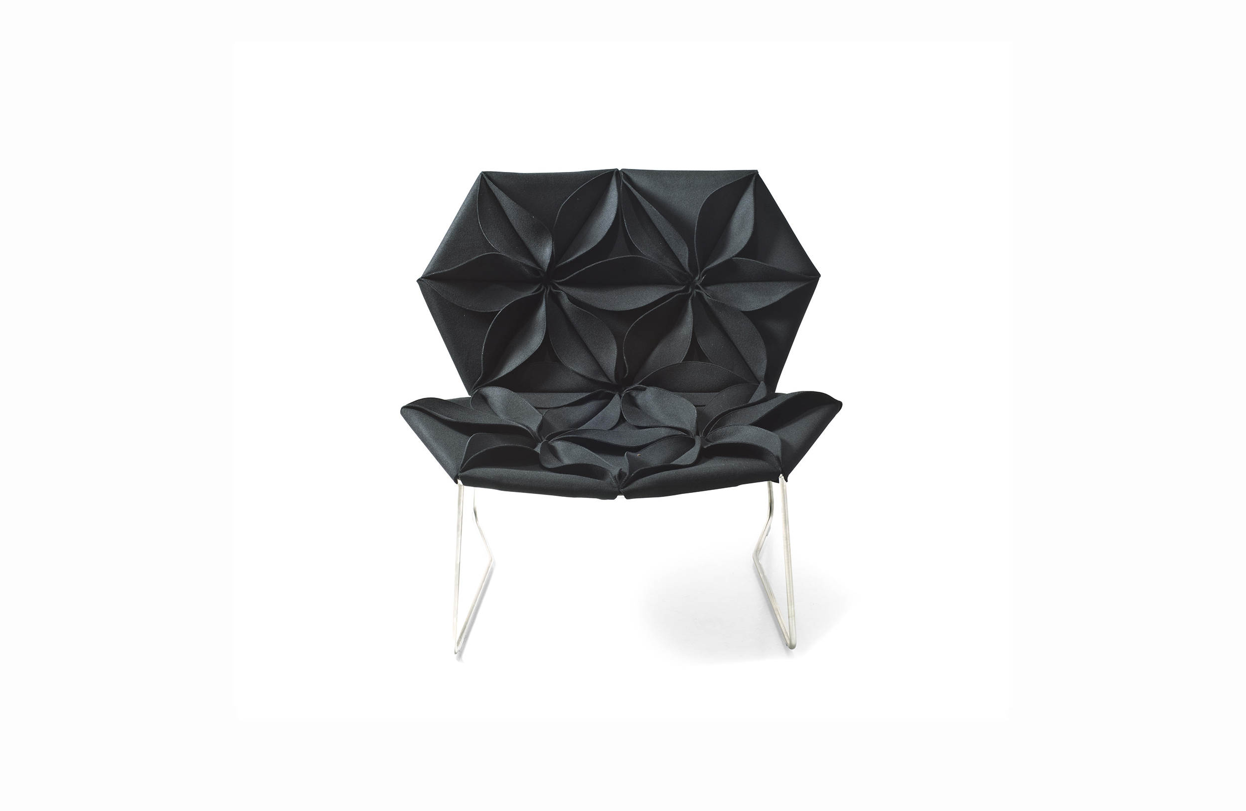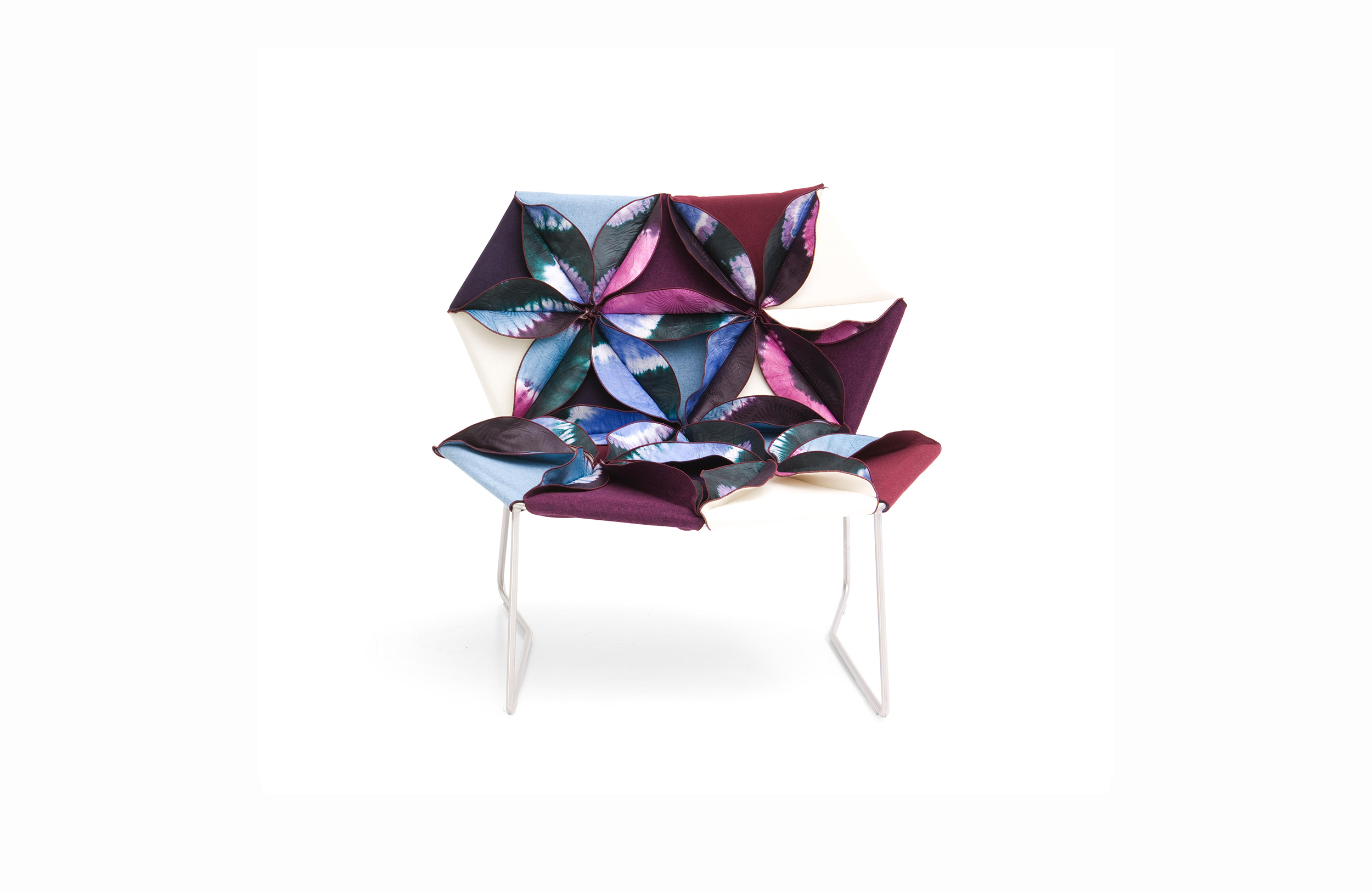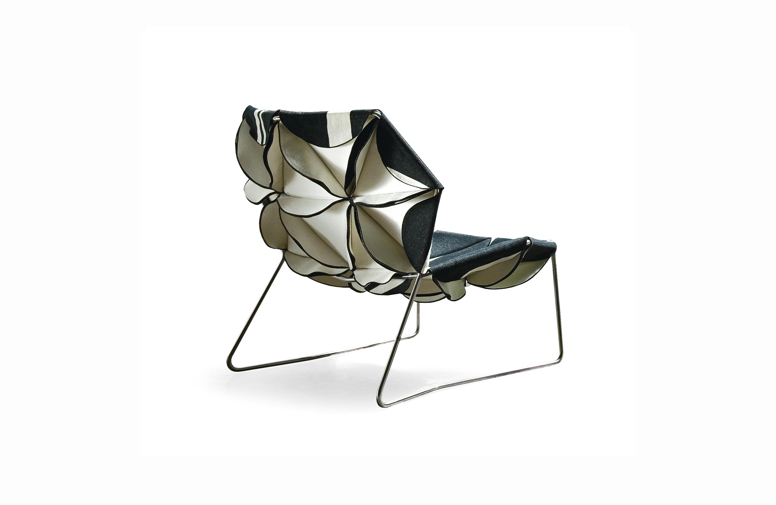 Antibodi 是 Patricia Urquiola 從一個花朵盛開的概念所創作的椅子,蜂窩式三角形花瓣串連縫製而成花朵散播在椅面上,片片花瓣的外型和多層次的材料,衍伸出豐富的圖案。