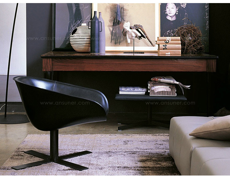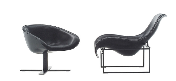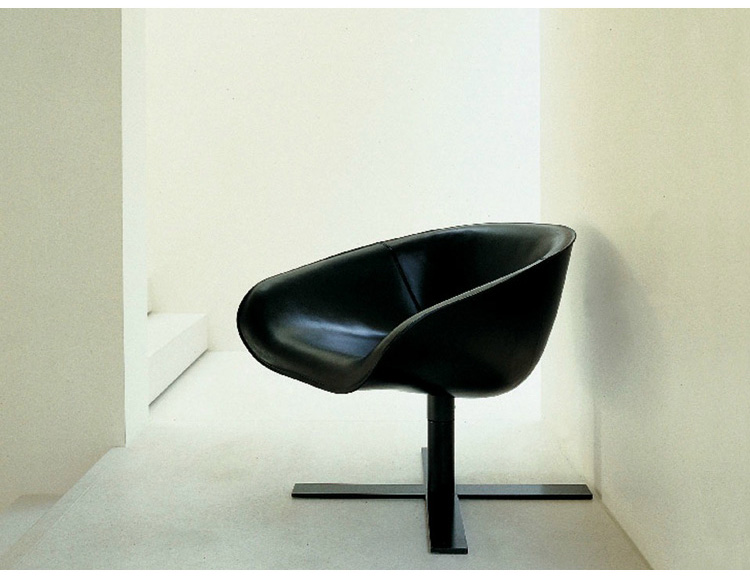 由于一项加热成形皮革生产技术,经过实验以及调研,我们推出了马特椅。它有两种类型的座位可供选择:一个较小的款型和较大的款型。这两种款型的版本都提供一个可旋转圆盘状铝基。面料可选黑色纤维织物或浸漆皮革。还有一种类型的脚架是十字形的。脚架镀明亮的铬抑或黑色涂漆不锈钢。它们都配有脚轮,可转动,并配以舒适的坐垫,坐垫为热成形皮革或者纤维面料。