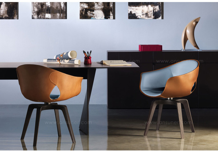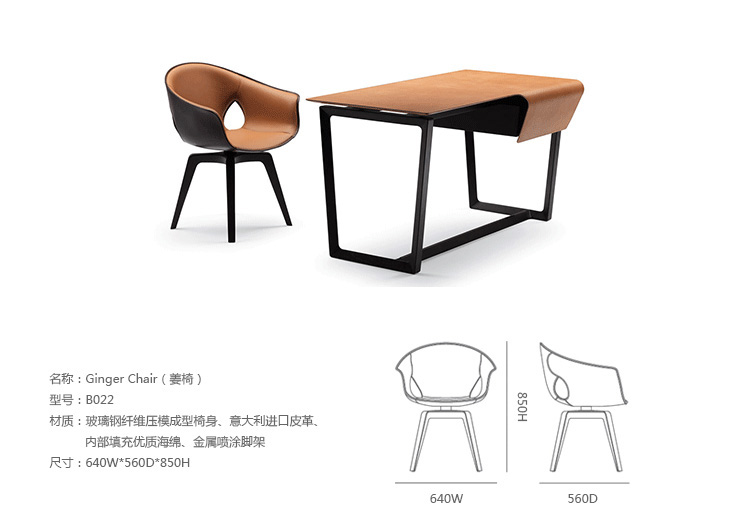 柔软的皮革外壳,舒适和保护。一个精致和简单的安乐椅。整齐的,必要的,舒适的。罗伯托-拉泽罗尼设计的姜椅既是一个自然的伴奏弗雷德办公桌,并作为一个单独的座位。旋转的版本是完美的一个研究领域,而固定的模式是理想的餐桌。有一个在设计,用料和做工姜椅和弗雷德之间的引用的持续发挥。姜椅的框架是在特殊的刚性,高密度,低厚度,模塑聚氨酯。深棕色或骆驼:它完全在两个变体涵盖5毫米厚的鞍皮革外,单层。所述框架的内表面覆盖在佩尔Frau®颜色系统中创建色彩和材料之间有吸引力的对比。技术娴熟的皮件也可以看出,在珍贵的细节,例如沿外边缘运行可见明缝,形成一个优雅的装饰效果。座位塞满了聚氨酯泡沫。该基地有四条腿的鸡翅木色固体的白蜡木用三角轮廓。用于固定帧的支持是在黑色涂钢和旋转模型允许一个360°的旋转。