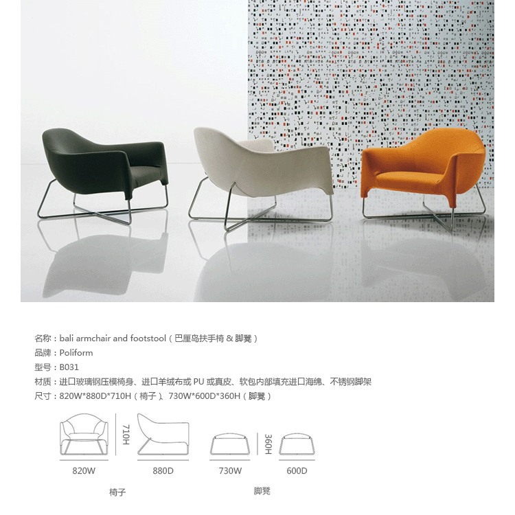 Bali Armchair(巴厘岛扶手椅)系列家具由著名设计师Carlo Colombo为Poliform所设计,包括扶手椅和脚踏。该系列家具根据最新的美学设计提供松弛的居坐度。制作采用光滑的不锈钢金属框架,进口玻璃钢压模椅身,高级羊绒布或PU或真皮、软包内部填充进口海绵,提供了绝佳的舒适度,是模块化及功能化的有机结合,提供多功能性的使用方式,与任何家具配合度都非常高。