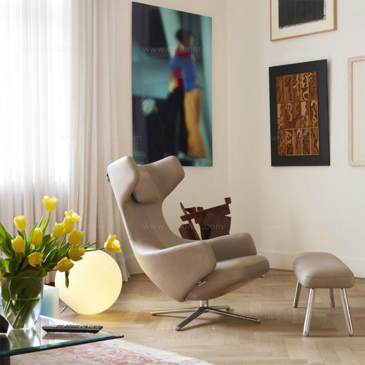 “grand repos lounge chair and ottoman(grand repos 休闲椅&脚踏)由设计大师Antonio Citterio所设计的独特的,绝无仅有的休闲椅系列,椅子的创作面临的挑战如同伊姆斯夫妇当初设计著名的伊姆斯休闲椅一样,但正因如此,才能成为绝世经典。grand repos系列休闲椅采用钢制铝合金脚架、聚氨酯海绵填充、高级布艺扪面,可随意调整坐姿和高度,也可以放平躺,配上舒适的羽毛衬垫,无论阅读或者休憩,都非常舒服,符合人体工学,高档舒适,是办公,会议的理想选择。意大利设计师和建筑师 Antonio Citterio赋予了这边椅子永恒的优雅气质与无与伦比的舒适,是当代设计的经典,无论用在办公、商业、家庭都是非常高贵大气的。”