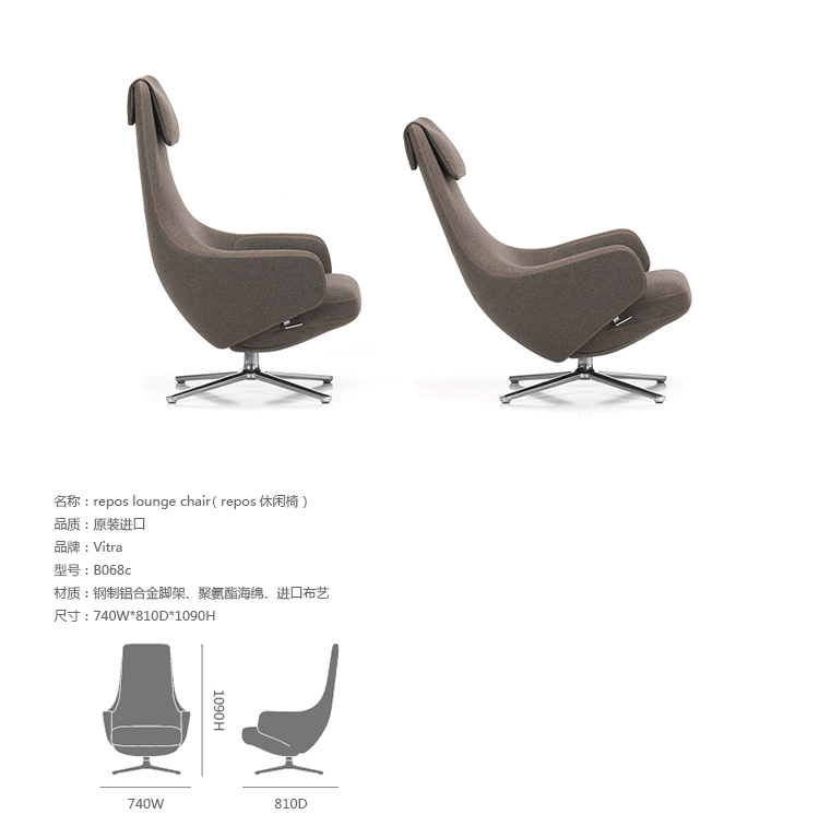 repos lounge chair and ottoman(repos休闲椅&脚踏)由设计大师Antonio Citterio所设计。repos系列休闲椅采用钢制铝合金脚架、聚氨酯海绵填充、高级布艺扪面,可随意调整坐姿和高度,也可以放平躺,配上舒适的羽毛衬垫,无论阅读或者休憩,都非常舒服,符合人体工学,高档舒适,是办公,会议的理想选择。意大利设计师和建筑师 Antonio Citterio赋予了这边椅子永恒的优雅气质与无与伦比的舒适,是当代设计的经典,无论用在办公、商业、家庭都是非常高贵大气的。