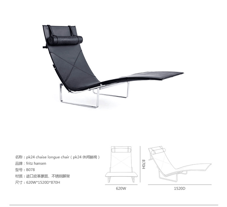 PK24 Chaise Longue Chair(PK24休闲躺椅)是著名的设计师 Poul Kjaerholm设计的经典作品,是Fritz Hansen公司的“Poul Kjaerholm系列”之一。 PK24躺椅(PK24 lounge chair) 是一款经典设计,功能结构的底座结合优美悬浮的座位,椅子的主要部分没有物理上的连接,但并没破坏整体设计的平衡和稳固性。覆盖牛皮的座垫包装了舒适的躺椅特征。带有曲线的不锈钢架为座垫提供了稳固的支撑,同时带来艺术美感。