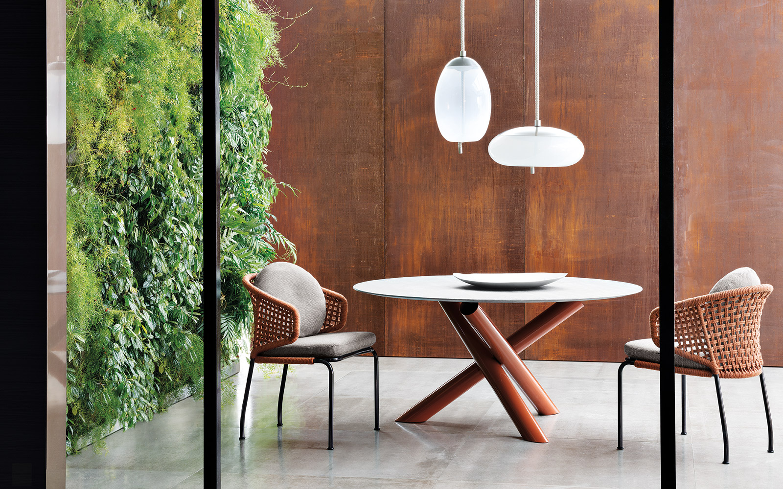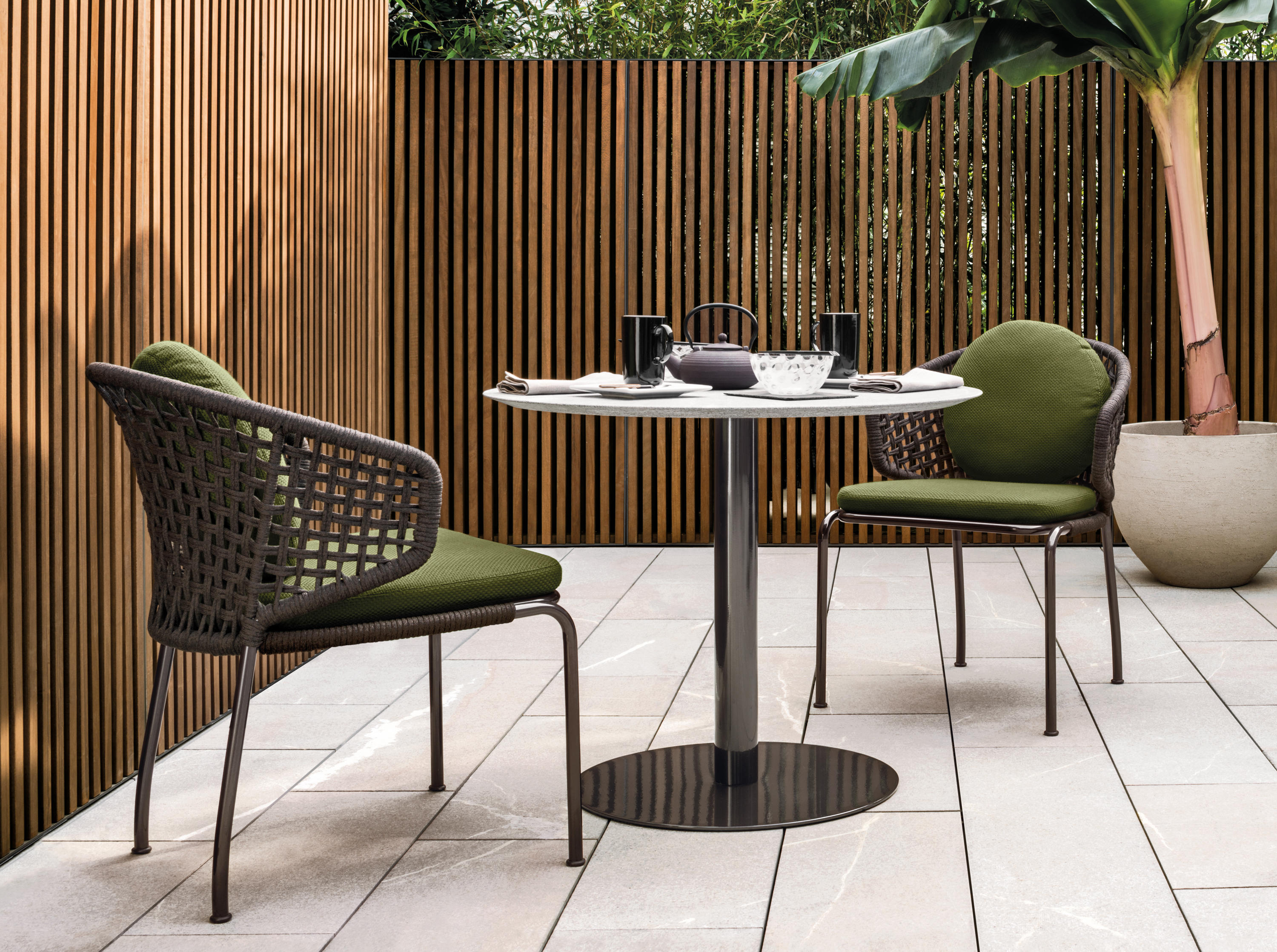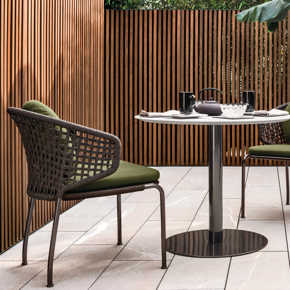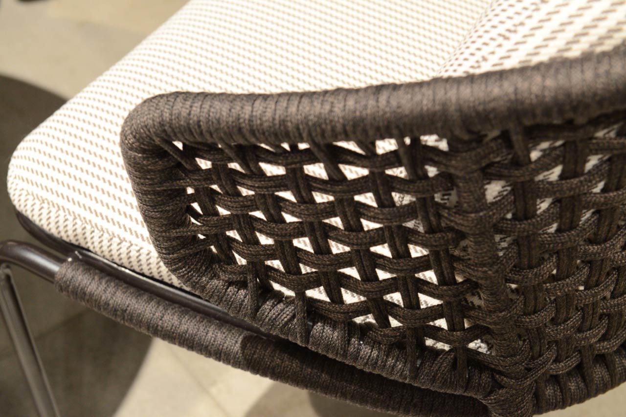 Aston是一个单品家族系列,其中包括沙发、沙发床、扶手椅、脚凳、座椅,为家居环境和“共享空间”提供优雅而时尚的装饰,在室内和室外皆可应对自如。阿斯顿“绳”户外系列采用金属材质的构架,搭配Pewter色聚酯漆面,部件都针对户外环境而经过特别处理,覆面采用疏水性纤维面料。靠背采用直径为7毫米的特殊聚丙烯纱线编织而成,两种颜色可供选择:浅灰色和深棕色,与全新Art Lifescape 02系列的面料和Alison “Dark Brown”户外系列的色调相得益彰。针对户外环境的特点,金属构架经过特别处理,搭配Pewter色聚酯漆面,覆面采用特殊聚丙烯纱线编织而成,有两种颜色可供选择:浅灰色和深棕色。坐垫采用Minotti Studio独家设计并通过激光加工而成的几何装饰。靠垫的内部填充物是高弹性聚氨酯泡沫,覆面采用疏水性纤维面料。