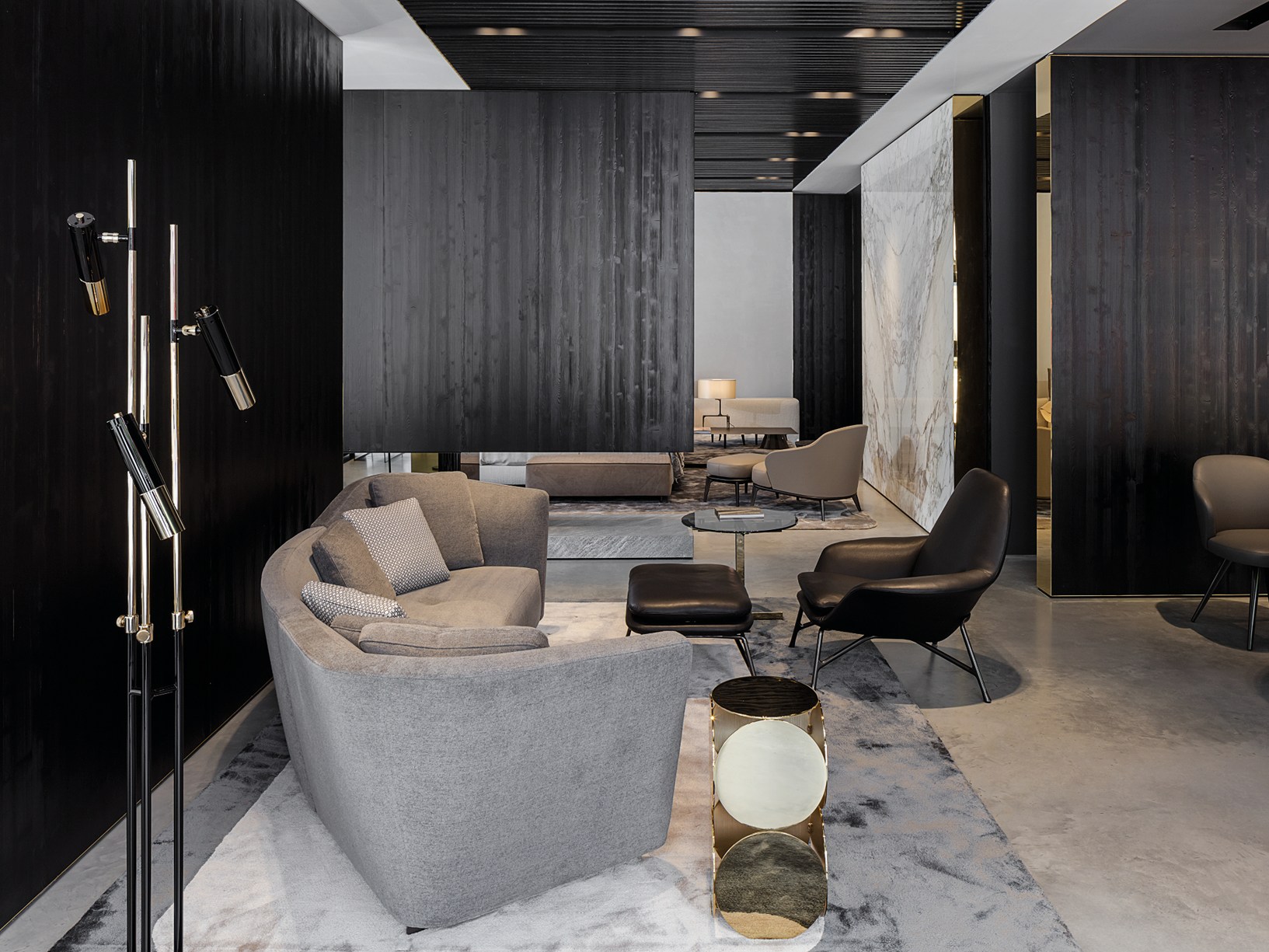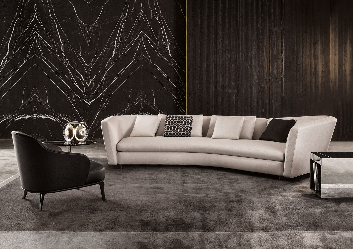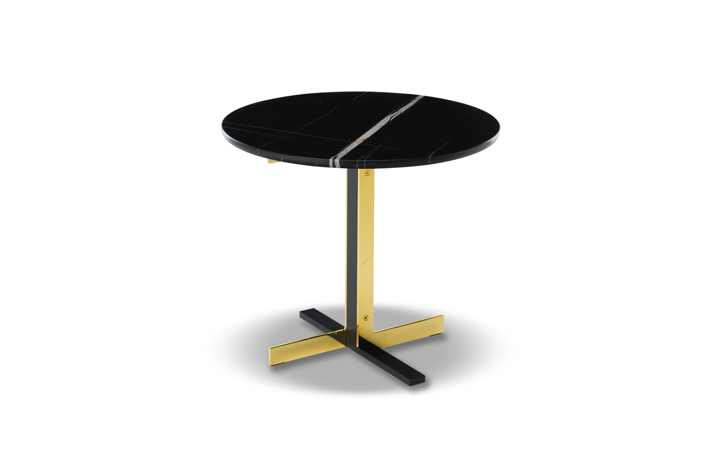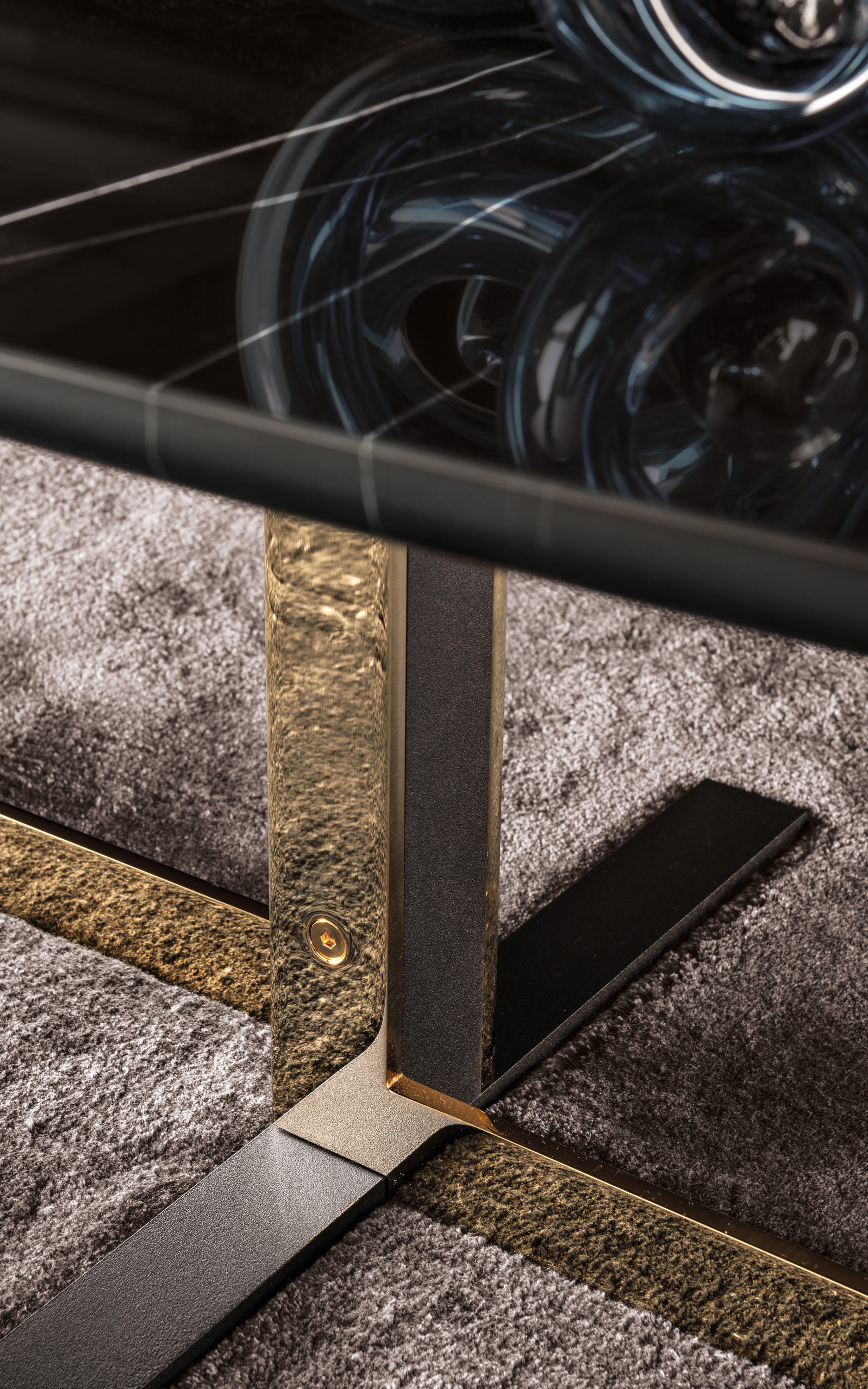 这组边几系列简洁洗练,材质的选择展现出精致的典雅。如果说Catlin边几的设计崇尚简洁,那么材质的选择则旨在打造非凡的视觉和触觉效果。金属基座有着精致的十字形地面支撑腿,其中包括颇有趣味的组合:黑色压花搭配铬色或金色的抛光表面,打造出多种多样的风格。材料的搭配体现出非凡的优雅感,台面可以选择烟灰色的玻璃材质,或是选择两种珍稀名贵的大理石,Arabescato Purple或Sahara Noir,两者都拥有抛光表面。Catlin系列有圆形和椭圆形两种造型,有不同的尺寸可供选择,正如边柜和餐桌一样有多种类型。