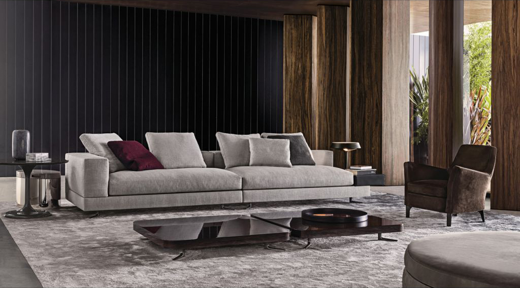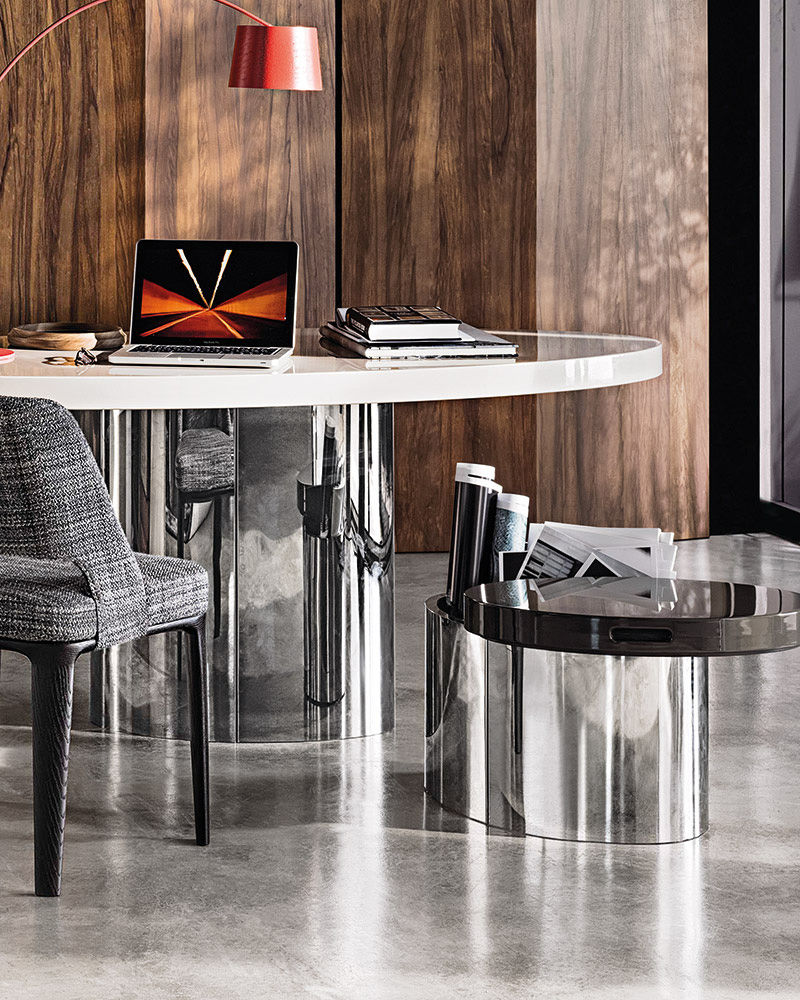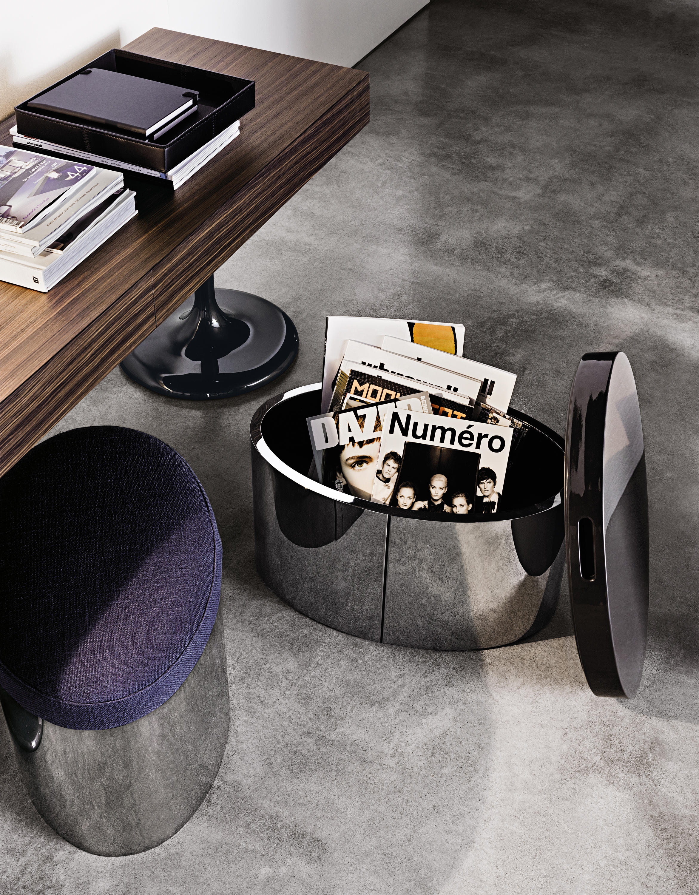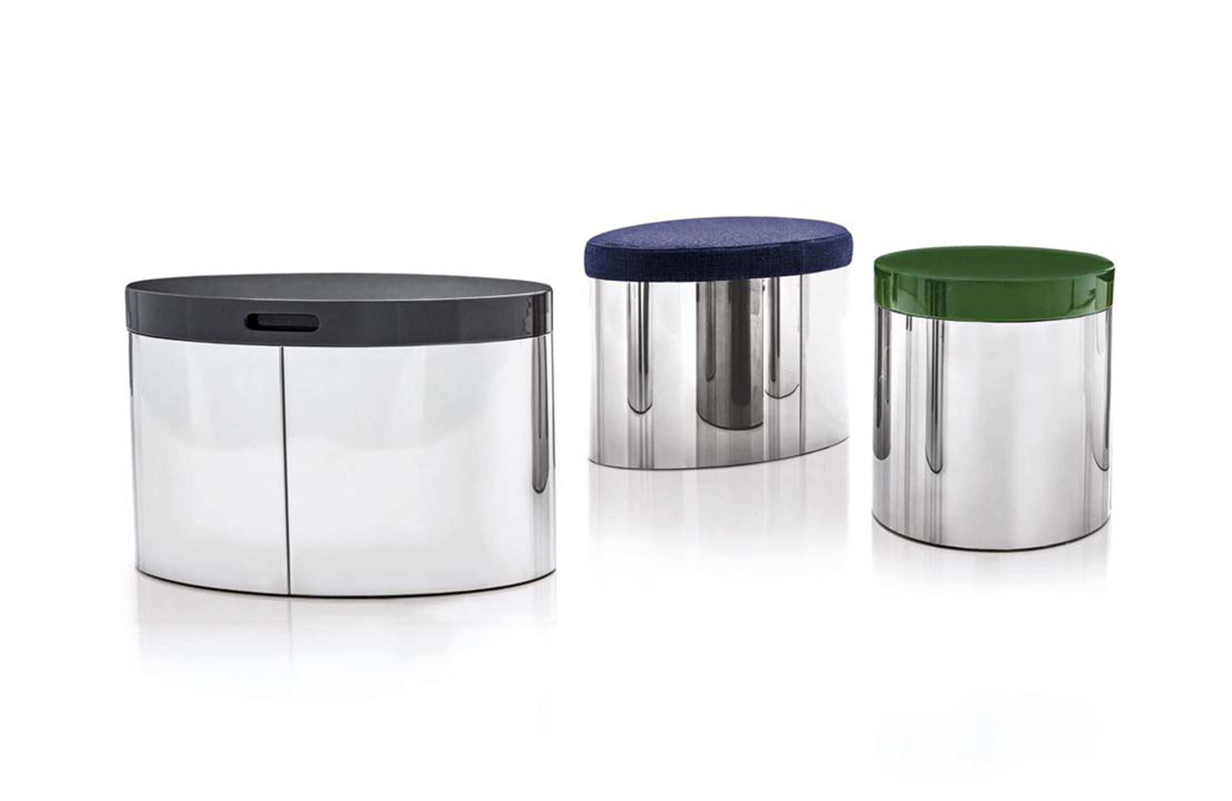 这款产品属于Raymond系列,但是又自成风格,可以作为边几也可以成为座椅,其内部还有一个极为实用的杂志收纳空间。收纳凳的底部为黑色皮革饰面,印有Minotti的logo。上方部件采用亮光漆面,颜色为白色、Sand色、花岗石色、绿色和紫色,搭配实用的椭圆形内嵌手柄,以此可轻松提起顶盖。休闲凳版本的上方部件则添加填充物,包覆Minotti独家系列中的布料和皮革。