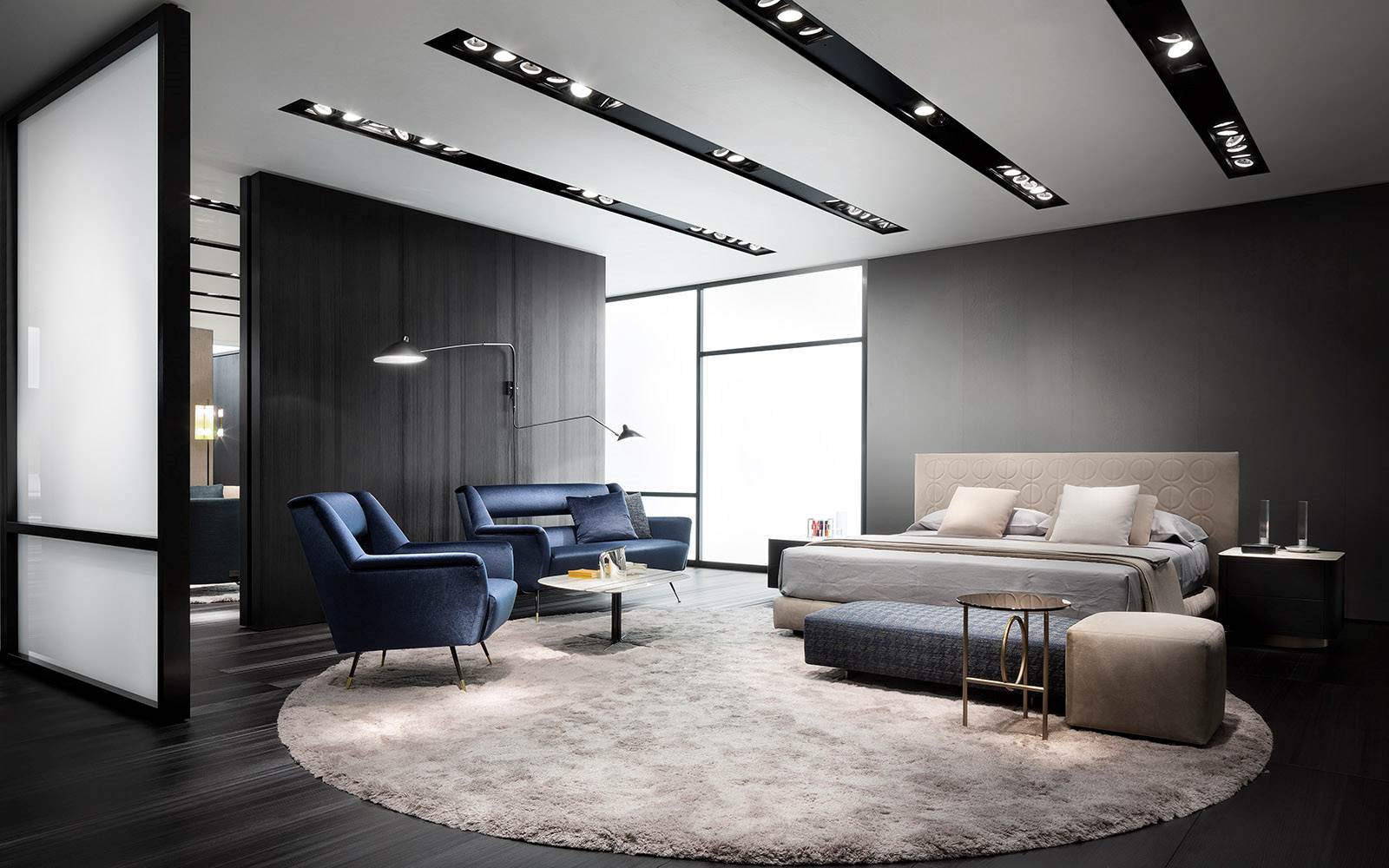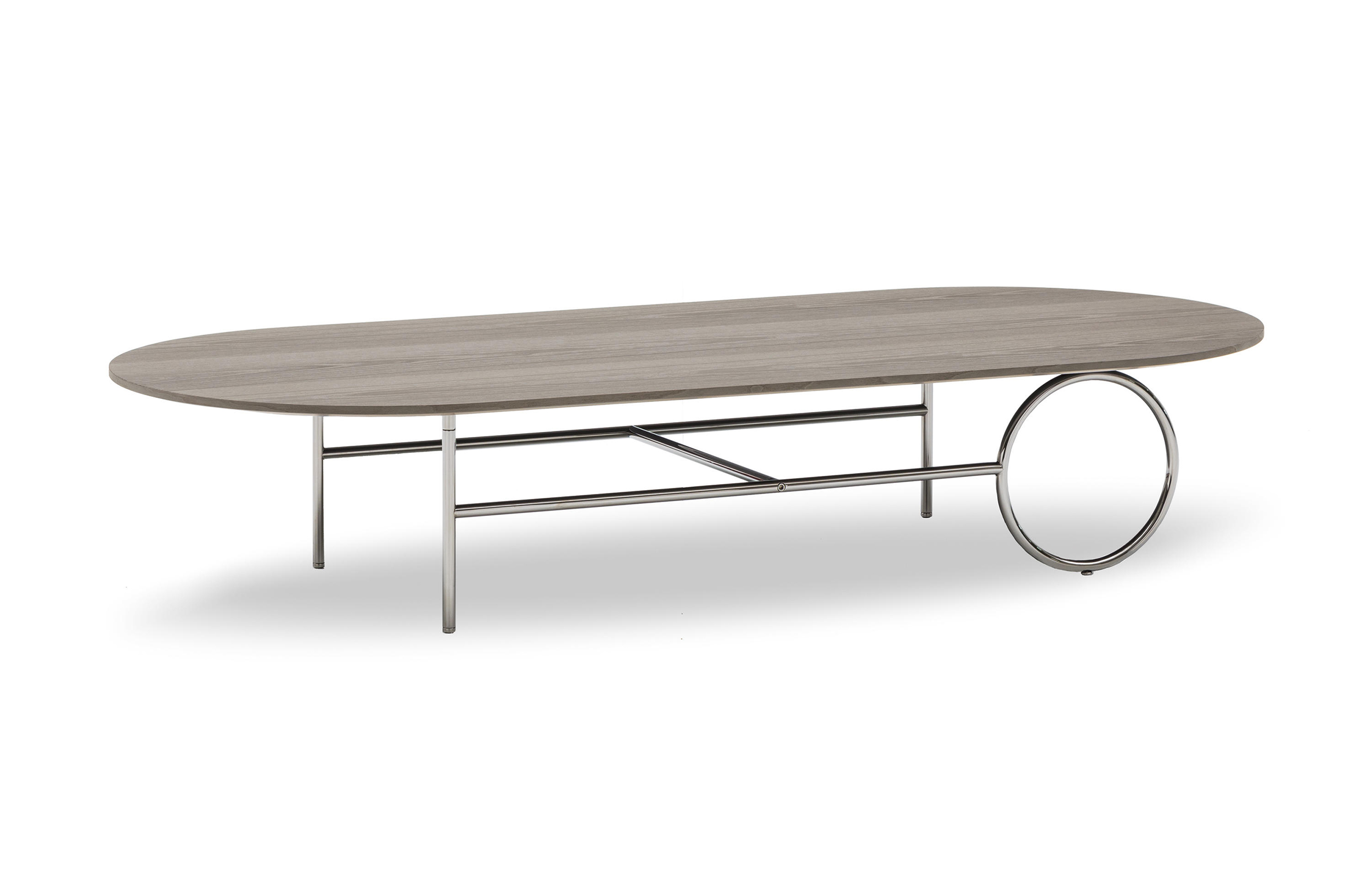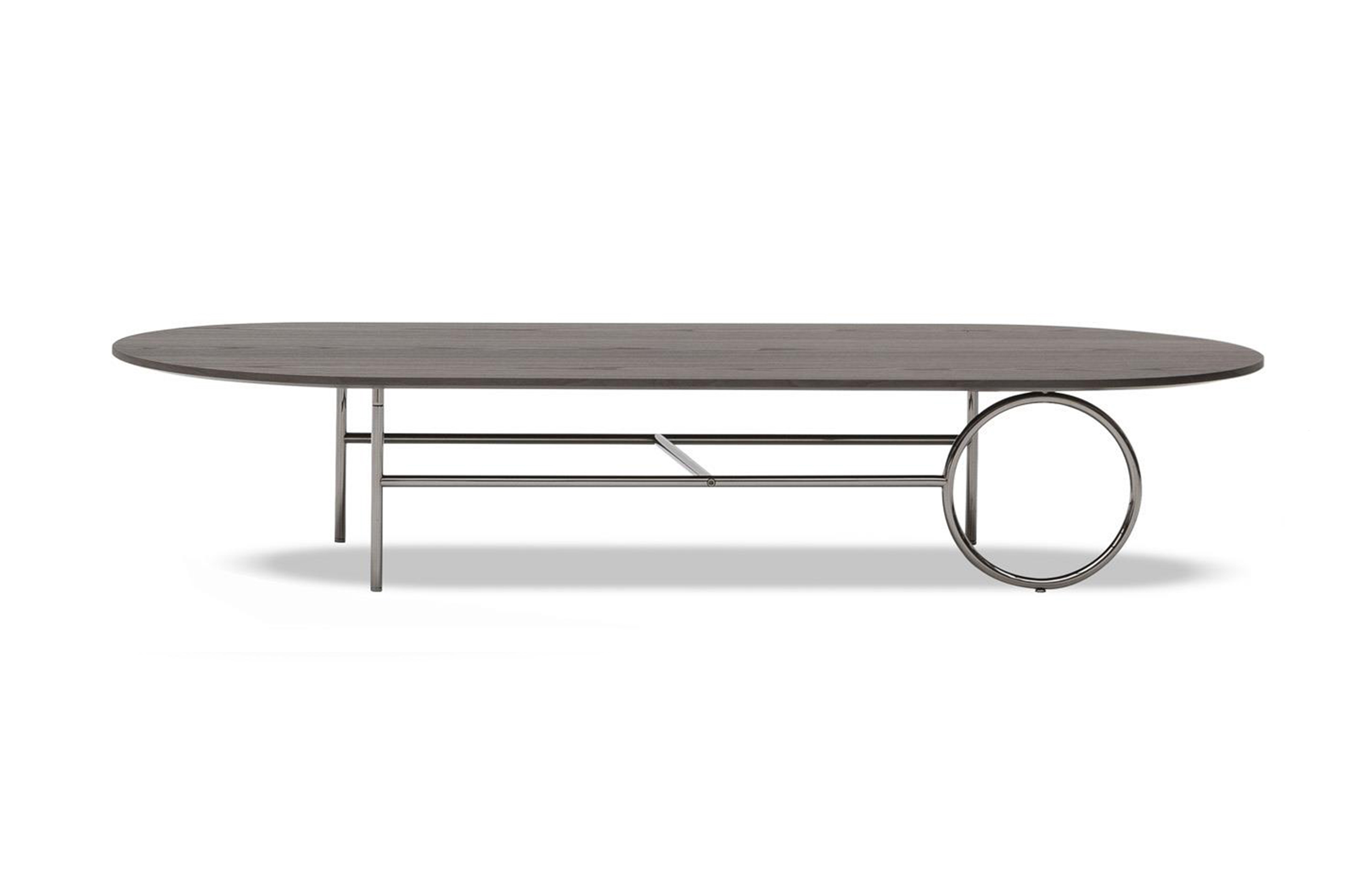 由正交线定义的轻金属结构的设计被大环打断,放置在不同的位置。除了打破轮廓的几何规律性外,圆形,取决于桌子的大小,成为连接或支持元素。眼睛被光环中心的空虚所吸引,产生了空间和轻盈的效果。