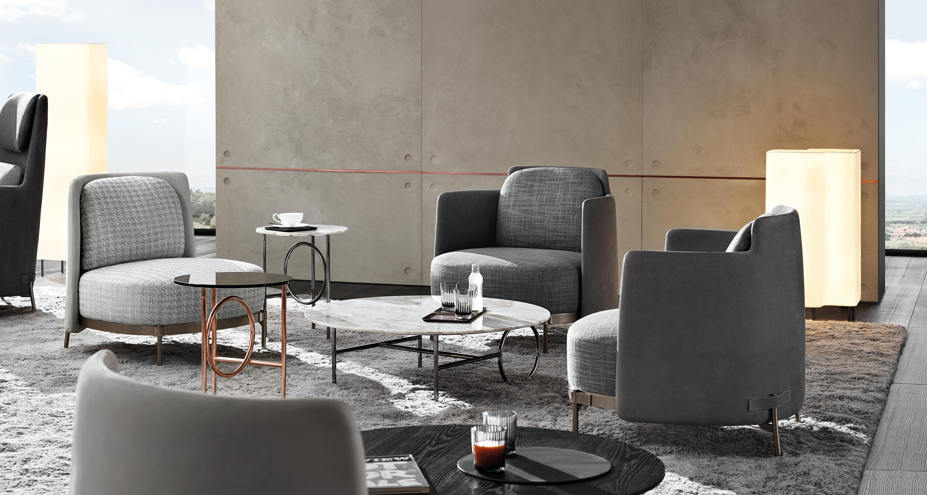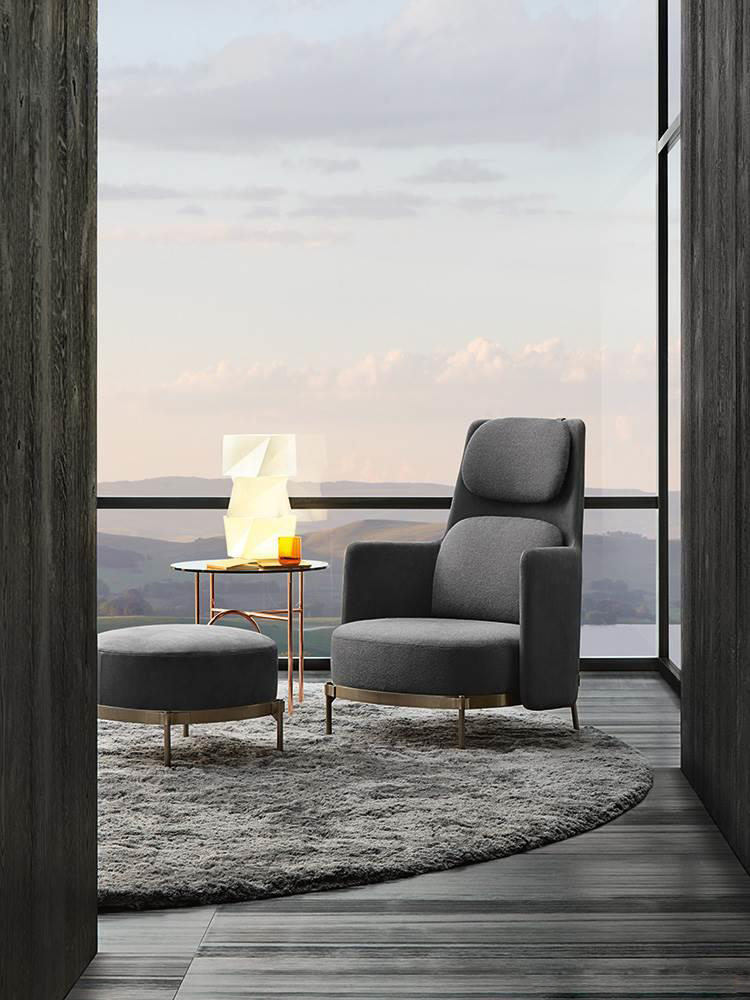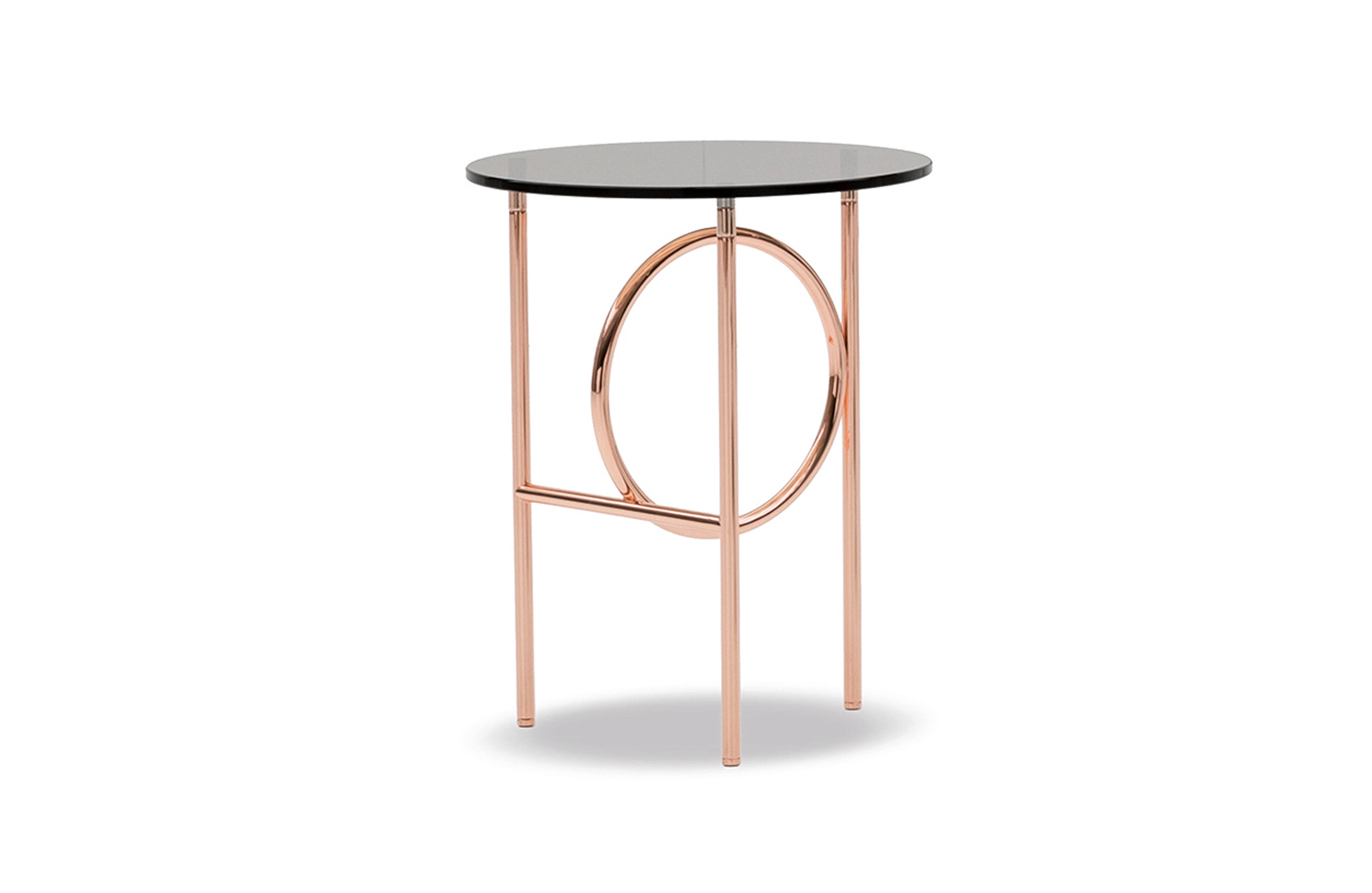 这种金属框架,有轻青铜、铜或黑镍,有不同的高度。圆桌由椭圆形或圆形顶部完成,直径不同,可在青铜玻璃、卡拉卡塔大理石或甘草刷灰中定制。