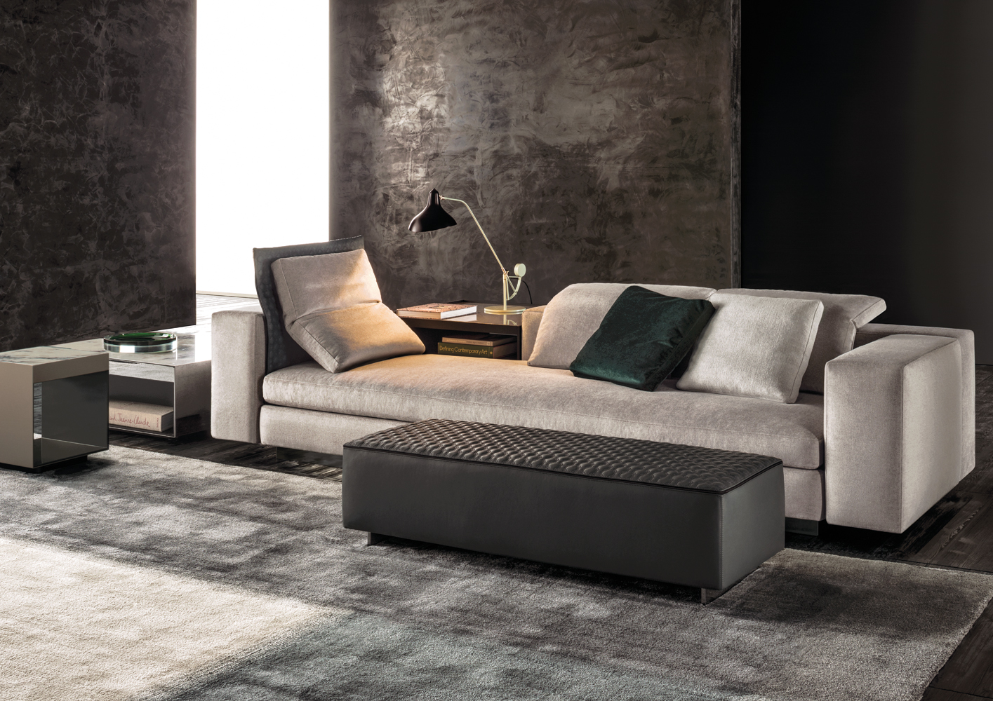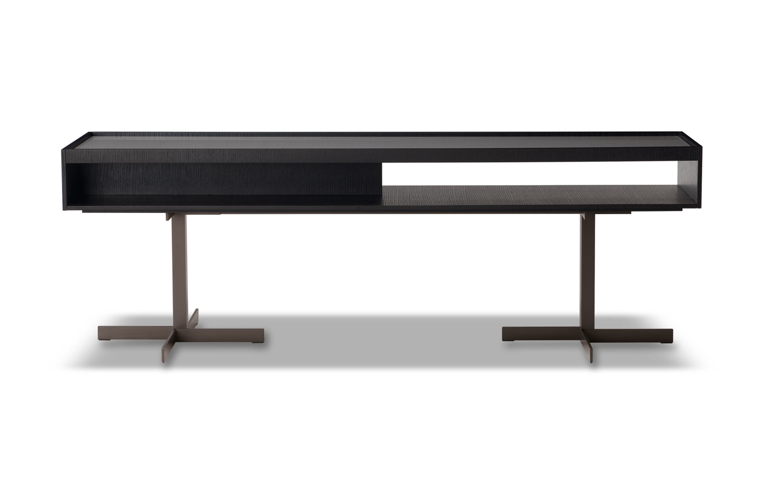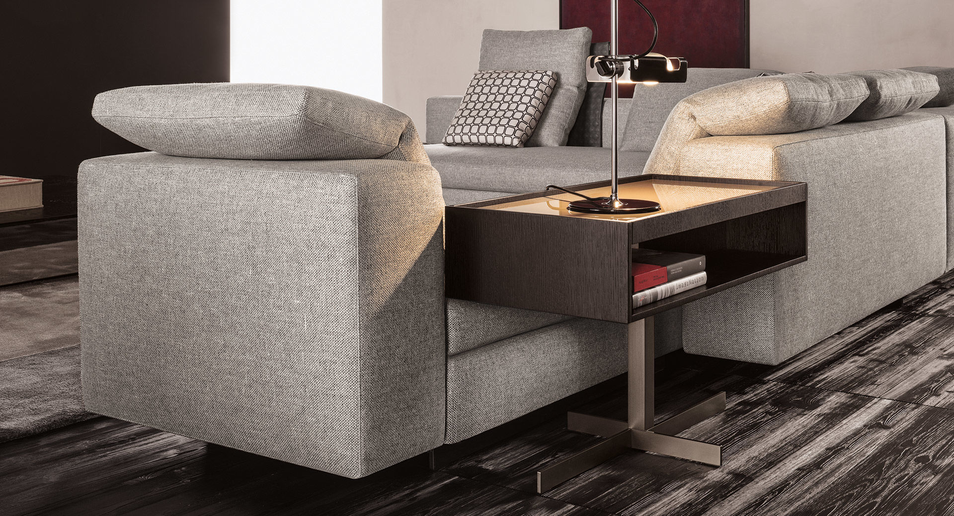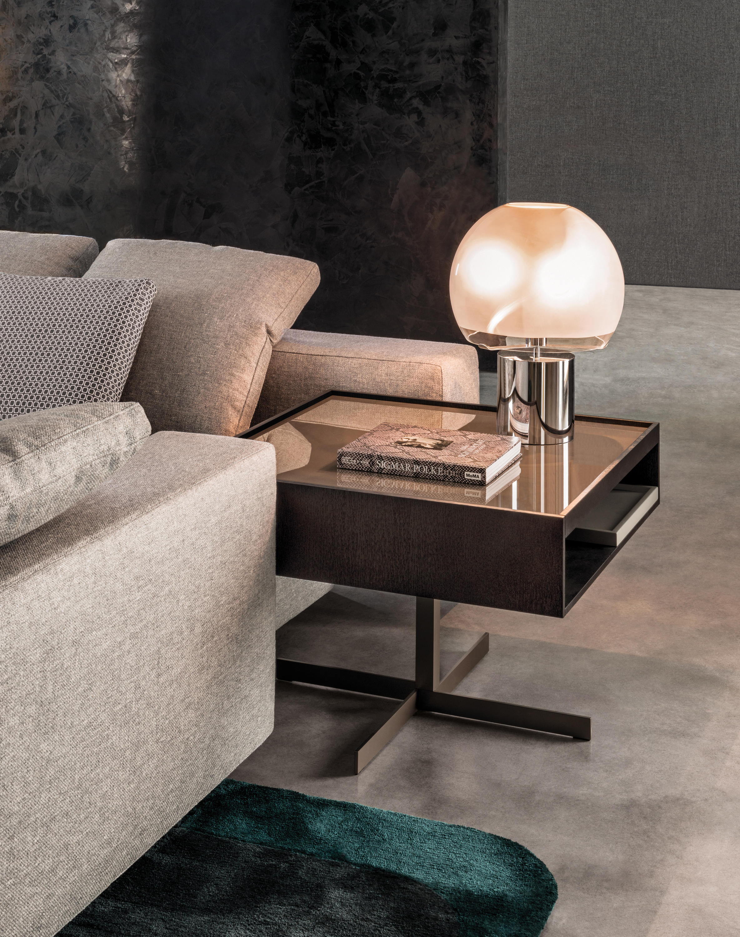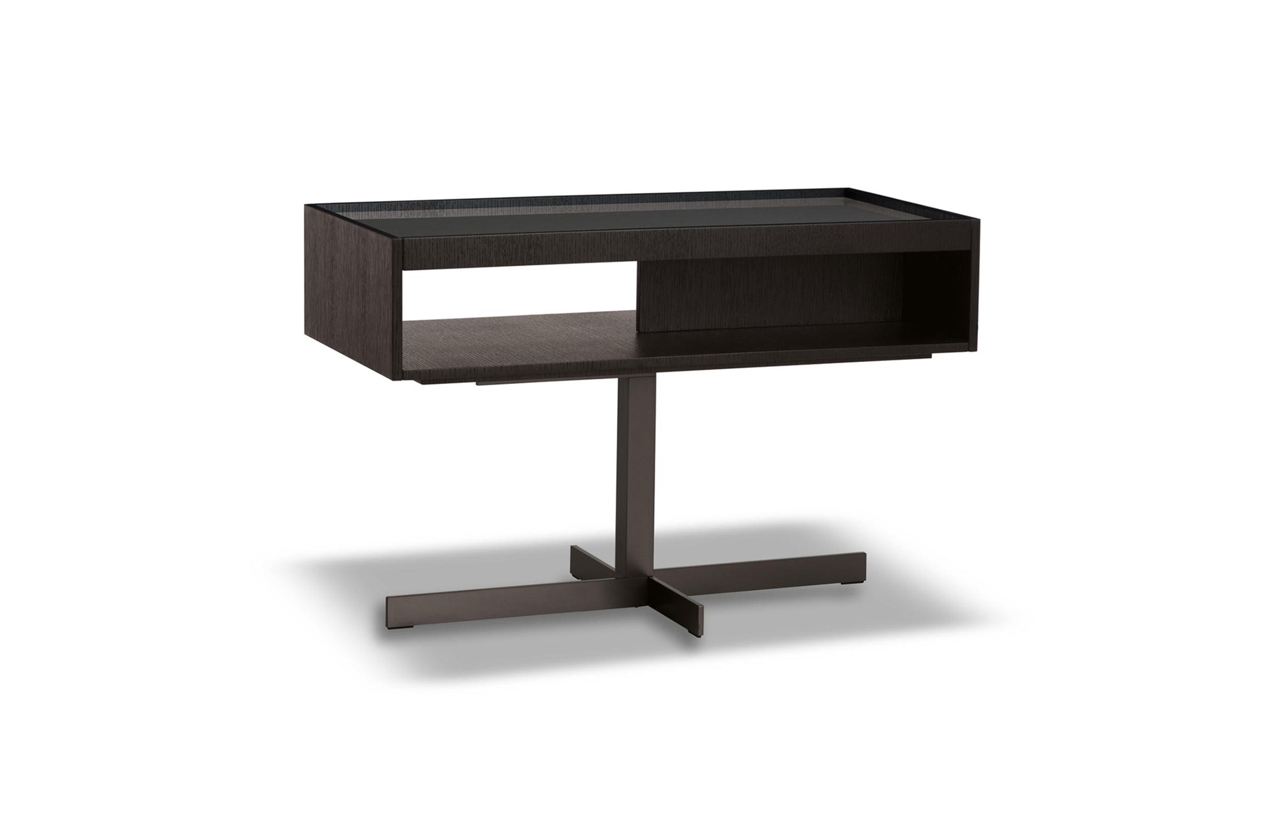 克洛塞边几特别为搭配Yang沙发系列而设计,拥有实用的置物表面和收纳空间。Close边几的理想位置可以是在靠背椅和Yang沙发之间,提供使用的置物表面:每件要用的物品近在咫尺,或是整齐地摆放在下方的收纳空间中,您可以在沙发上尽享放松时光。基座采用十字的简洁造型,采用金属制成,搭配亚光铜色表面。上方部分的置物空间采用前后皆可用的开放式设计,并且搭配一个可取下的托盘,有两个版本可供选择:一种是构架为Moka色漆面的开孔橡木,上方面板为粘土色亮光漆,内部的托盘为粘土色亚光漆;另一种是构架为粘土色亚光漆,上方面板和内部托盘为Moka色漆面的开孔橡木。除了不同尺寸的边几以外,Close系列还包括边柜、写字台和床头柜。