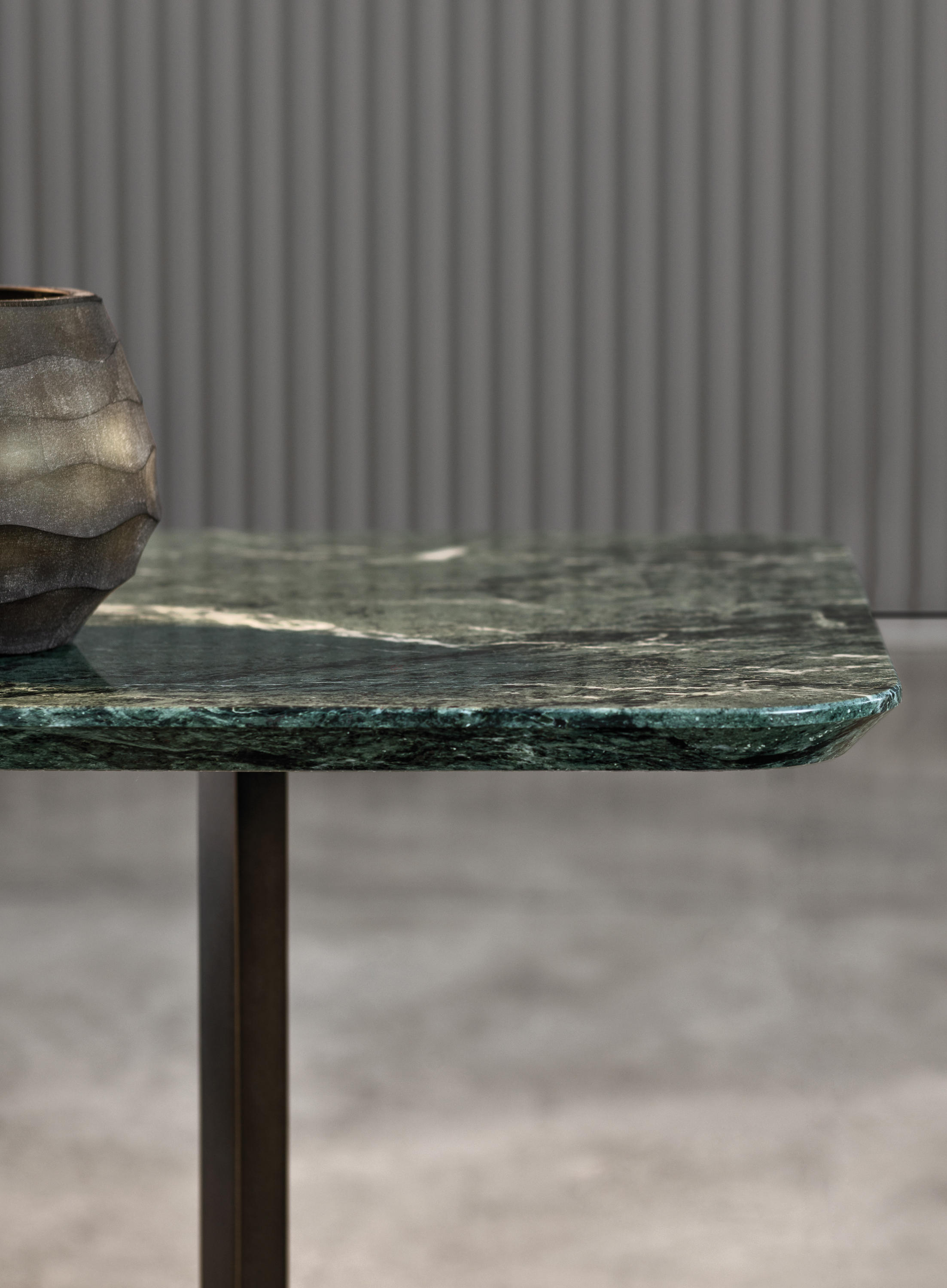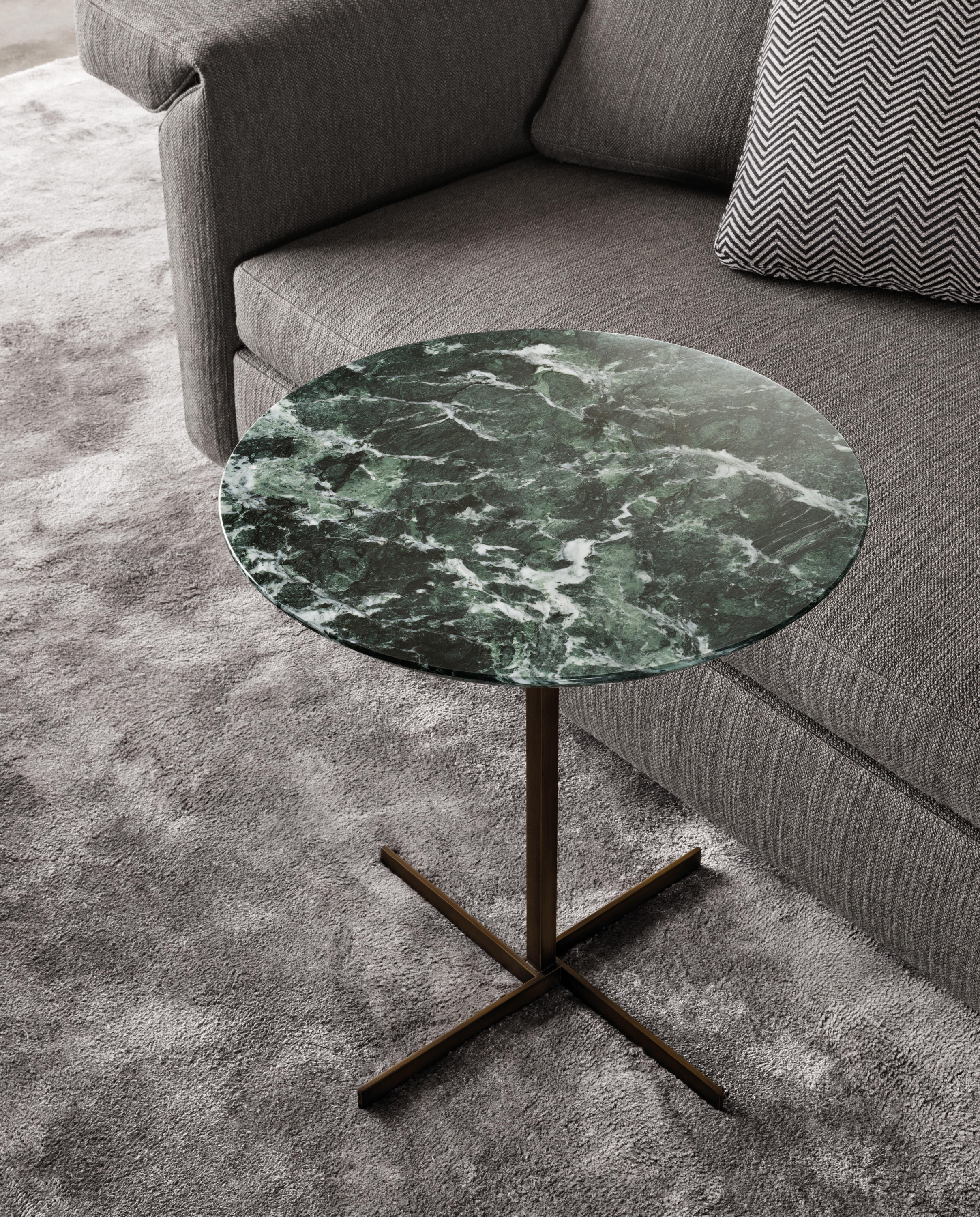 这一系列的产品用简洁的造型来搭配珍贵的材质,比如带有绿色调的Issogne大理石,台面采用斜切边缘的设计。地面支撑为金属材质,漆面为铜色,采用十字造型。Joy是一款可以搭配新系列中所有沙发座椅的边几,就造型而言,有高度为55厘米的圆形和高度为41厘米的正方形可供选择。