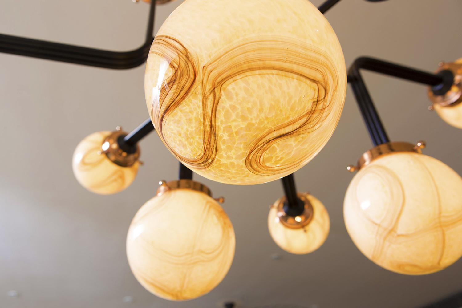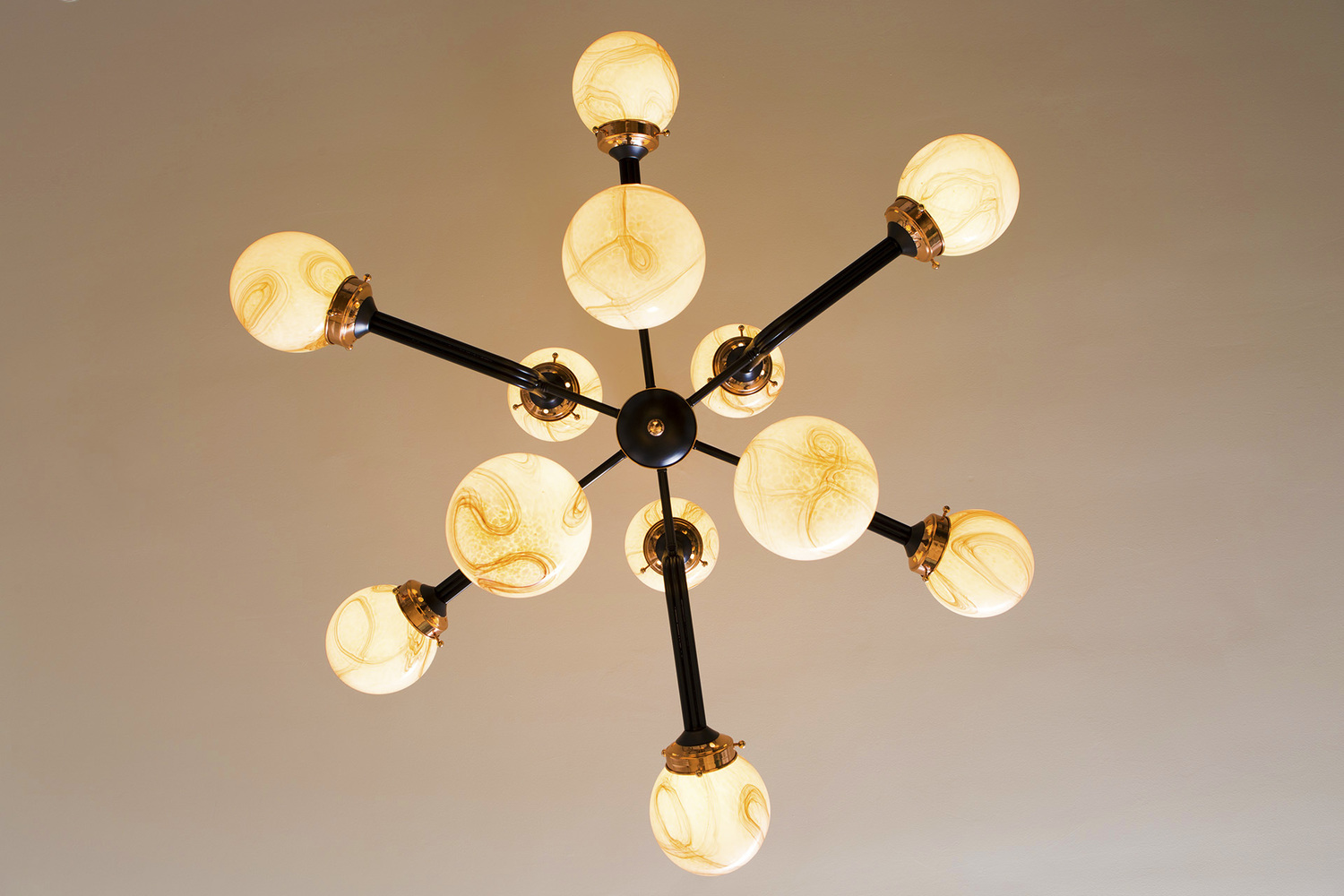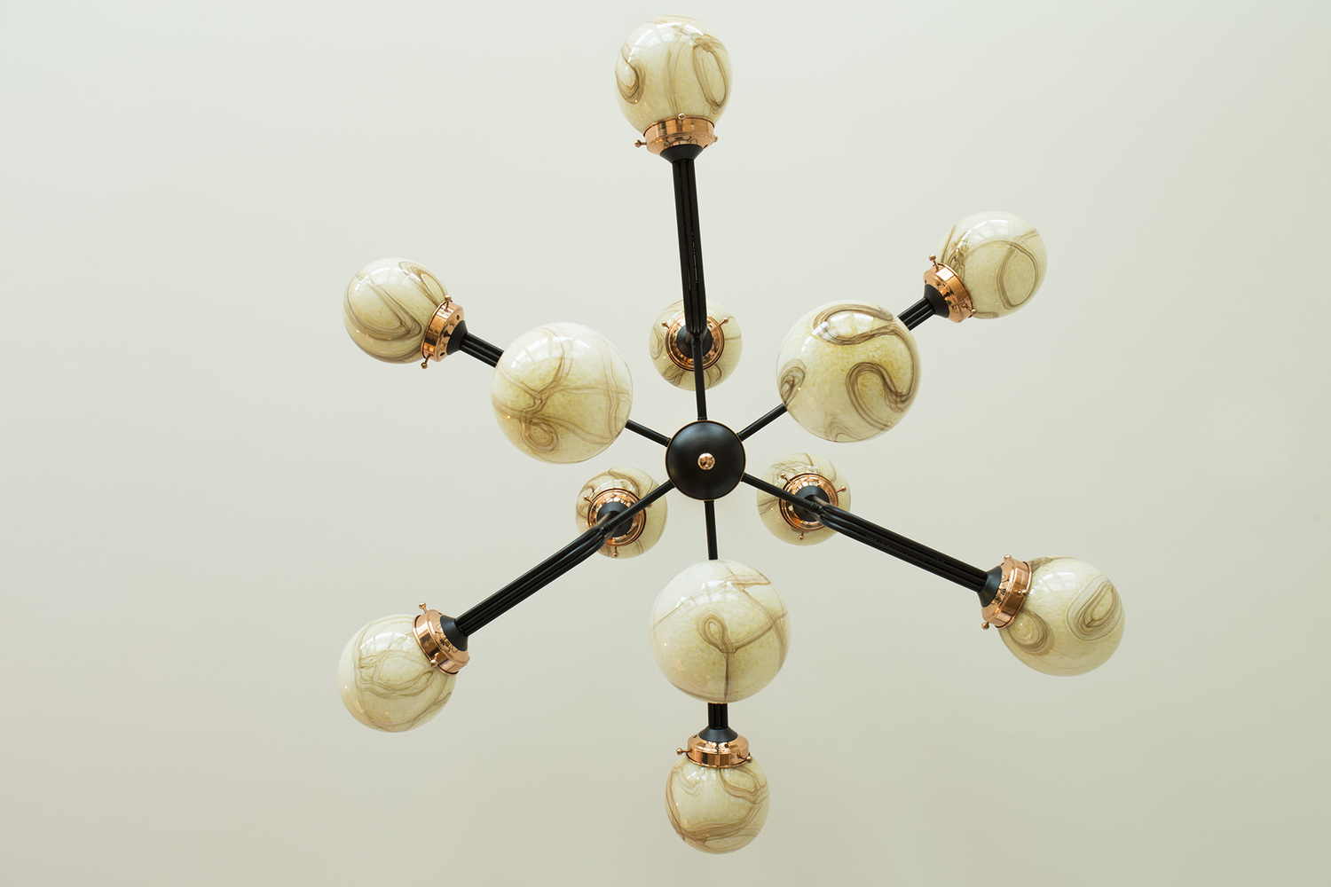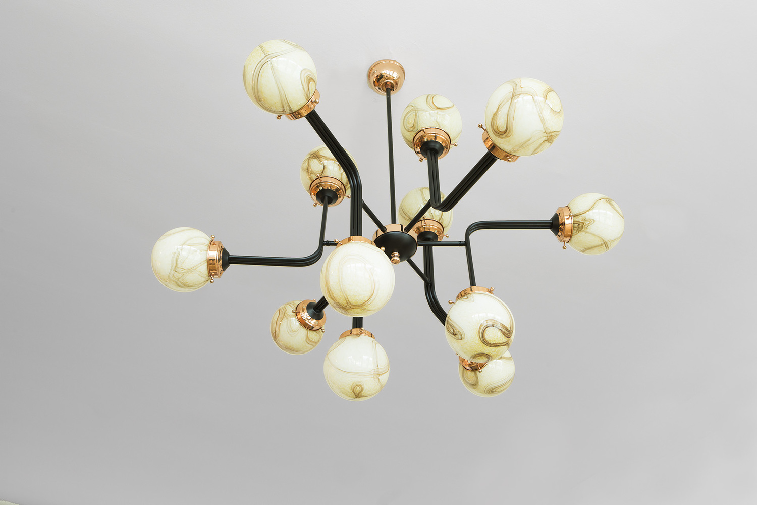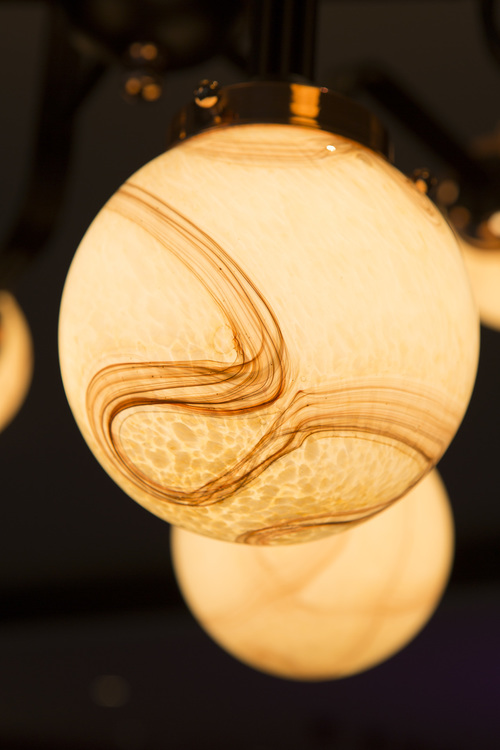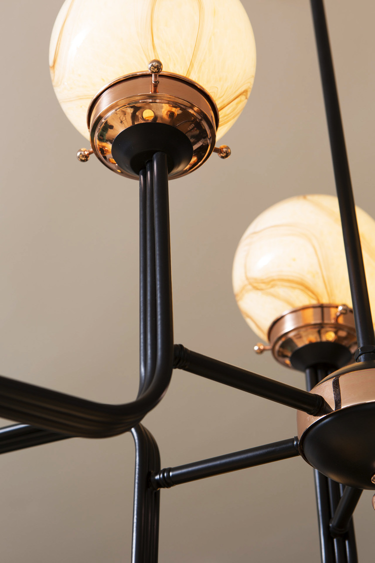 Ziron是一款完全手工制作的枝形吊灯,灵感来自古董手工制作的眼镜,不再生产。 每个手工吹制的玻璃穹顶都是独特的,具有不同的图案,但是以优雅的方式相互协调。 黑色涂漆的金属片弯曲并连接在一起,从而形成枝形吊灯的臂。 结合抛光铜,Ziron是一款现代吊灯,给人一种怀旧的感觉。