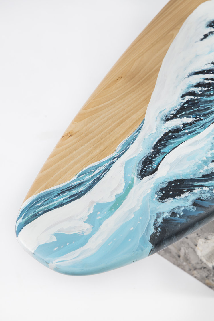 这条长凳的设计理念是:即使固定在固定的地方,也要不断移动。它结合了手工制作的石灰木和对比鲜明的大理石腿。座位是手绘的,让人想起神奈川的巨浪。