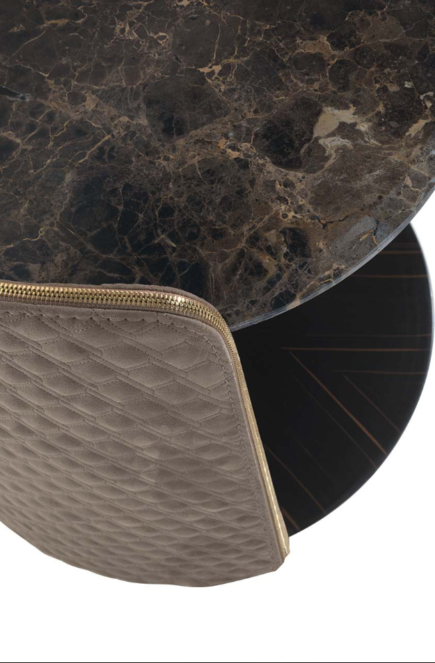 La combinazione della struttura in metallo ricoperto in materiale ricamato con il piano in marmo o in specchio, rende questi tavolini dalla forma arrotondata articoli di alto design.