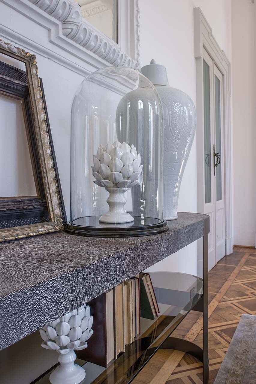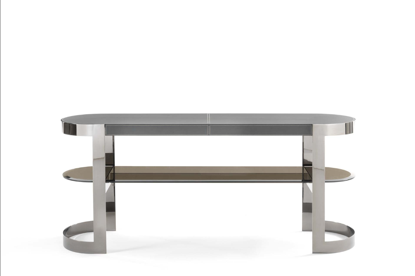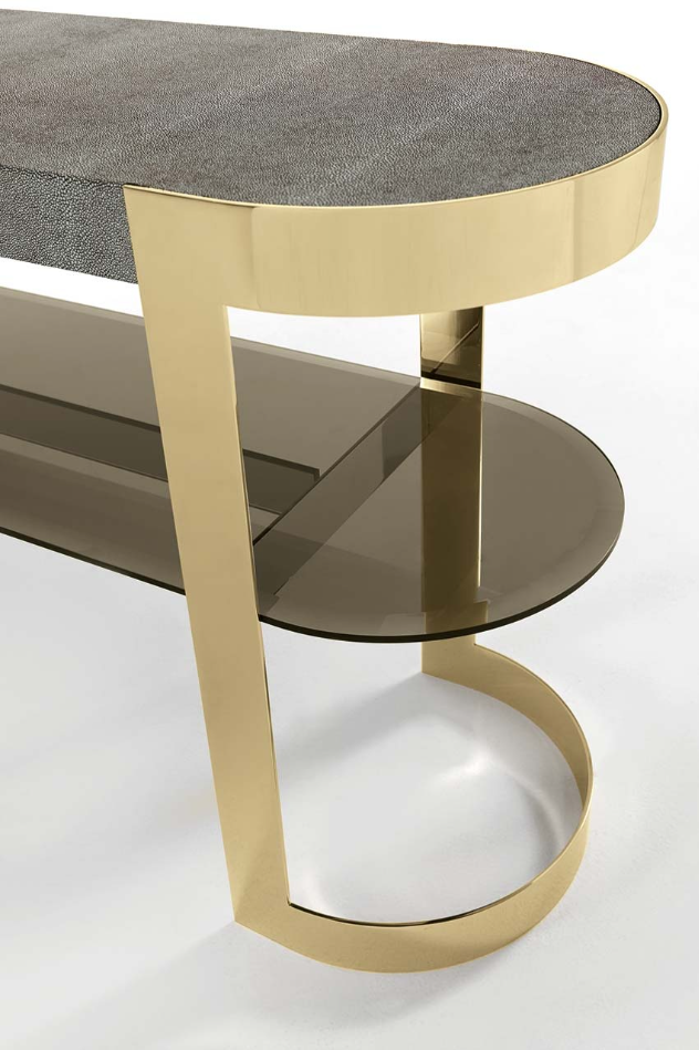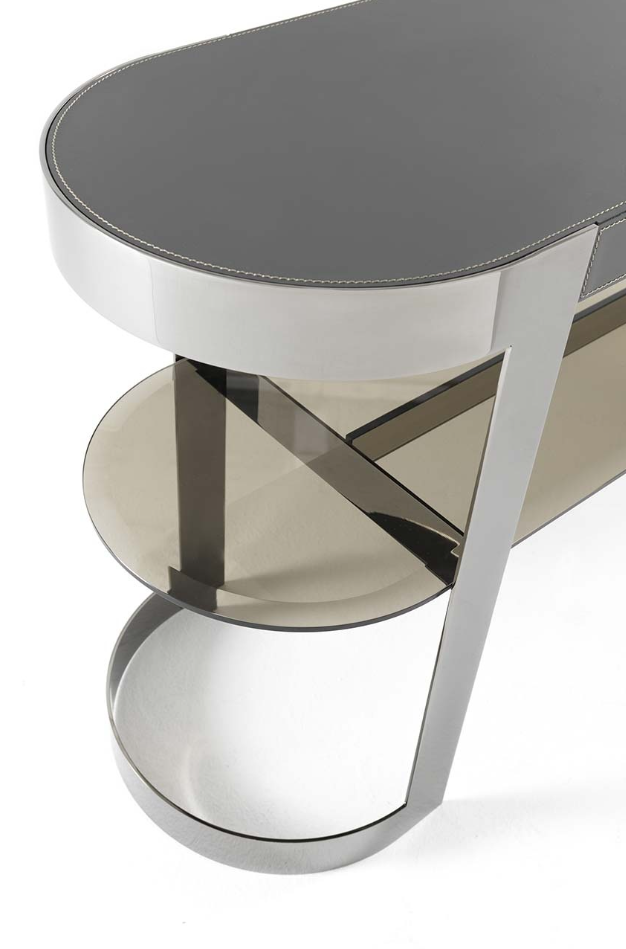 一种控制台,其基本轮廓将大理石或皮革与玻璃和金属相结合,以达到形式上的完美。