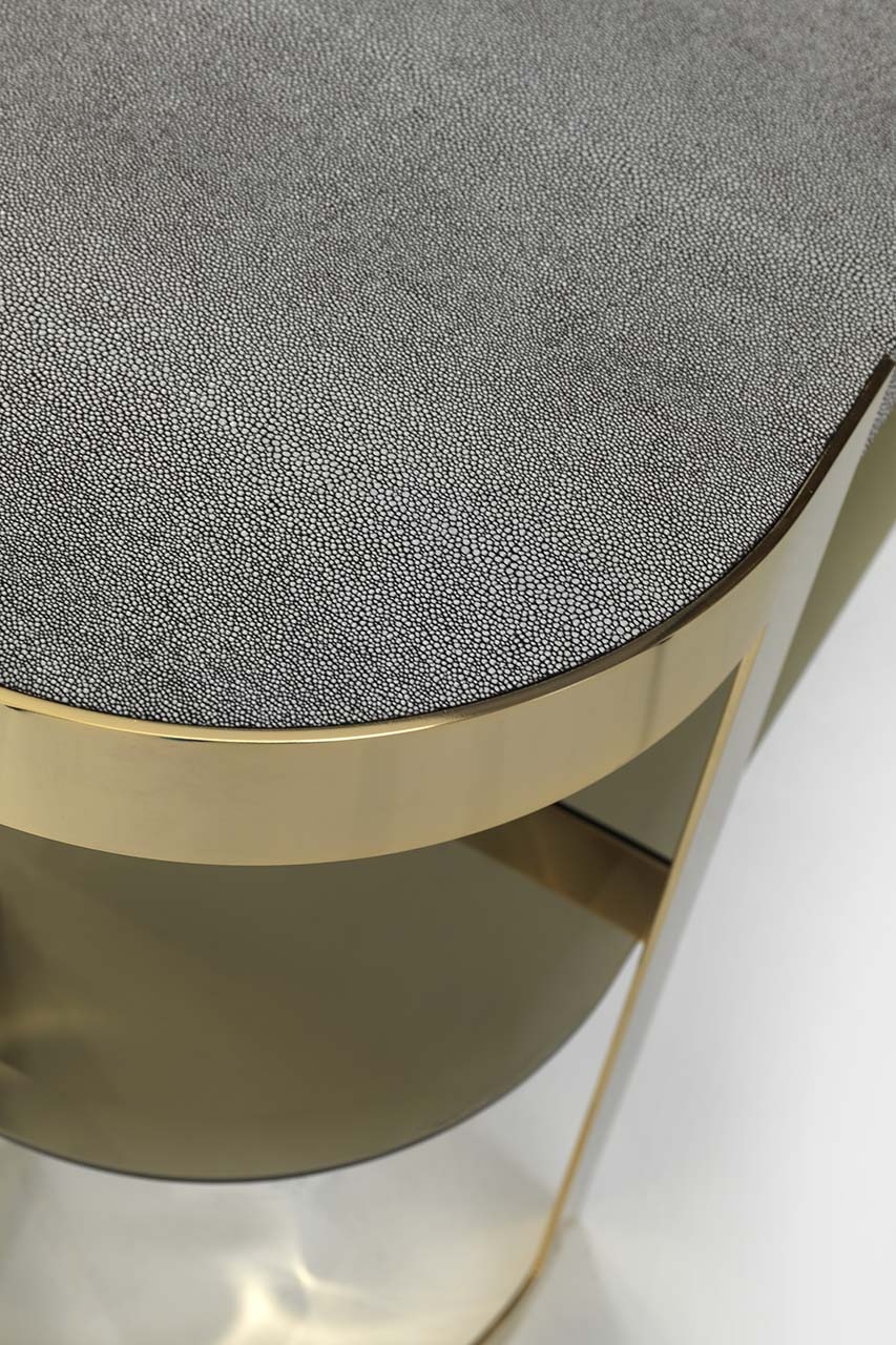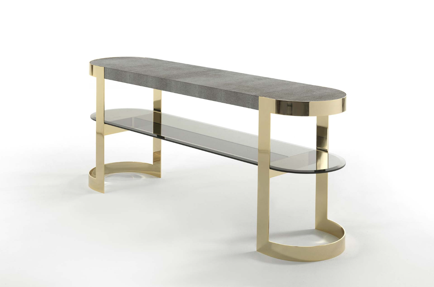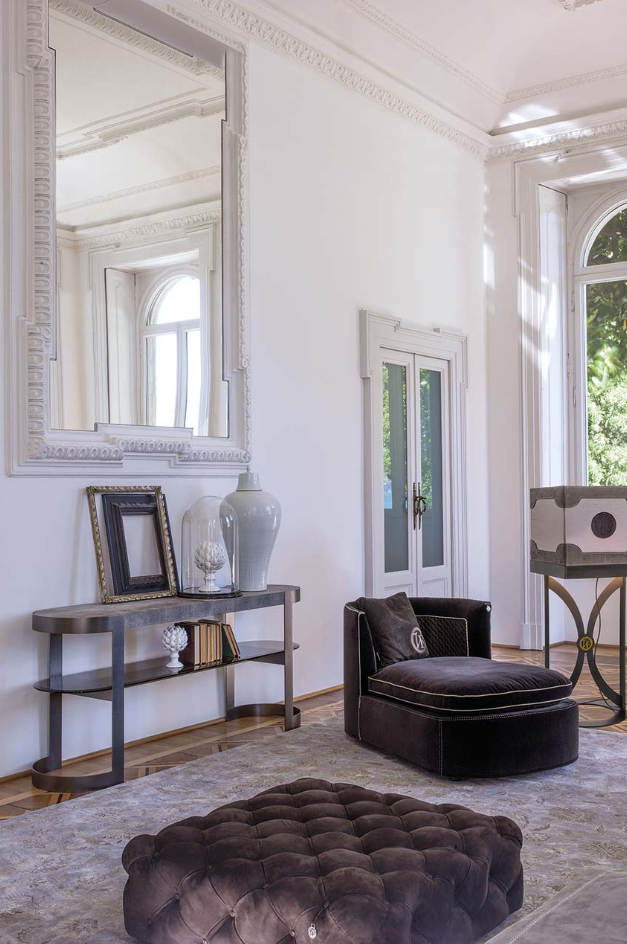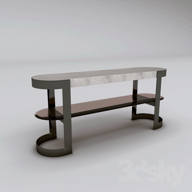 一种控制台,其基本轮廓将大理石或皮革与玻璃和金属相结合,以达到形式上的完美。