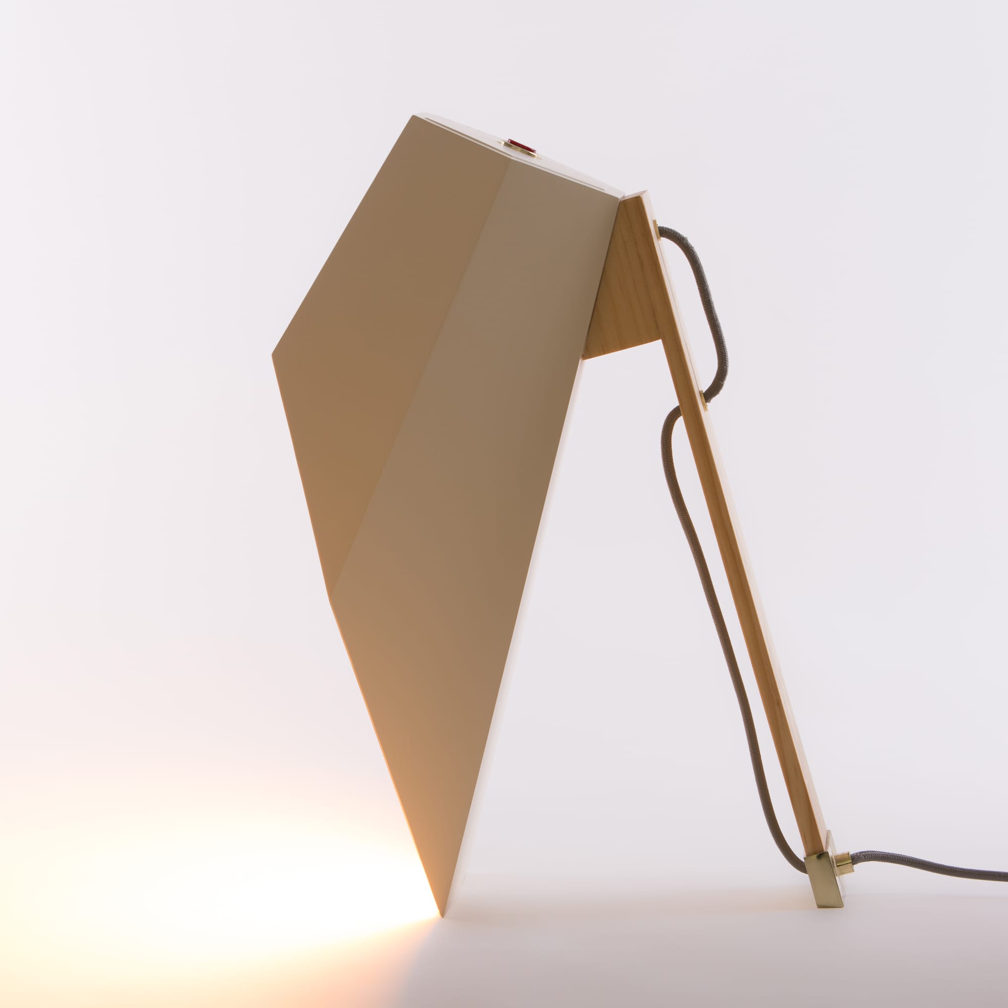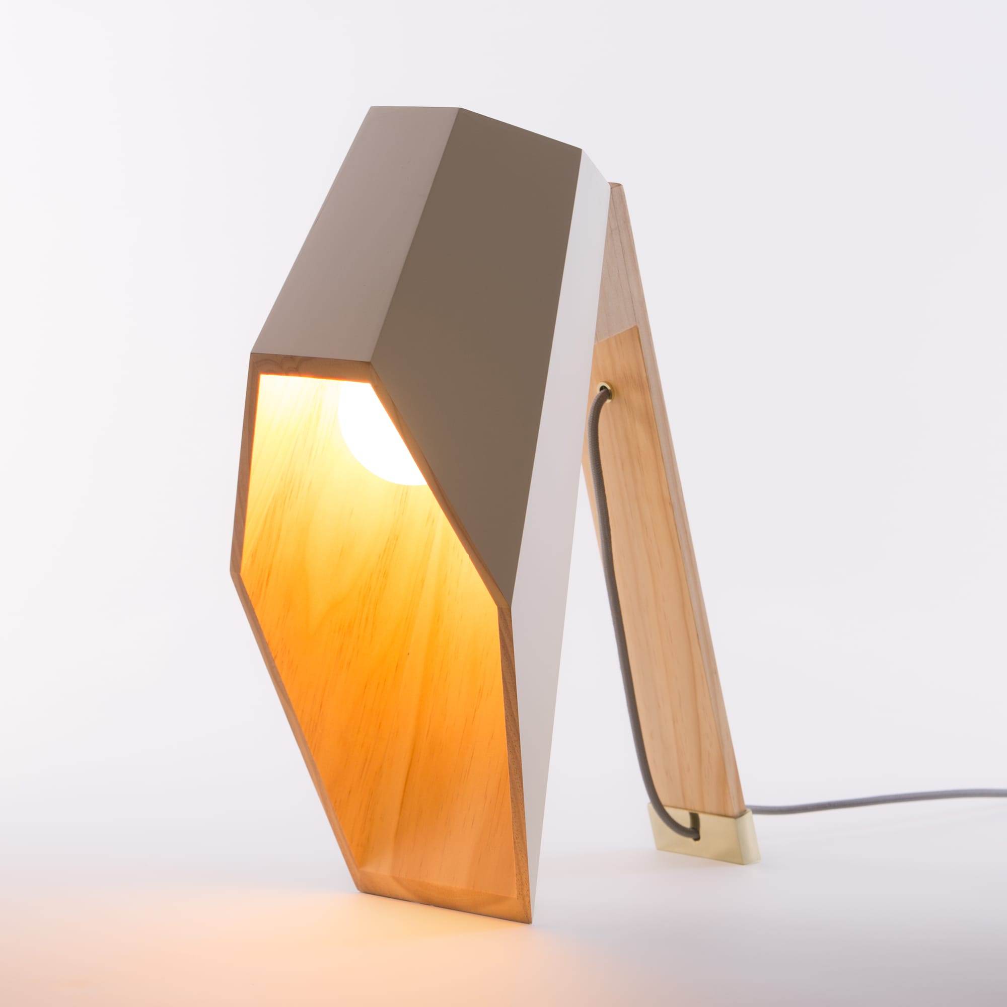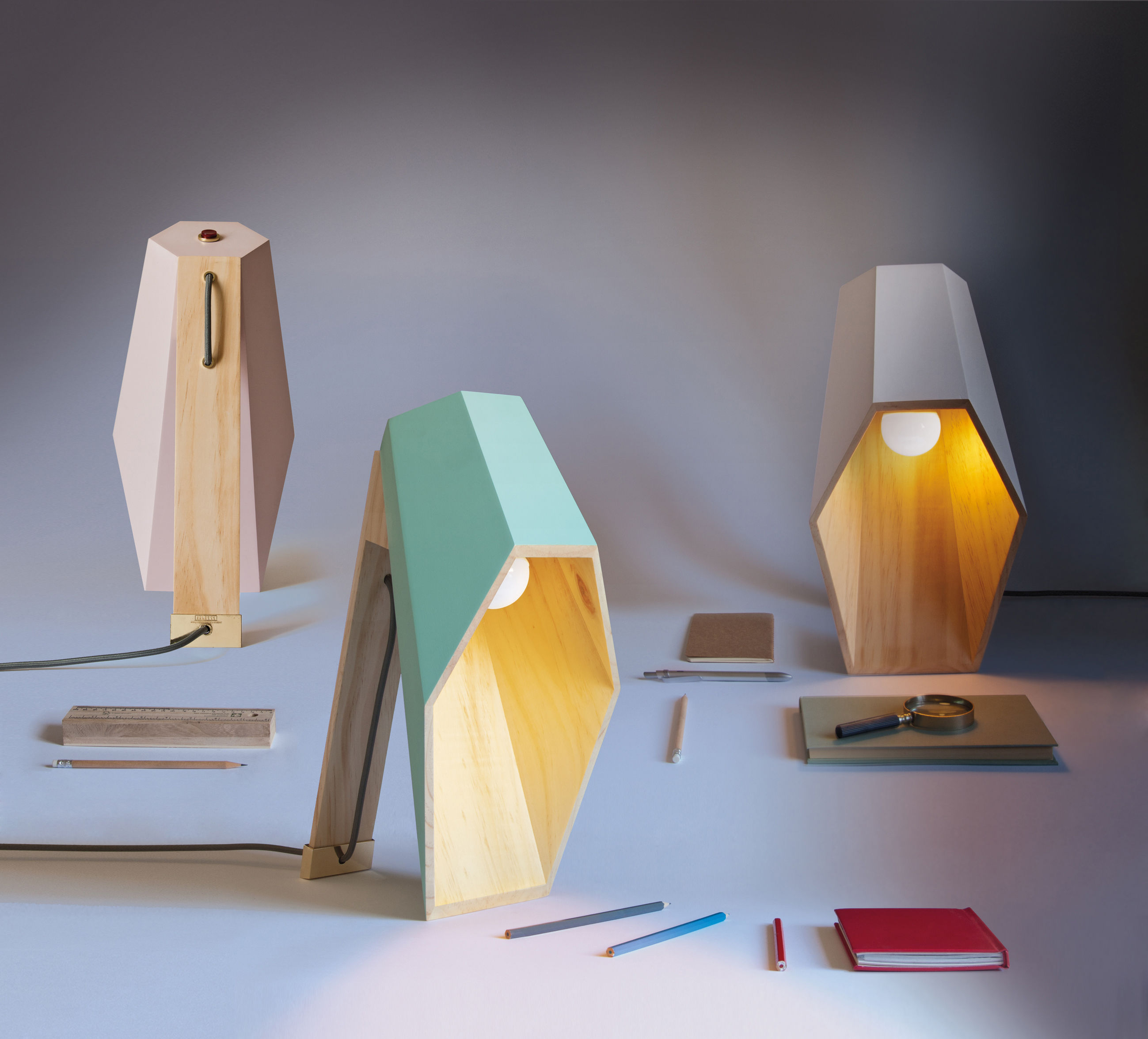 Woodspot是一盏台灯,灵感来自Rene Magritte的“光明帝国”。该设计由一个底座和一个类似引擎盖的透光器组成,它提供了一种让人想起路灯的聚光灯,就像马格里特世纪中叶的油画中所看到的那样。木制的底座是用松木手工制作的,用天然油完成。扩散器采用白色或粉彩粉红或绿色漆,可与高达60W的灯泡一起使用。