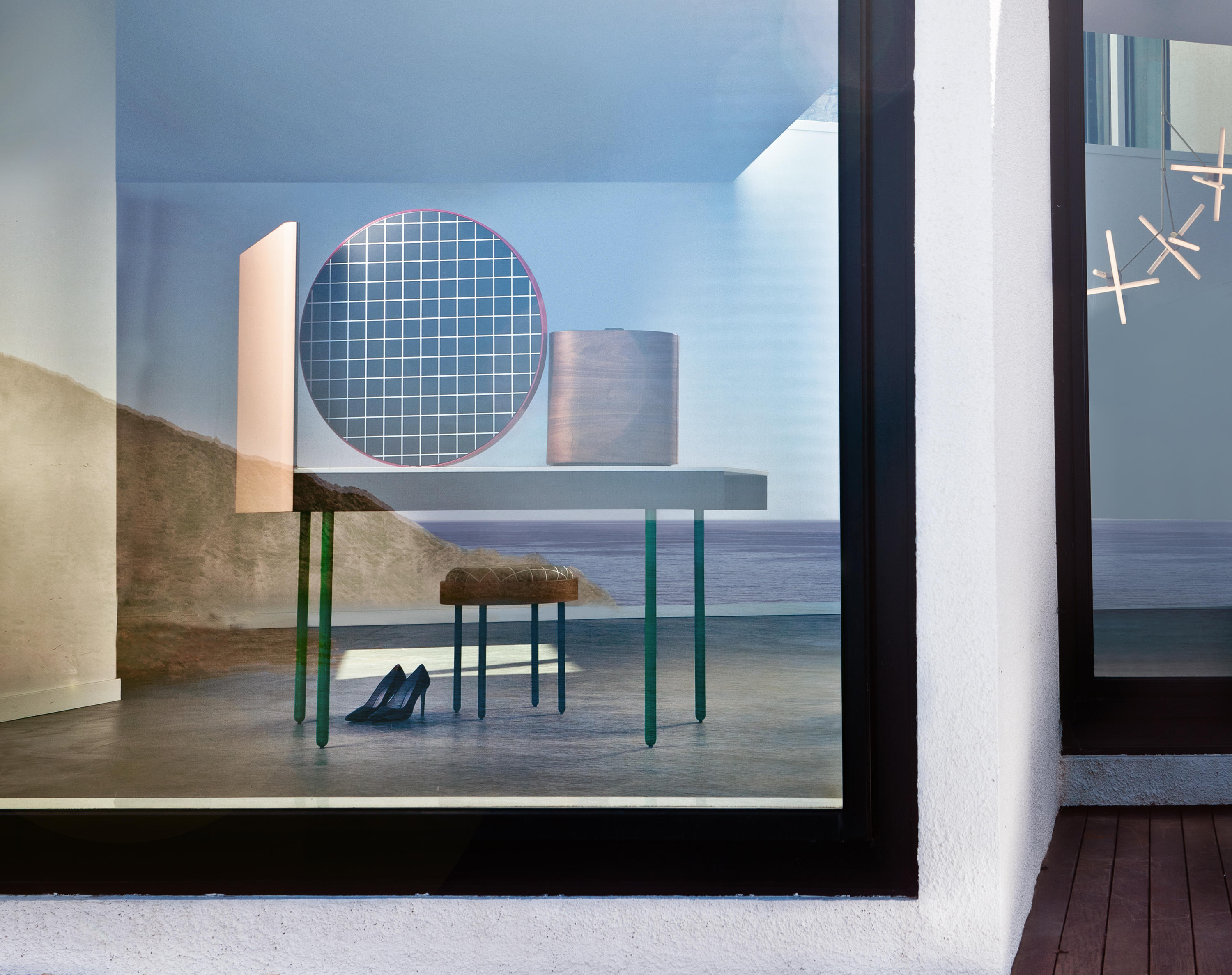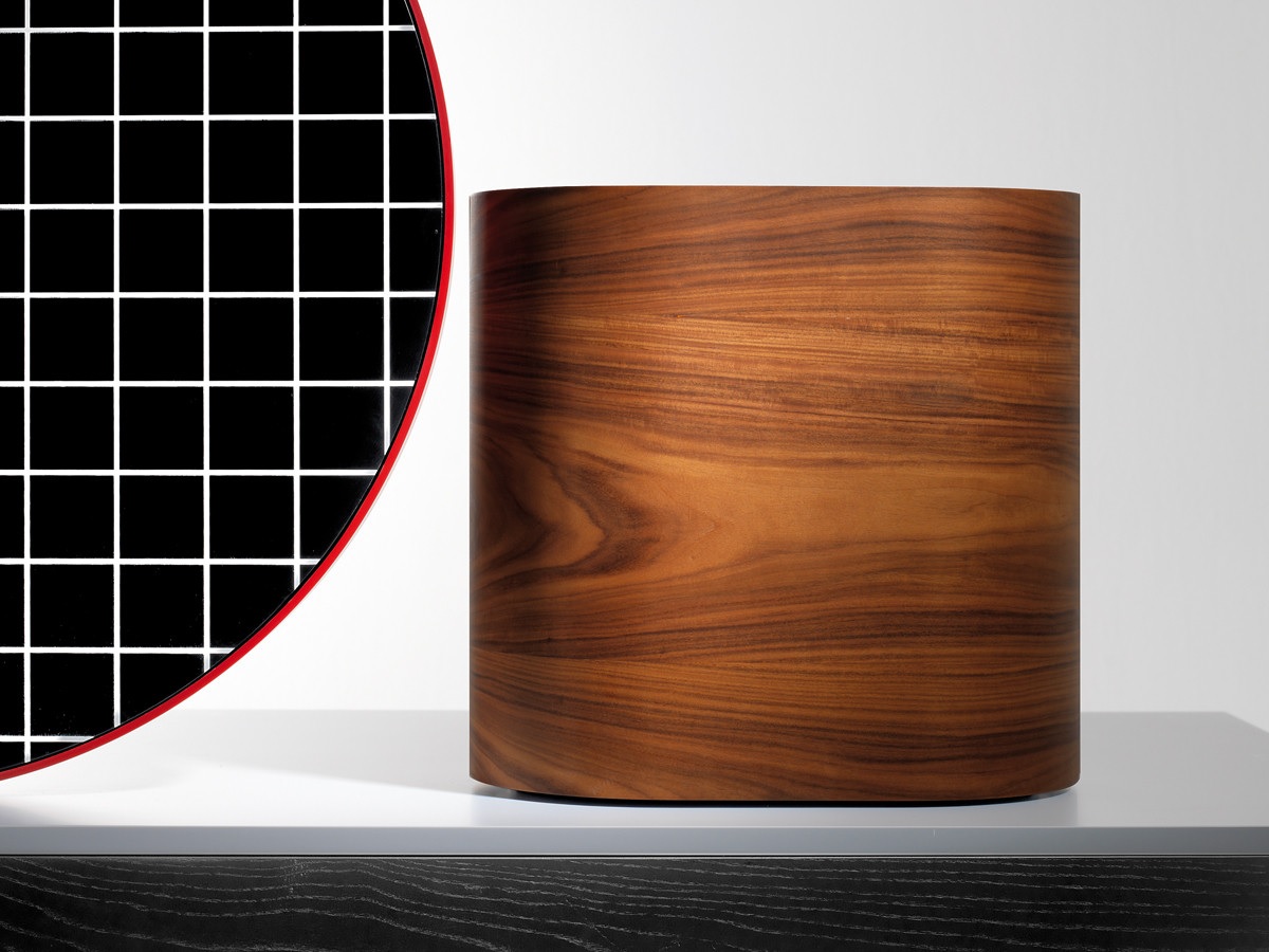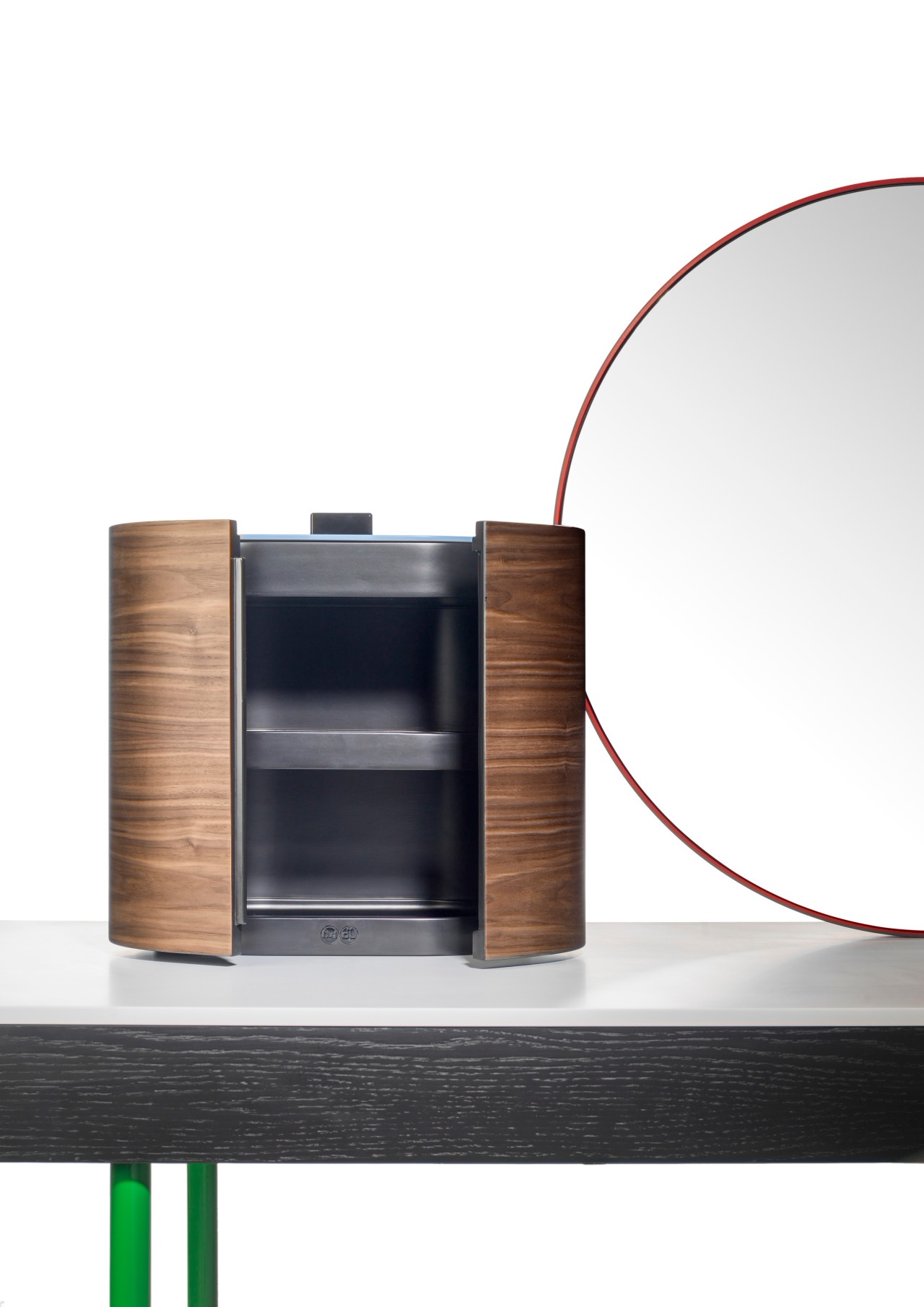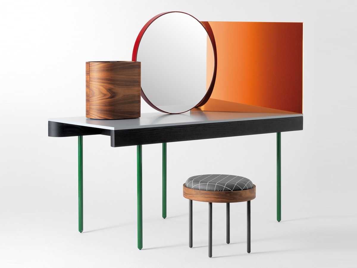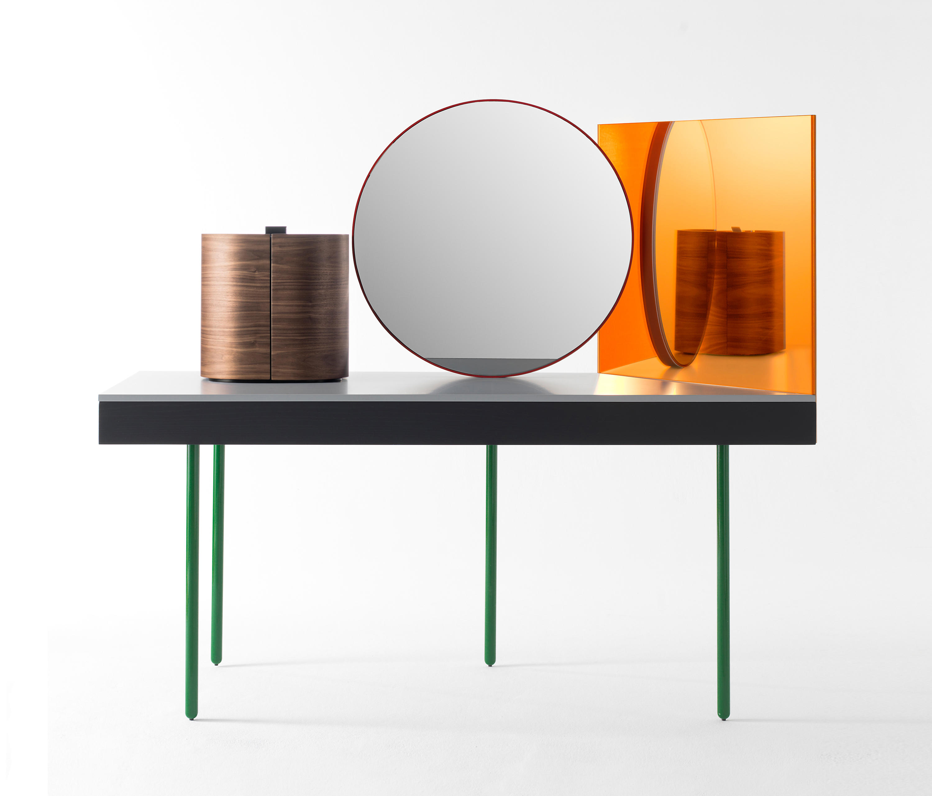 CHANDLO-实心灰烬结构,黑色磨砂。桌腿为管状钢,涂有亮绿色。实心,紧凑的桌面(混合了天然矿物和聚合物)为浅灰色。中央正面镜,由钢架组成,涂有红色。镜子的背面是黑色的MDF,表面涂有鲜艳的白色图案。侧镜具有过滤后的玫瑰色。珠宝盒胶合板(玫瑰木)
