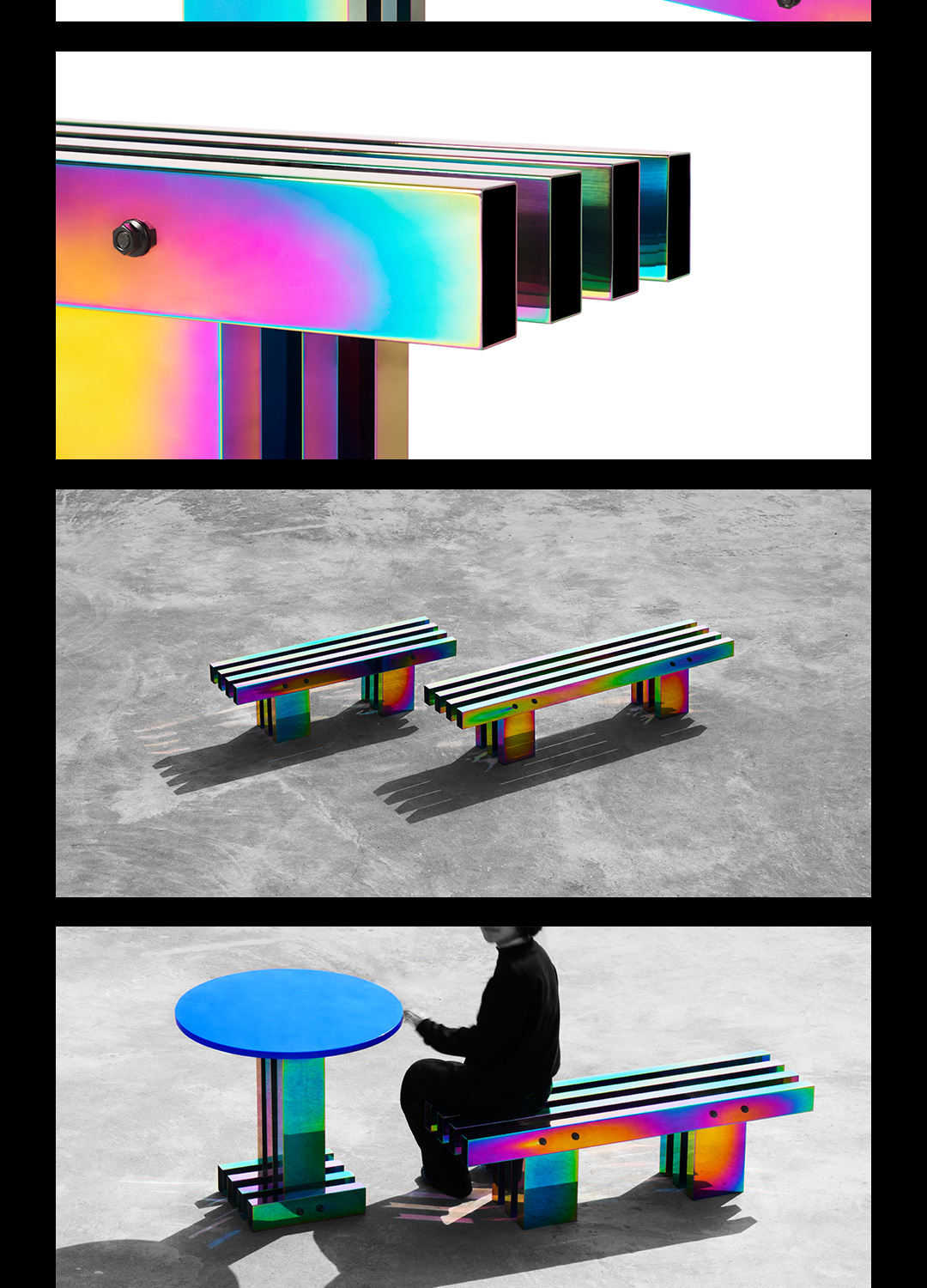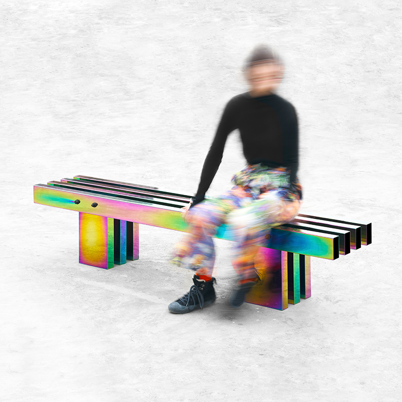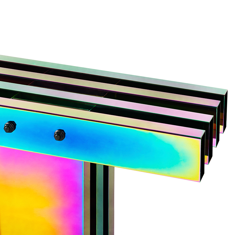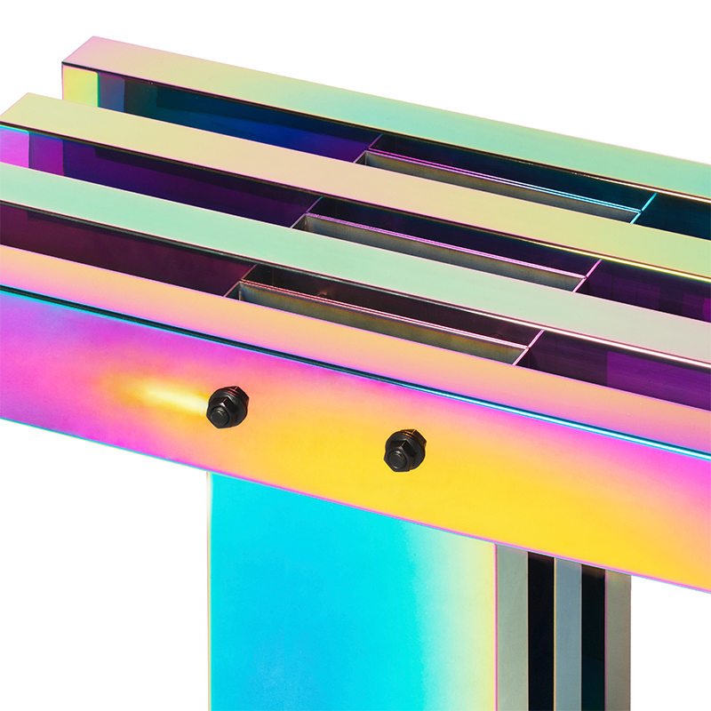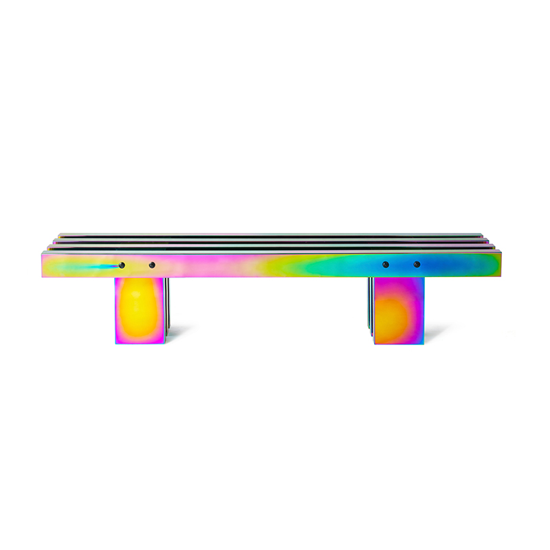 剧烈迷幻至热至冷的撞色,不遗漏任一可见光的波段,色相在连续折面上像热象图解析呈现。 镜面反射,形体纵横正立间增加色相交叠变化,与环境投射的光或影相互如实反馈。